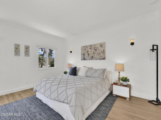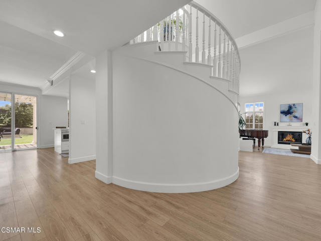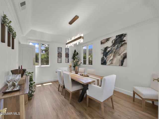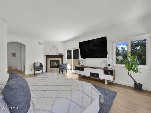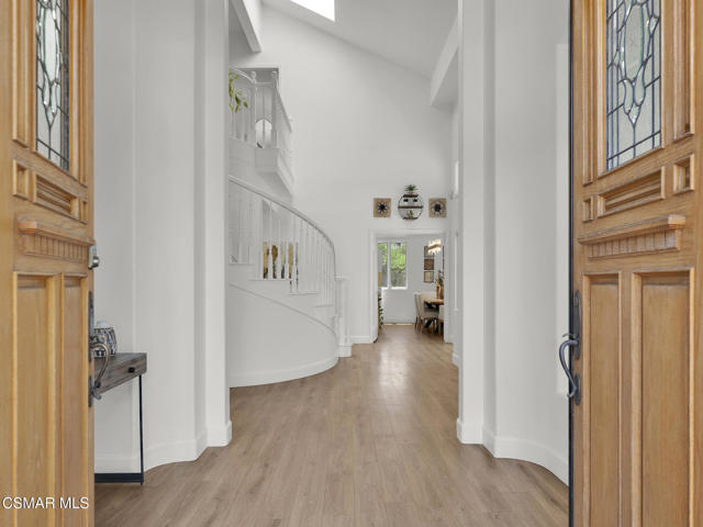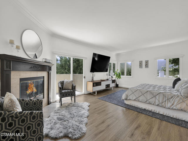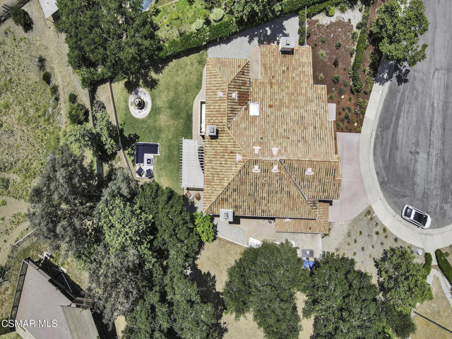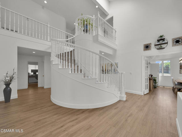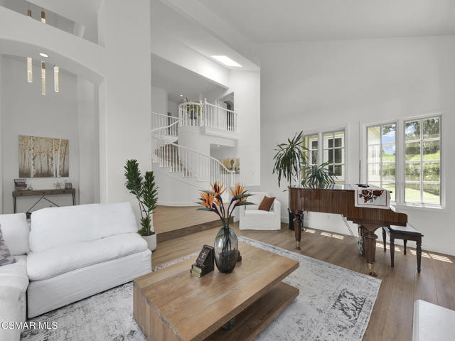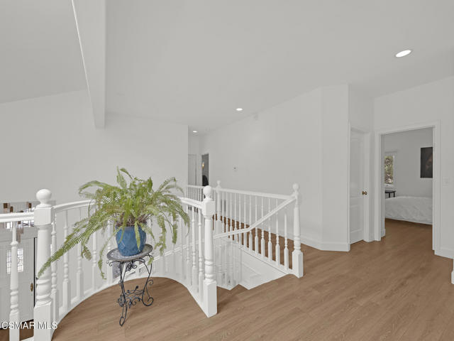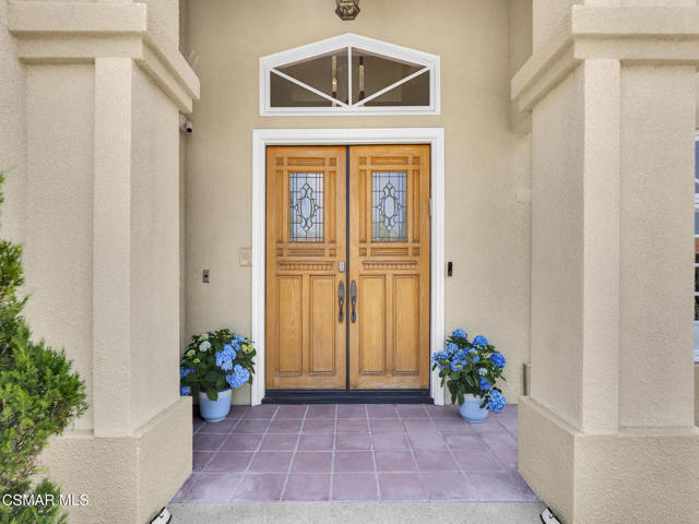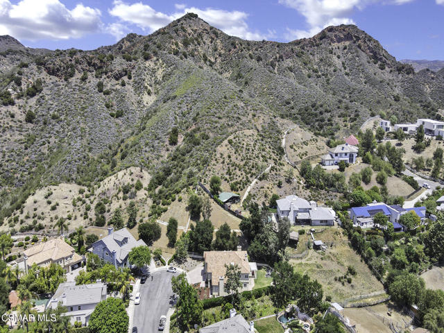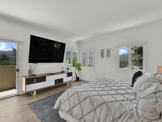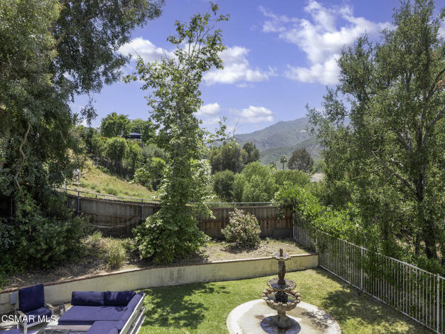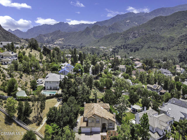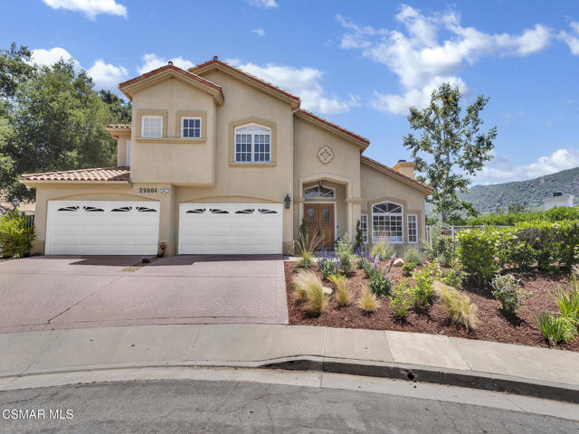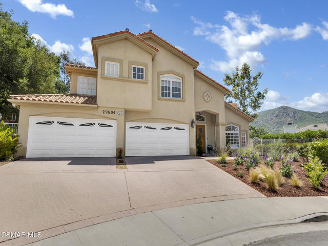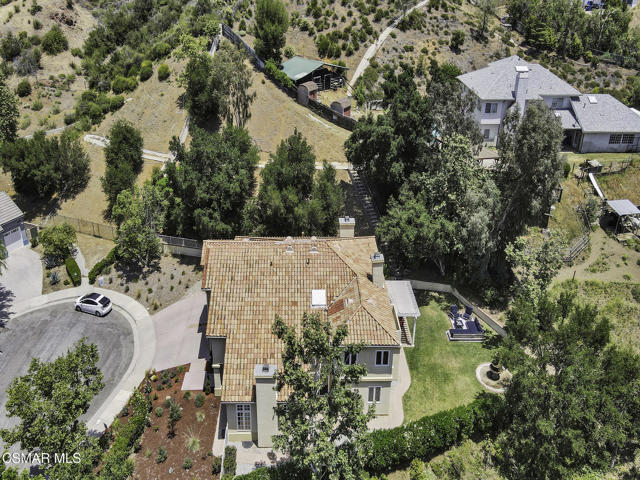 Tucked away at the top of a cul-de-sac, this home blends Southern California living with a relaxed Mediterranean style, with a clay tile roof and stucco exterior. Drought tolerant landscaping is framed by mature trees and the surrounding Santa Monica Mountains create a dramatic vista from every room. The double-door entry features multiple recessed panel detail and upper leaded glass inset panes. The light-filled dramatic foyer features a skylight over the elegant curved staircase, leading to the landing with beautiful views.. The entire home is finished with Cortona Waterproof Luxury Flooring in a gorgeous neutral shade called Pottery Wheel. Plentiful windows, high ceilings, and a raised hearth fireplace are featured in the step-down living room. The quiet and elegant dining room is just off the living room and accessible through a convenient swing door to the kitchen. The recently remodeled kitchen is finished with crisp white shaker cabinets, white quartz slab counters with grey veins, and stainless appliances. Open to the kitchen is a lovely breakfast area overlooking the back yard, and family room that features a convenient bar area with a beverage refrigerator and microwave.The spacious primary bedroom is at the top of the elegant, curved staircase with windows that fill this space with light, and take advantage of the stunning Santa Monica Mountain views. The light filled bathroom is finished with neutral stone slab and tile, with a large separate steam shower and deep soaking tub. A long vanity with separate sinks and lower cabinets are separated by a vanity topped by three large decorative mirrors and sconces. There are four secondary en-suite bedrooms, one downstairs, and the other three privately situated upstairs. One of the upstairs bedrooms has been converted into a home theater with raised seating. The backyard features raised planter beds with mature trees, covered patio, and a three-tiered fountain. The 4-car garage has been converted to a music studio with sound dampening and carpeting.This unique location is in an historic area of Agoura known as Cornell. Cornell is a unique, picturesque neighborhood of homes along the scenic Mulholland Highway Corridor, and in the rural mountain area near Malibou Lake. It is largely surrounded by open space parks within the NPS Santa Monica Mountains National Recreation Area, including Paramount Ranch and Peter Strauss Ranch parks. In addition to the local historic restaurant and winery, The Old Place/Cornell Winery, this area is notable for its 'tall trees' atmosphere among old-growth oak and pine, and for the many peacocks that roam the neighborhoods, and perch on residents' rooftops and balconies. With direct access via Kanan Road to Malibu, this area is a short drive to Point Dume and other Malibu beaches.Interested in this Listing?