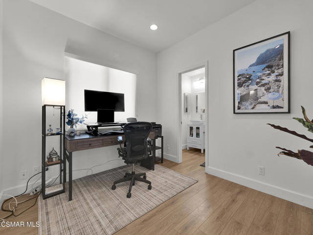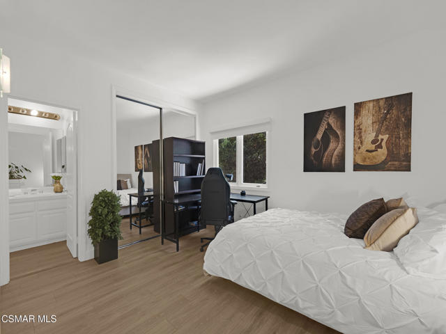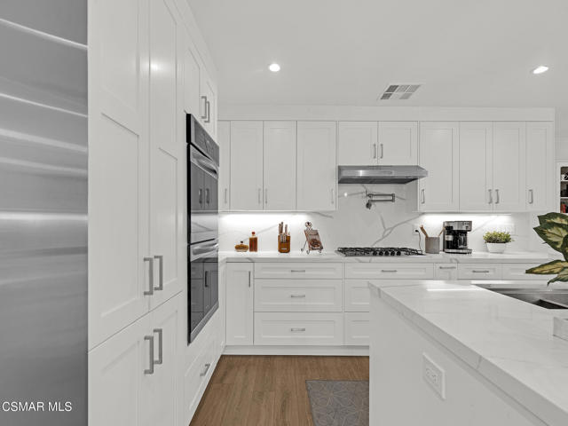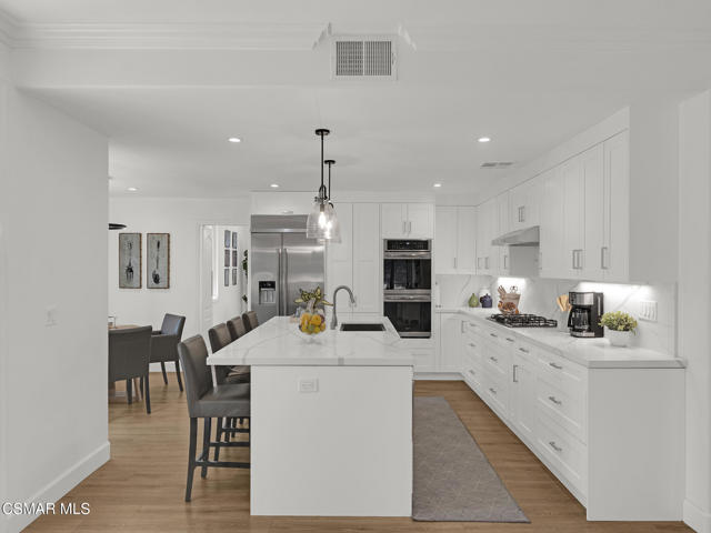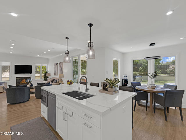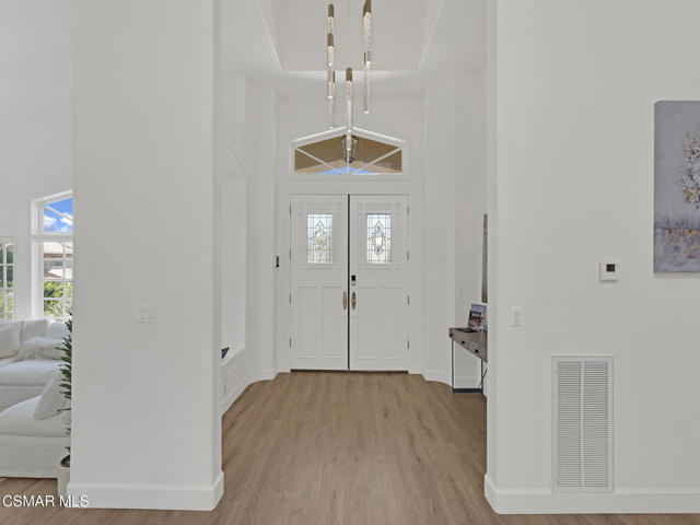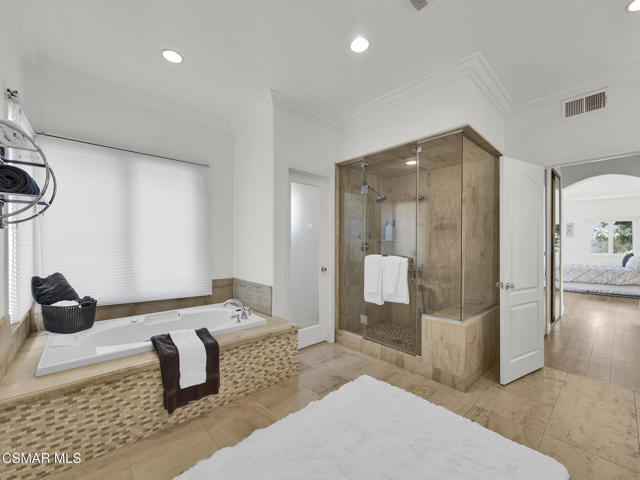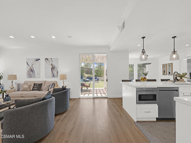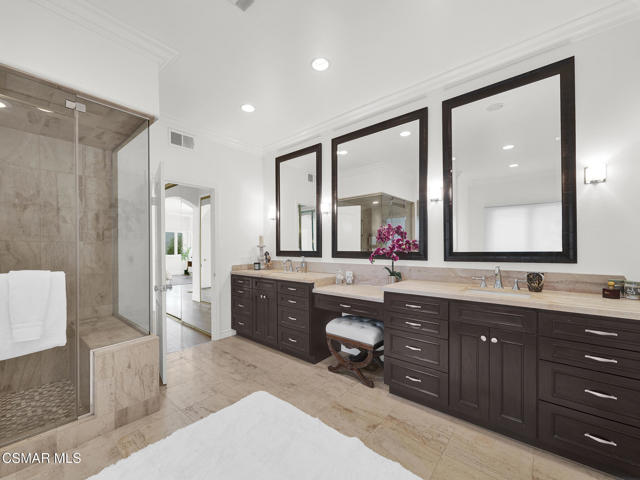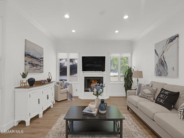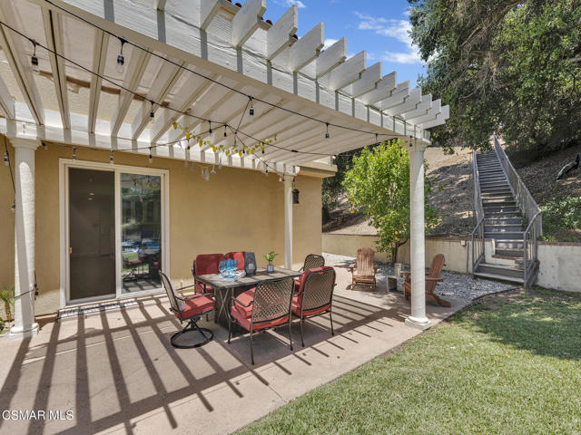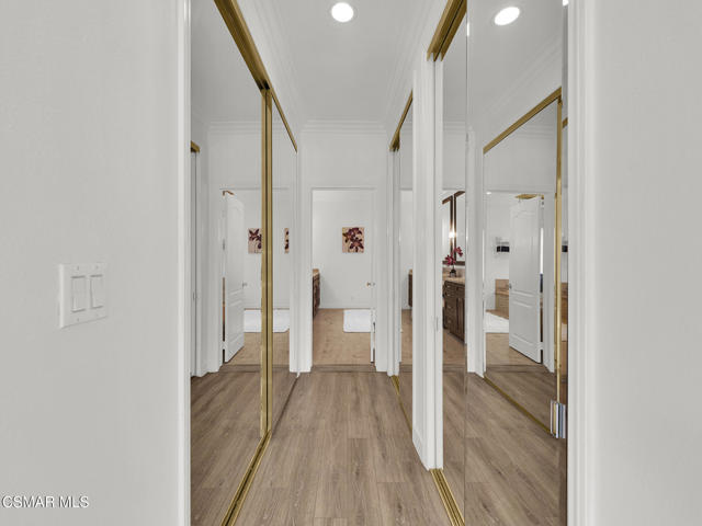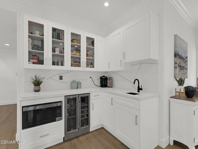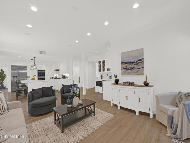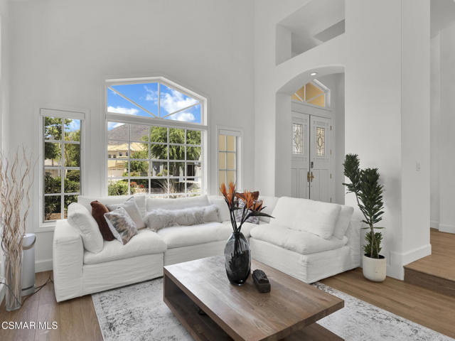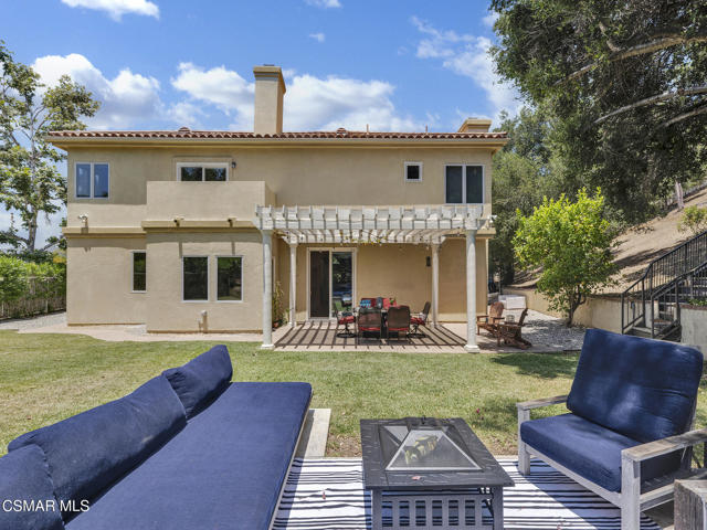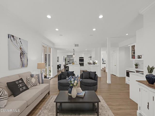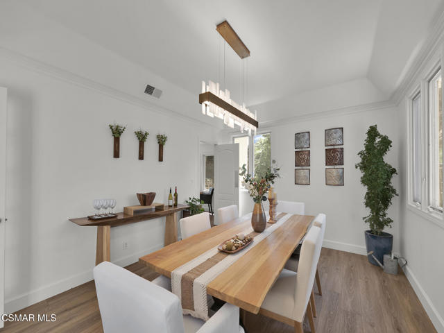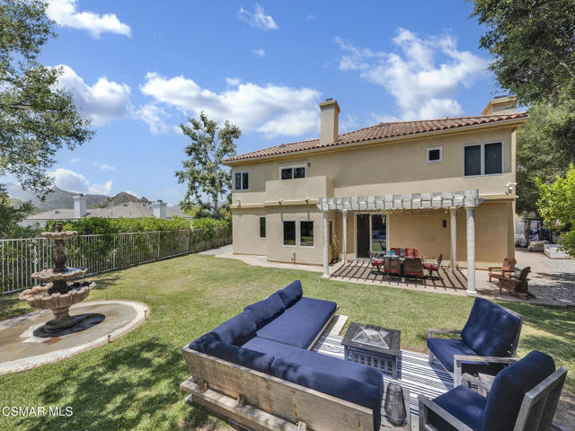 Tucked away at the top of a cul-de-sac, this home blends Southern California living with a relaxed Mediterranean style, with a clay tile roof and stucco exterior. Drought tolerant landscaping is framed by mature trees and the surrounding Santa Monica Mountains create a dramatic vista from every room. The double-door entry features multiple recessed panel detail and upper leaded glass inset panes. The light-filled dramatic foyer features a skylight over the elegant curved staircase, leading to the landing with beautiful views.. The entire home is finished with Cortona Waterproof Luxury Flooring in a gorgeous neutral shade called Pottery Wheel. Plentiful windows, high ceilings, and a raised hearth fireplace are featured in the step-down living room. The quiet and elegant dining room is just off the living room and accessible through a convenient swing door to the kitchen. The recently remodeled kitchen is finished with crisp white shaker cabinets, white quartz slab counters with grey veins, and stainless appliances. Open to the kitchen is a lovely breakfast area overlooking the back yard, and family room that features a convenient bar area with a beverage refrigerator and microwave.The spacious primary bedroom is at the top of the elegant, curved staircase with windows that fill this space with light, and take advantage of the stunning Santa Monica Mountain views. The light filled bathroom is finished with neutral stone slab and tile, with a large separate steam shower and deep soaking tub. A long vanity with separate sinks and lower cabinets are separated by a vanity topped by three large decorative mirrors and sconces. There are four secondary en-suite bedrooms, one downstairs, and the other three privately situated upstairs. One of the upstairs bedrooms has been converted into a home theater with raised seating. The backyard features raised planter beds with mature trees, covered patio, and a three-tiered fountain. The 4-car garage has been converted to a music studio with sound dampening and carpeting.This unique location is in an historic area of Agoura known as Cornell. Cornell is a unique, picturesque neighborhood of homes along the scenic Mulholland Highway Corridor, and in the rural mountain area near Malibou Lake. It is largely surrounded by open space parks within the NPS Santa Monica Mountains National Recreation Area, including Paramount Ranch and Peter Strauss Ranch parks. In addition to the local historic restaurant and winery, The Old Place/Cornell Winery, this area is notable for its 'tall trees' atmosphere among old-growth oak and pine, and for the many peacocks that roam the neighborhoods, and perch on residents' rooftops and balconies. With direct access via Kanan Road to Malibu, this area is a short drive to Point Dume and other Malibu beaches.Interested in this Listing?