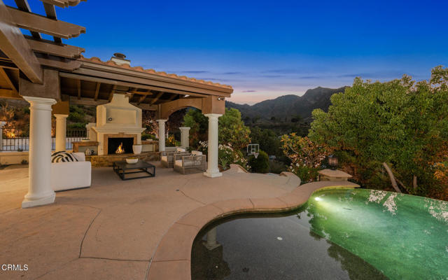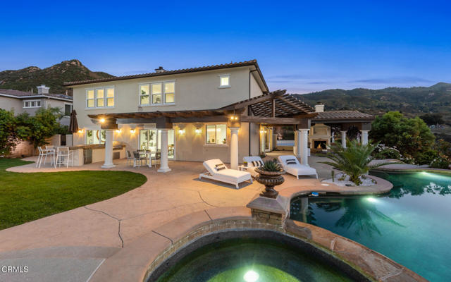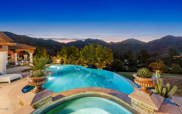 Welcome to 1909 Hazel Nut Court, available fully furnished and turn-key. Nestled at the end of a quiet cul-de-sac in Agoura Hills, this 5 bedroom, 6 bathroom Mediterranean estate is the ultimate luxury escape. Enter into the main level with an open and brightly lit floor plan with stone floors and high ceilings. The living room is accented by a fireplace and arched windows, serving as the perfect place to welcome guests. The formal dining room flows seamlessly into the kitchen, complete with a top-tier Liebherr French door refrigerator, 8-burner gas range, and a built-in multi-temperature wine fridge. The family room leads to an expansive outdoor oasis, graced by an infinity pool with breathtaking mountain views. Descend a few steps to discover a private basketball court, equipped with top-of-the-line lighting, offering endless hours of play and recreation. There is a bedroom with an en-suite bathroom on the first floor of the property. Venture upstairs to encounter a spacious landing bathed in natural light. The primary suite is a private sanctuary, and features a spa-like en-suite bath with a soaking tub, walk-in closet, and panoramic views. There are three additional bedrooms each with their own en-suite bathrooms. The backyard is an entertainer's paradise with a plethora of amenities and grassy yard space. Adjacent to the infinity pool and spa, an outdoor kitchen, gazebo and pergolas beckon for al-fresco dining while watching a beautiful California sunset. Additional features include gated parking for up to 12 cars, central dual-zone AC and heating, and a cutting-edge smart home system affording control over security, music, and lighting. This stunning property is just moments away from shopping, dining, and Malibu.Interested in this Listing?