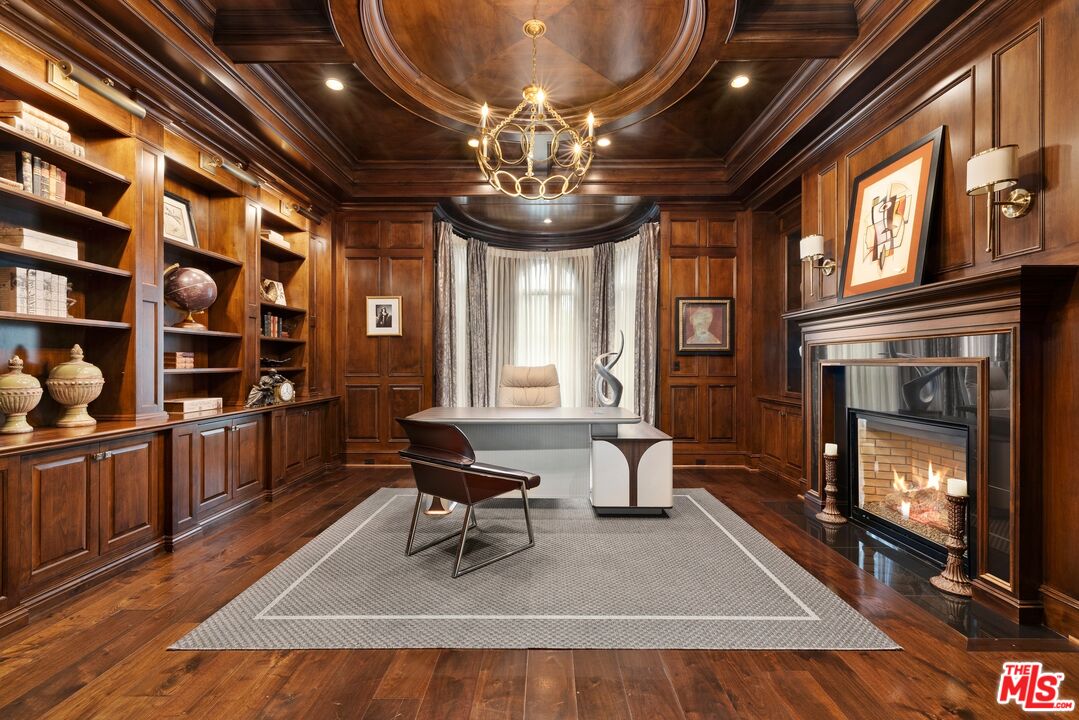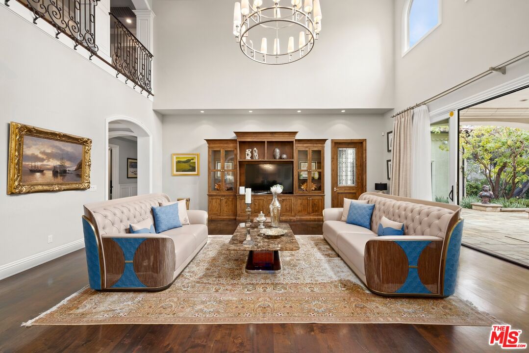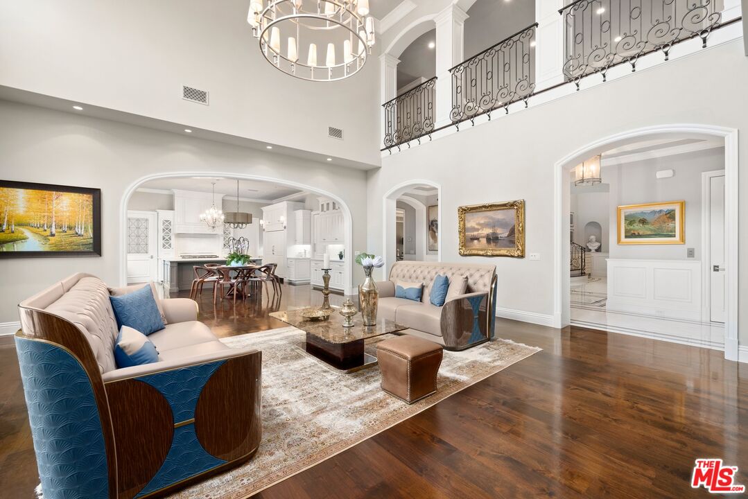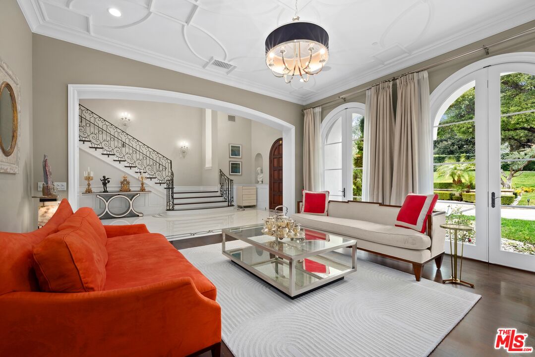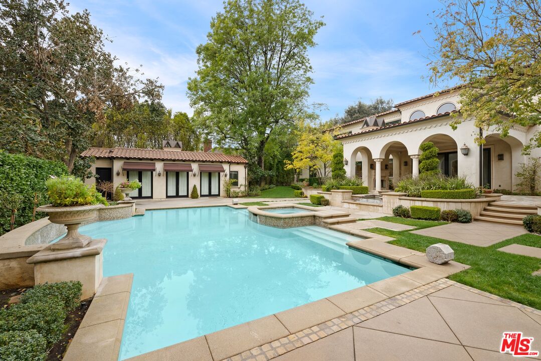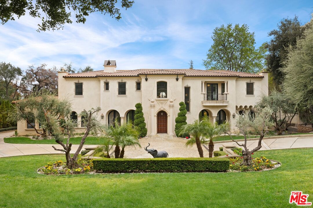 Set back from the street on three-quarters of an acre of carefully manicured grounds, a masterfully crafted Italian Renaissance marvel promises a life of luxury and elegance in this coveted Upper Rancho neighborhood. True to its name, Fallen Leaf Road is home to a variety of mature towering trees, creating a shaded paradise that is both enchanting and peaceful. This Robert Tong-designed estate, custom-built by Mur-Sol Construction, epitomizes European architecture with its facade a celebration of classical influence and style, from romantic archways and Corinthian columns to ornate wrought-iron finishes. Inside, discover custom millwork, intricate crown molding, wainscoting, rich wood floors, and beautifully paneled walls throughout. A grand double-height foyer leads to the formal living room, highlighted by decorative built-ins and two sets of custom arched French doors opening to the outside. Nearby, the formal dining room continues the timeless style of this pristine residence. Designed for entertaining on a large scale, the gourmand's kitchen is a culinary masterpiece, appointed with chef-grade appliances including a Sub-Zero refrigerator and freezer, Wolf range, a separate wok kitchen, large island with warming drawer, eat-in breakfast area, and an abundance of cabinetry and counter prep space. The adjacent family room features lofty 22-foot ceilings and sliding glass to the backyard for seamless indoor-outdoor flow. Other important amenities include a wood-paneled library/study with fireplace, a cigar lounge with wine refrigerator, and a large theatre for screening award-winning films. Upstairs, the lavish resort-inspired primary suite includes a separate piano sitting room, two fireplaces, and a large luxurious spa-like bathroom with double glass-enclosed shower, dual-sink vanity, pedestal soaking tub, and two toilet rooms. Secondary bedrooms are spacious and light-filled, with Juliet balconies, en-suite baths, and natural light. A gym/yoga room is perfect for wellness, meditation, exercise, and dance. Outside, dine and entertain al-fresco in the outdoor living/dining room amidst a tasteful arrangement of plantings, reminiscent of spending an afternoon in Versailles. A serene pool and spa are accompanied by a pool house, complete with kitchenette with wine fridge plus a bathroom with shower, perfect for hosting guests, extending parties, and relaxing on warm summer days. There is also a sports court with basketball hoop and plenty of grassy lawns to roam and play. Welcome to this ideal location near parks, golf courses, schools, and the 210 Freeway, just moments to Santa Anita Park and its adjacent public gardens, Old Town Pasadena, and Downtown Los Angeles.