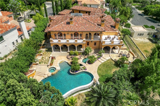 Welcome to an exceptional opportunity to own a custom estate in the exclusive Whispering Pines Summit a premier gated community in Arcadia, offering 24-hour security, serene mountain surroundings, and access to award-winning schools. With only 49 luxury residences, this neighborhood is designed for the most discerning homeowners seeking privacy, elegance, and prestige. Positioned on a generous 1.02-acre lot (44,431 sq ft), this Mediterranean Revival estate was thoughtfully built in 2007 and spans 6,526 sq ft of refined living space. Gated and privately hedged, a charming Saltillo-tiled veranda leads to an impressive entry, unveiling a home rich in character and quality. The thoughtfully designed floor plan features 5 en-suite bedrooms and a versatile den, with ideal separation of space for multi-generational living or guests. On the main level, you ll find a private guest suite, a spacious den area, a second en-suite bedroom with a dedicated office, providing flexibility for in-home work or extended family stays. Upstairs, the primary master suite offers a retreat-like experience with panoramic 360-degree mountain and city views from its private balcony, and is enhanced by a built-in Miele coffee station for the ultimate luxury morning routine. An additional corner suite bedroom with master-size proportions and a third en-suite bedroom complete the upper level accommodations. Crafted with premium Texas Oak wood throughout, the home exudes timeless sophistication. Entertain with ease in the formal and informal living areas, a dedicated cigar room, entertainment lounge, gourmet kitchen with Wolf appliances, separate wok kitchen, and a 24-hour temperature-controlled wine cellar. A private elevator ensures easy access to all levels ideal for seniors or those seeking convenience. Outside, the resort-style backyard boasts an infinity-edge pool overlooking the scenic hills of Los Angeles perfect for relaxation or entertaining under the stars. Additional features include a whole-house water softening system, surround sound speakers, intelligent lighting controls, and a four-car garage. This exquisite residence offers an unmatched combination of privacy, luxury, and elegance perfectly suited for those seeking the ultimate Arcadia lifestyle.