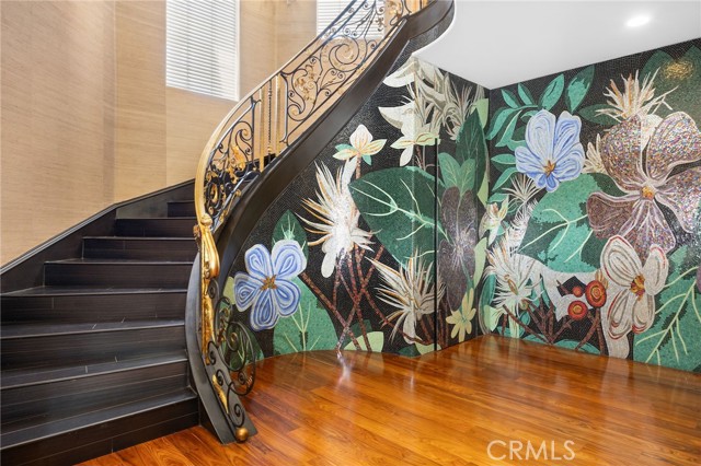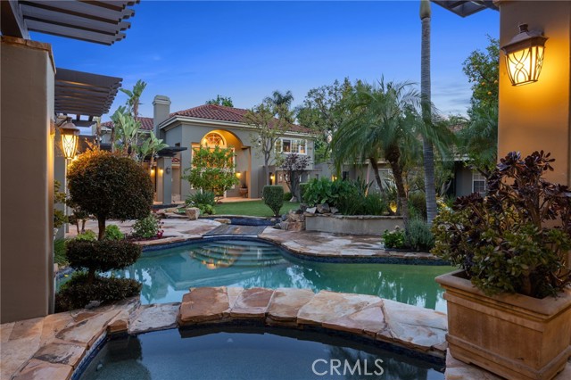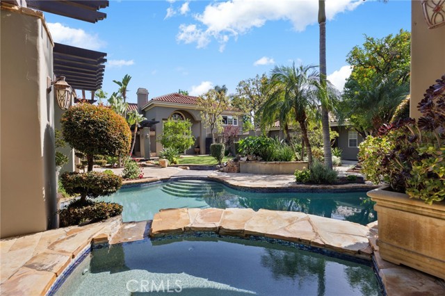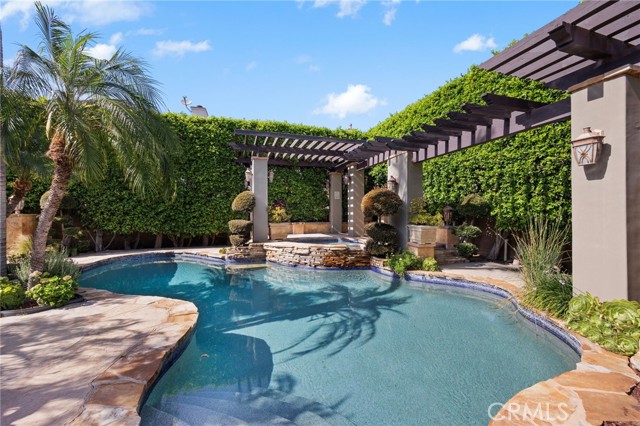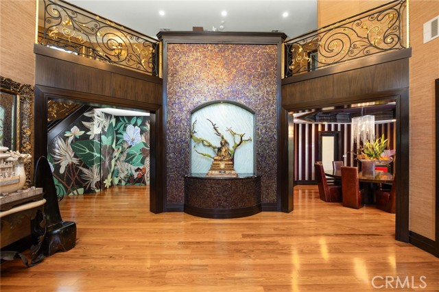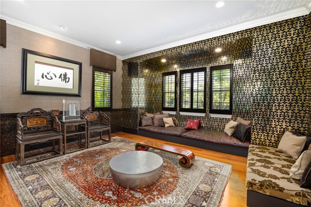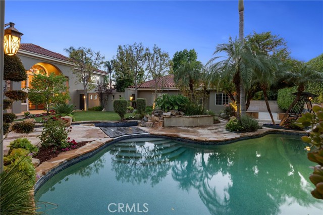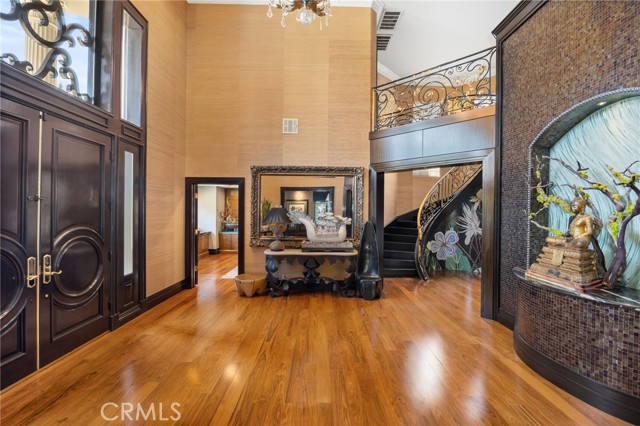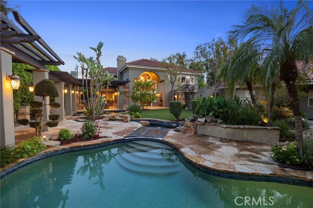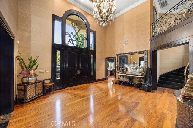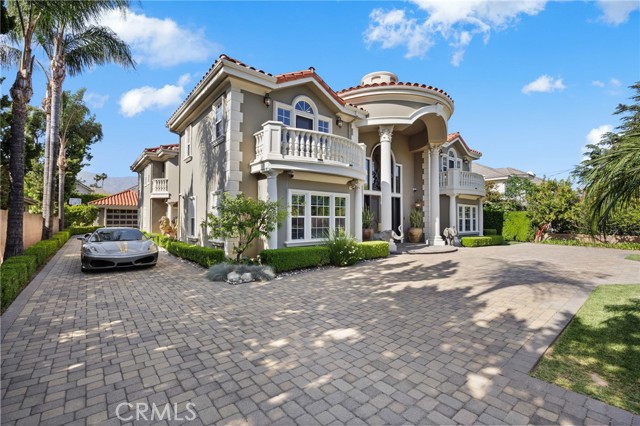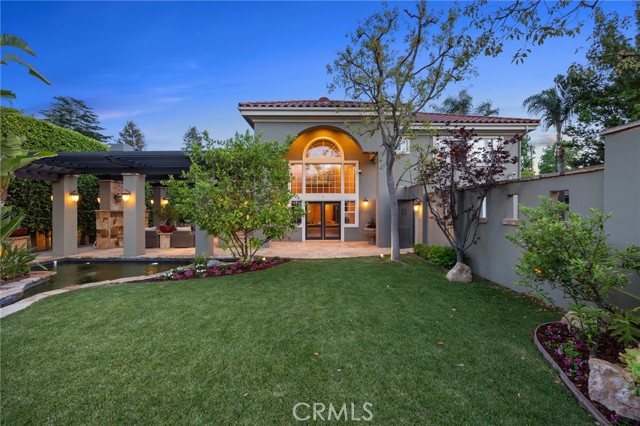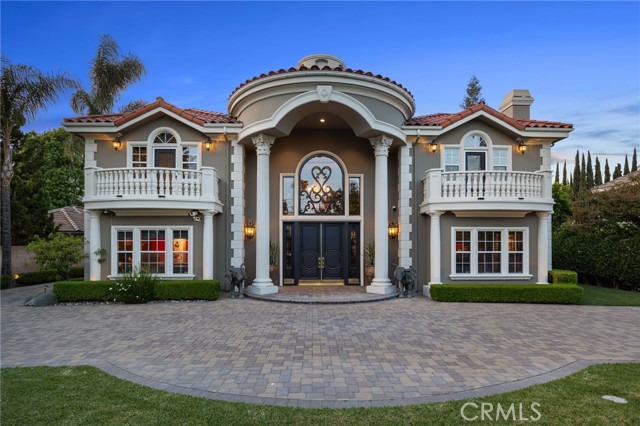Welcome to an extraordinary estate where elegance and grandeur meet in perfect harmony. Tucked behind a private gated entrance, this architectural masterpiece spans 6,184 square feet on a 19,304-square-foot lot with a coveted south-facing orientation. Every detail reflects refined luxury, offering an unparalleled blend of timeless design and modern sophistication. Arrive through a fully gated circular driveway with dual entrances, leading to a double-height entry where a gold-leaf staircase spirals beneath an opulent chandelier. Exquisite hardwood floors, gallery-style hallways, and mosaic-tile wall finishes create a seamless blend of artistry and craftsmanship. The sunken formal living room offers refined comfort, while the formal dining room stuns with its Baxter crystal chandelier, domed ceiling, and custom display shelves. The gourmet kitchen boasts Scavolini custom cabinetry, Miele appliances, and a Caesar stone countertop from Israel. An intimate breakfast nook overlooks the koi pond, lush landscaping, and sparkling pool, while a separate Wok kitchen with Gaggenau appliances is designed for grand-scale entertaining. The family room soars with a dramatic 28-foot ceiling and towering windows, filling the space with natural light. A mosaic-tile fireplace adds warmth, while the wet bar complete with a Sub-Zero wine cooler and custom cabinetry sets the stage for effortless entertaining. Step outside through French doors, where a sprawling patio offers relaxation and sophistication. A custom designer office features rich wood-paneled walls and hand-built cabinetry. The state-of-the-art home theater is equipped with immersive surround sound and Crestron automation, offering the ultimate entertainment experience. Upstairs, four sumptuous bedroom suites provide private retreats. The grand master suite is a sanctuary of luxury, featuring a fireplace, two walk-in closets, and spa-like bath with a jacuzzi tub, glass-enclosed shower, gold-leaf custom vanities, and aqua-glass mosaic accents. Park-like grounds feature mature trees, cascading waterfalls, and lush privacy-enhancing foliage. Lounge by the resort-style pool and spa, gather around the outdoor fireplace, or stroll through the lavish gardens immersed in serenity. This isn t just a home; it s a statement, an experience, a legacy. Indulge in Southern California s pinnacle of luxury living and make it yours today.Interested in this Listing?