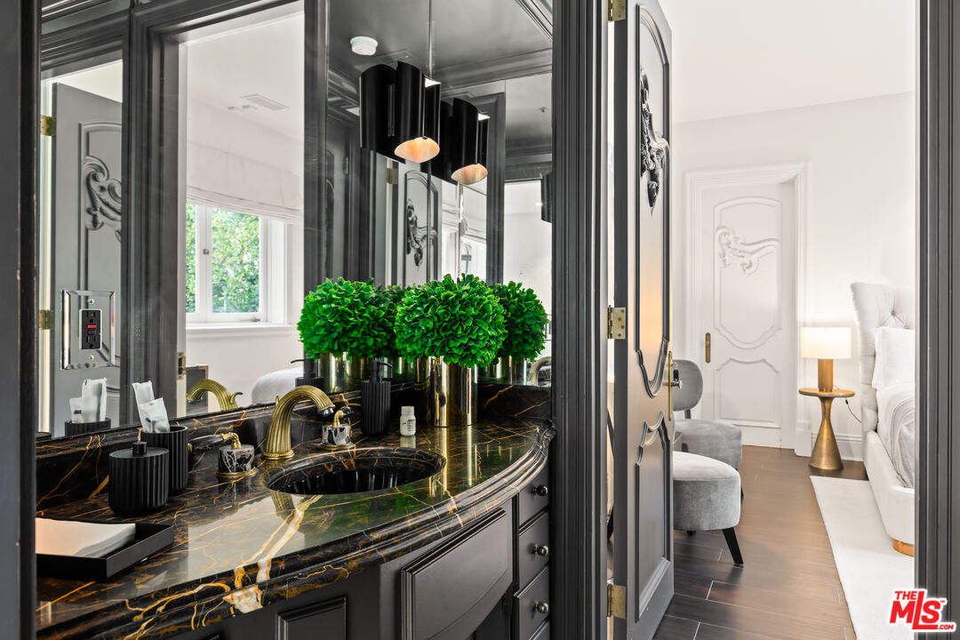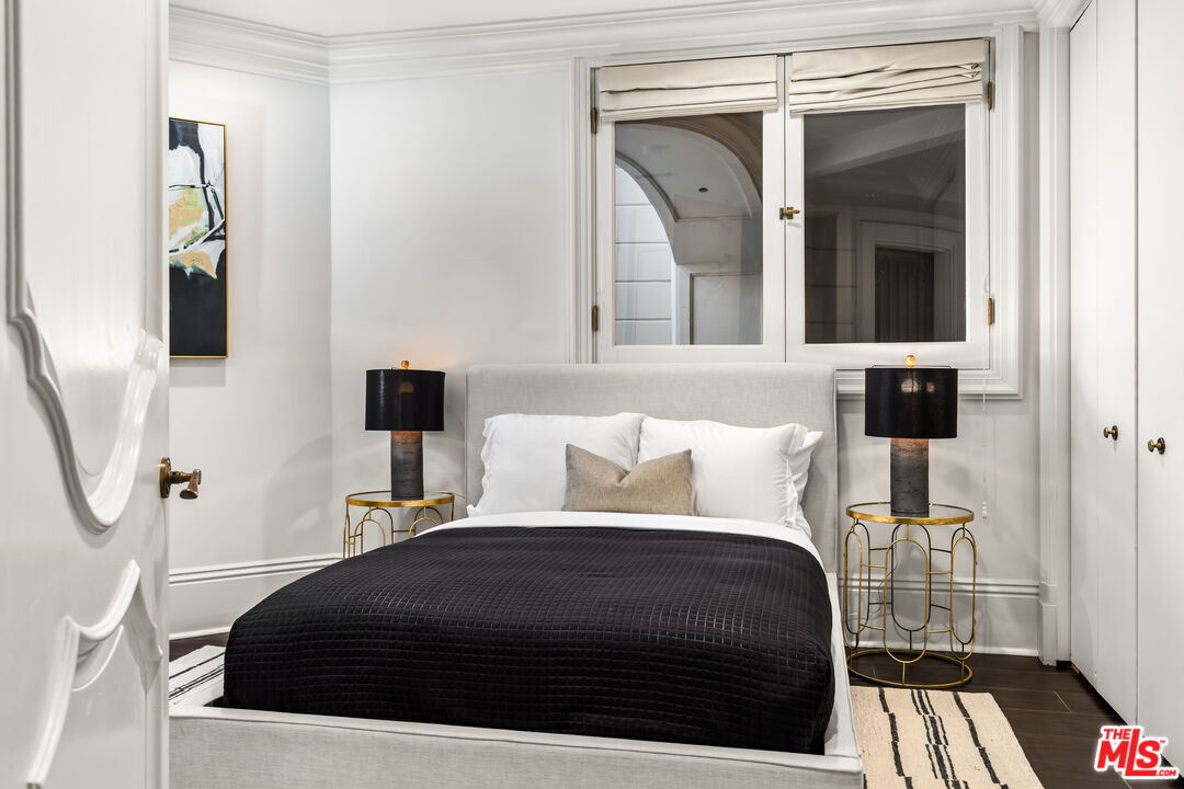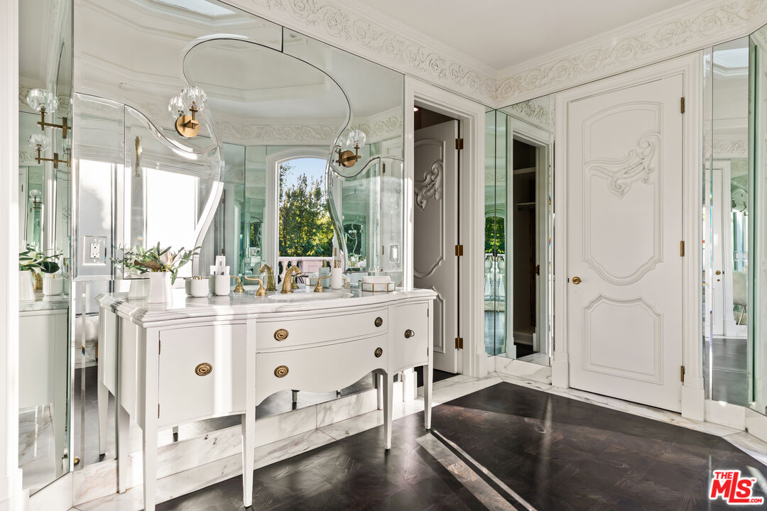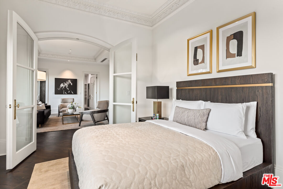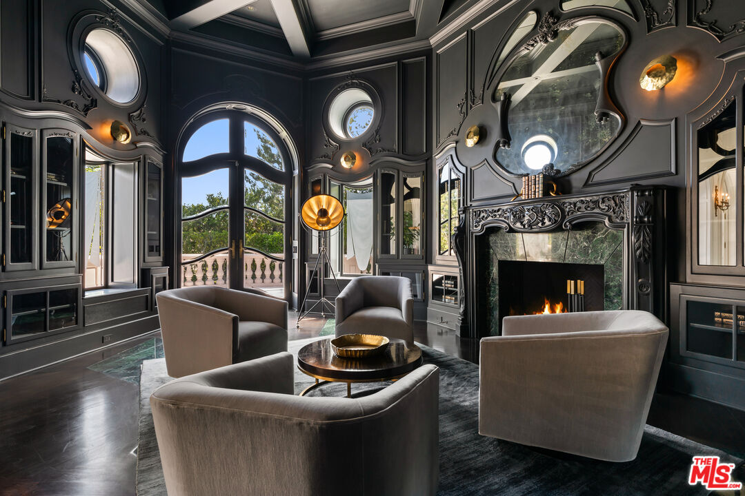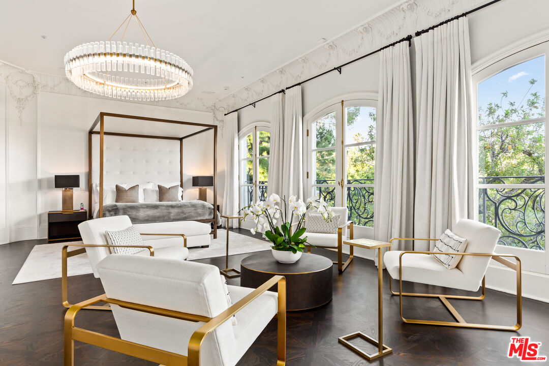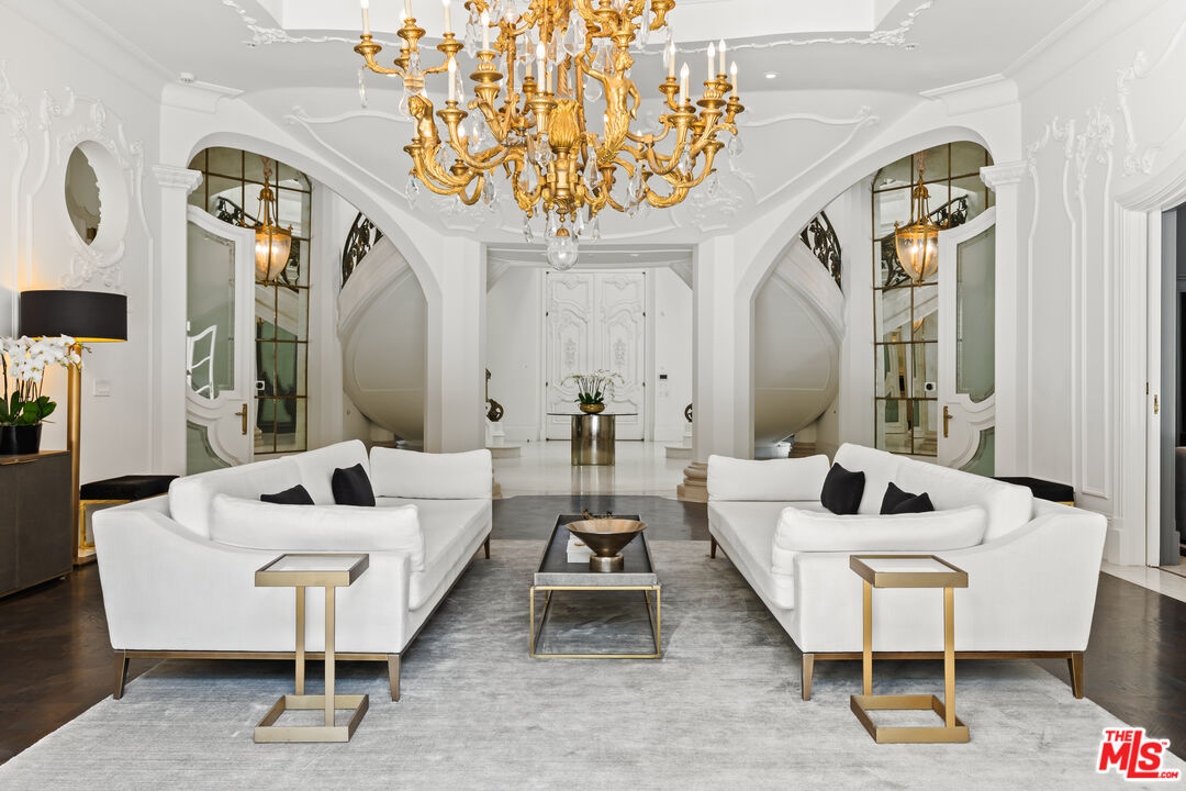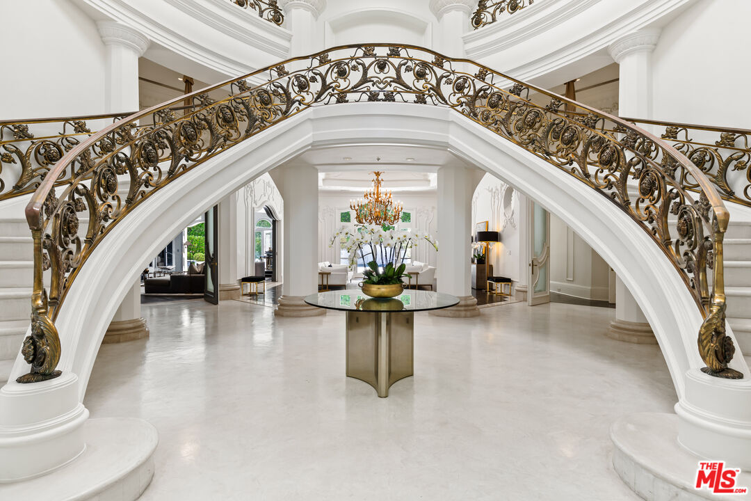 This stunning private estate, located in the prestigious city of Beverly Hills, combines timeless classical architecture with sleek contemporary interior design. Enter through grand double doors into an impressive foyer featuring soaring 30-foot ceilings and a striking bronze dual staircase, leading to a seamless indoor-outdoor layout. The formal rotunda entrance sets a tone of elegance, inspired by the refined style of the Peninsula Hotel in Paris. Blending European architectural elements, this home is a masterpiece of craftsmanship and detail.With 8 bedrooms, 12 bathrooms, and an array of formal spaces including family, living, and dining rooms with fireplaces, along with a library, bar, and media room, the estate is designed for both luxury and comfort. The custom-designed kitchen, created by Martin Pierce, includes a butler's pantry and top-of-the-line appliances. The master suite features dual bathrooms, spacious walk-in closets, and an attached private office.The impeccably landscaped grounds are an oasis, featuring a cascading pool, spa, shaded seating areas, and vibrant gardens. Ideal for hosting large gatherings, the property also offers a warm and welcoming atmosphere for intimate family living.Interested in this Listing?