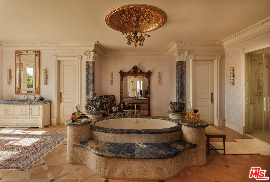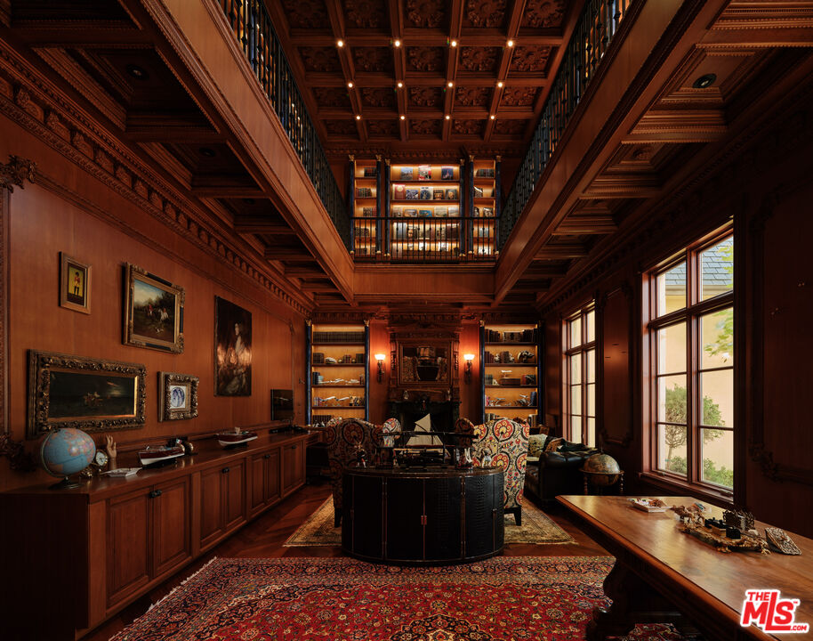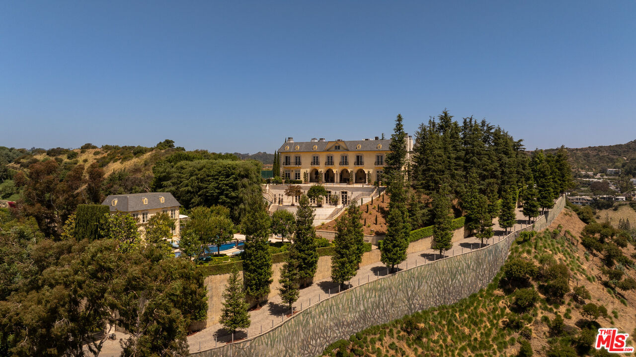Poised high atop a promontory, this palatial European Estate boasts jaw-dropping 360 degree views of all of Los Angeles. Rich in privacy behind gates and up the long tree-lined driveway, this fortress of unparalleled magnitude is revealed. Situated in a world of its own overlooking the stunning gardens and city, this home is the epitome of royal living in the most sought-after city in the country. High ceilings, ornate details and grand-scale rooms are showcased beyond the luxurious foyer and Imperial Staircase through the massive double door entrance. Highlights from the main floor include an industrial grade chef's kitchen with an adjacent light and bright breakfast room, a formal dining room with double doors made with Venetian stained glass windows, an impressive living room with a gorgeous bar and fireplace, a billiards room, and a formal sitting room. Among the many jewels of this home is the two story library which includes a steel spiral staircase and a vibrant irreplaceable stained glass light fixture. Upstairs, the master bedroom rivals that of a European castle with multiple private terraces, city and nature views, his and hers closets, a massage room and a luxurious bathroom made with lapis stone. In addition to the master suite there are four oversized en suite bedrooms each with beautiful views and walk in closets. The lower level is an entertainer's paradise with a theater, ballroom that opens up to a sprawling terrace where your guests can soak in the picturesque views, and a wine cellar that's authentically outfitted as the storefront of an early 18th century English saloon. The backyard consists of a sparkling pool and spa, outdoor kitchen, putting green, a fruit and vegetable garden, tennis court, koi pond, and endless places for dining al fresco. In addition to the various amenities, the home is also equipped with an oversized gym. This tranquil oasis is quintessential to the highest class of luxury living, built for those who hold history, design, and beauty in the highest regard.Interested in this Listing?