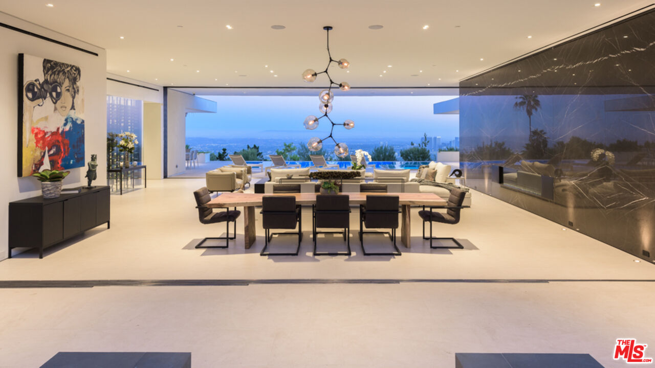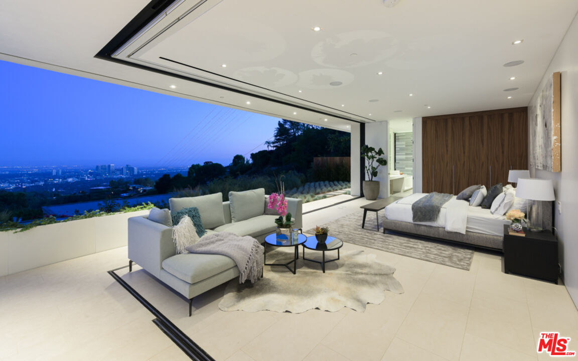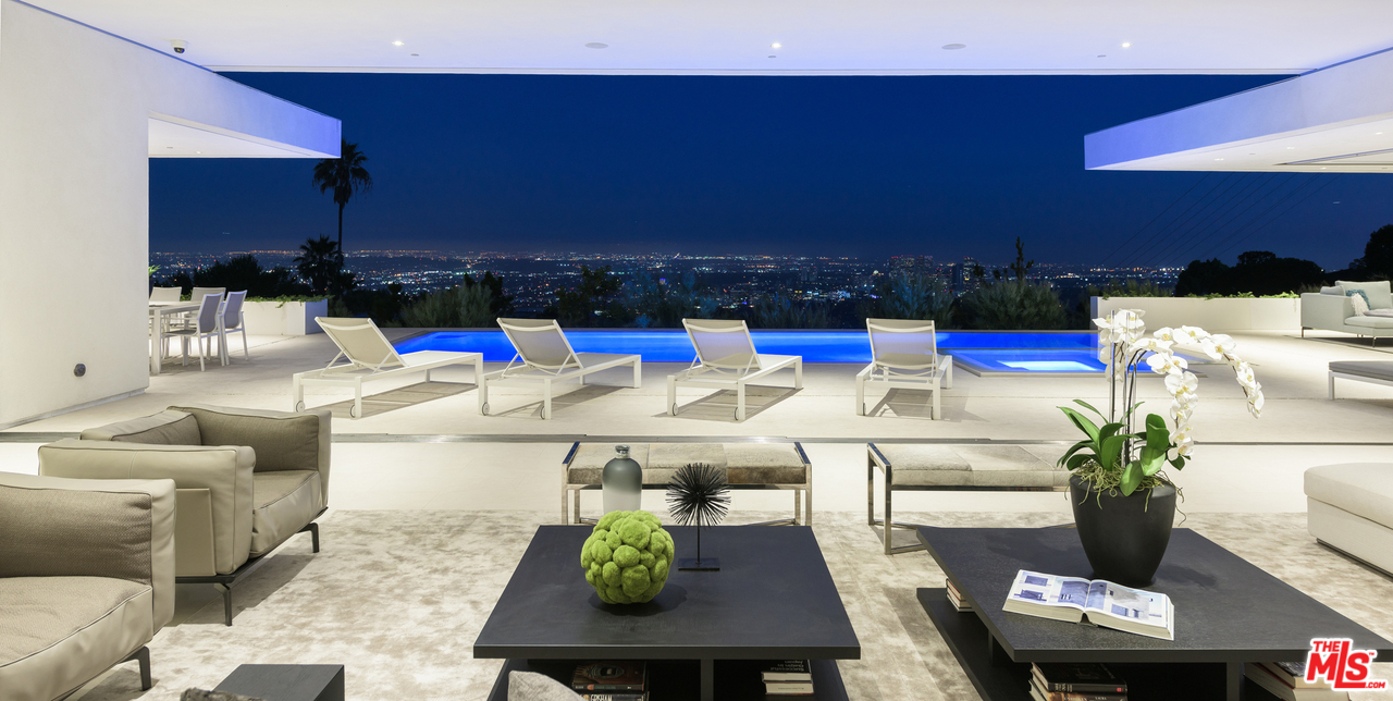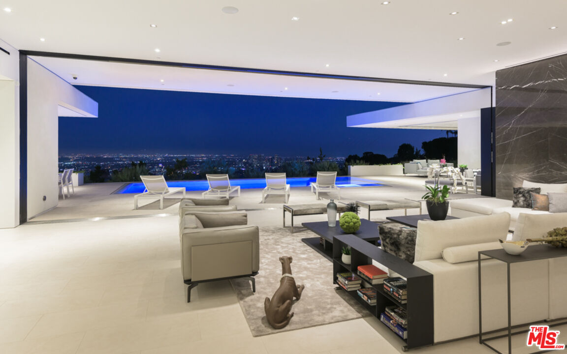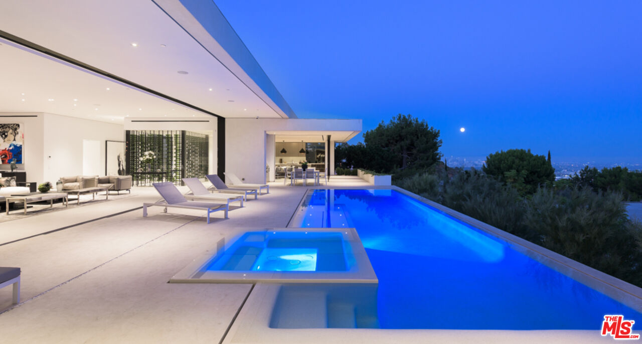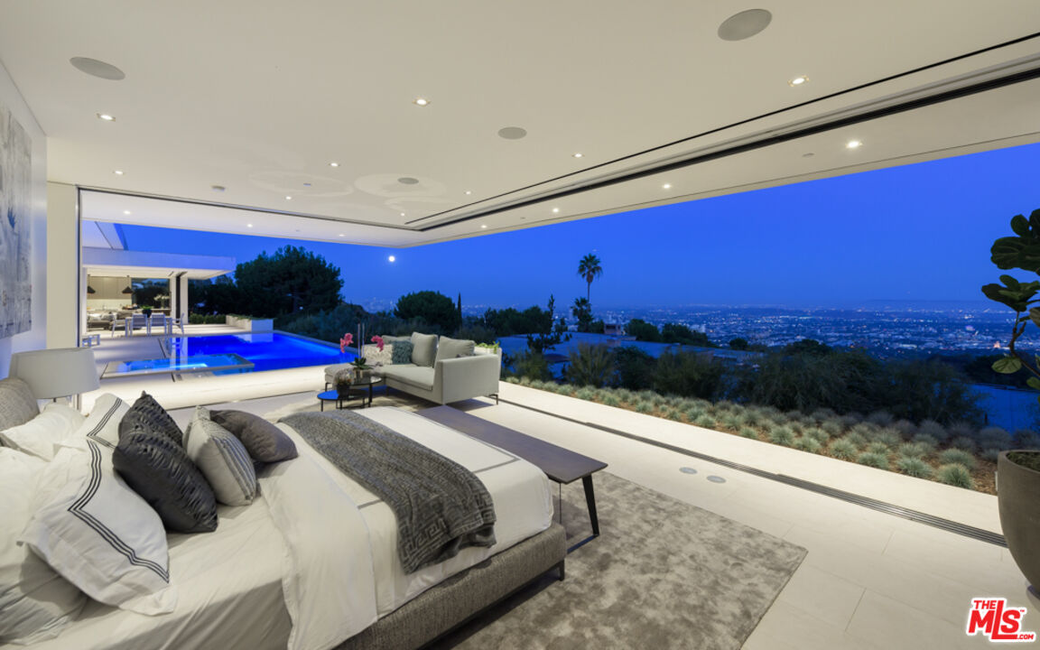 10/10 Views in Prime Trousdale. Contemporary XTEN Designed home, spanning nearly 7,000 square over ONE STORY. Perfect layout blending indoor/outdoor living space, redefining what it looks like to entertain on top of the world- with views from DOWNTOWN to MALIBU. Walls of glass open with a single touch of a button. Using only the finest materials, the home features 5 beds/ 6 bath. Gated and secure motor court is walled off by a huge custom water feature that leads into a towering glass entry. Once inside, the open floor plan has soaring ceilings, custom nine-foot solid hardwood doors & nearly 12-foot tall Fleetwood walls of glass, which vanish into the walls are dazzling. Featuring a gorgeous movie theater, secondary FULL prep kitchen, Control 4 smart home & climate controlled 1,000 bottle glass wine cellar. Backyard has lush landscaping & an outdoor fireplace with built-in seating to warm up & gaze upon the endless views. A must see property at an incredible price. Pictures do not reflect current furniture- Shown to prequalified clients only.Interested in this Listing?