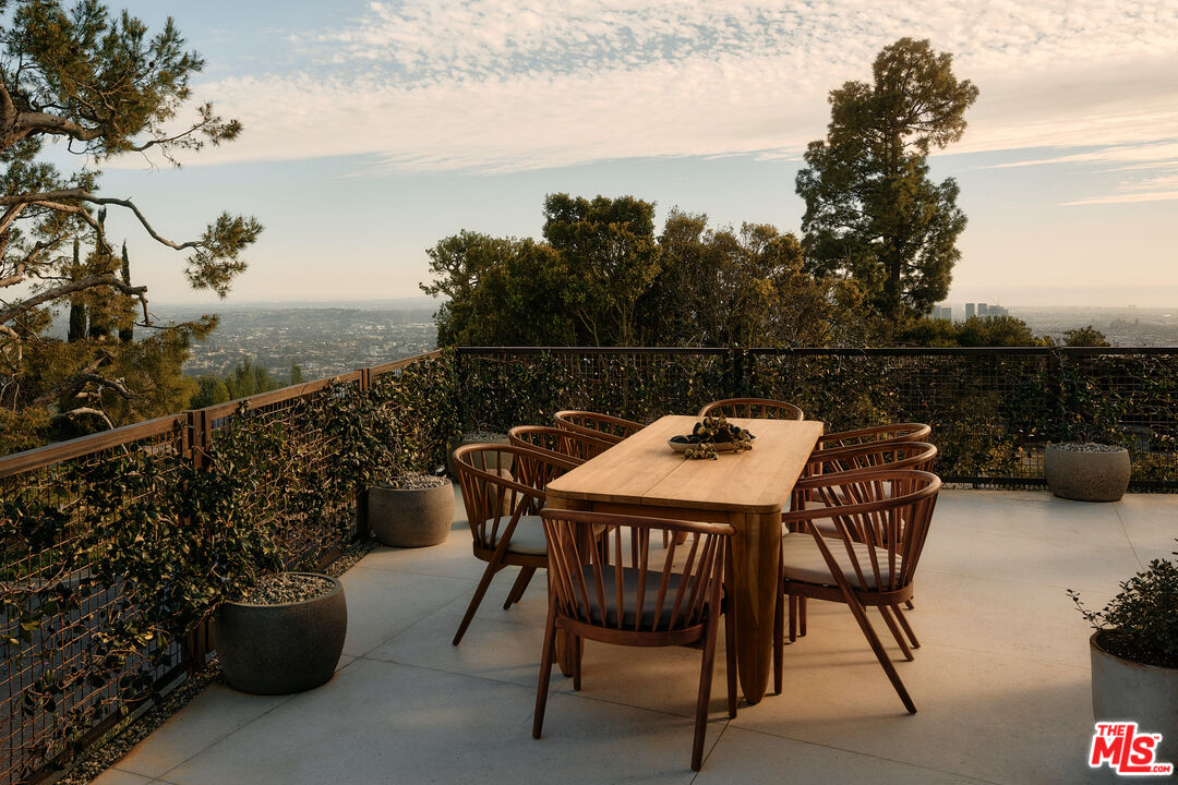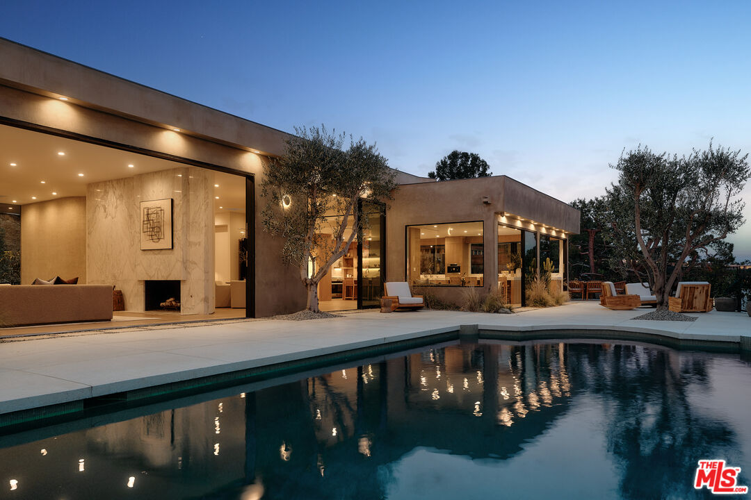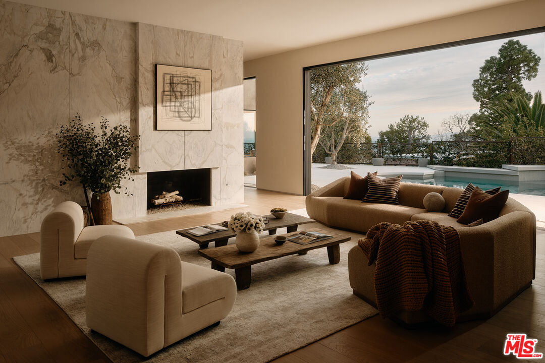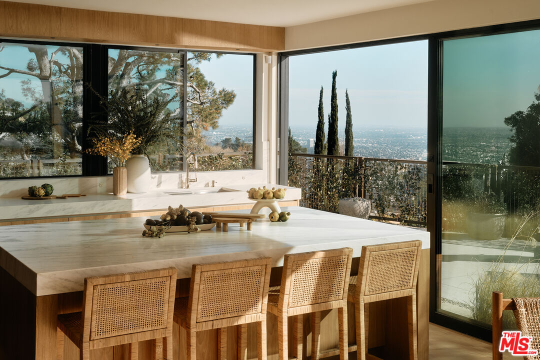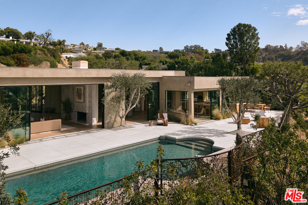An organic, modern gem reimagining Ibiza living. A rare offering in one of the city's coveted Trousdale streets. Perched on a promontory, this exceptional residence blends seamlessly with its natural surroundings. Earthy tones and natural materials, including richly toned woods, marble, and travertine, create a warm and sophisticated atmosphere throughout. A private gated entrance opens to a long driveway, leading to a motor court framed by mature olive trees. The grand 12-foot-tall front door sets the stage for the architectural brilliance found within. Spanning 6,309sqft, the open floor plan flows effortlessly through the main living areas. The living and dining rooms are elegantly divided by a striking double-sided fireplace, while a library den connects seamlessly with the gourmet kitchen and outdoor spaces. The backyard is a true showstopper, extending horizontally to link the main public rooms and primary suite. An oversized pool, expansive terrace, and a large yard offer breathtaking panoramic views of the Santa Monica Mountains, Ocean and city skyline. Features include six bedrooms, nine bathrooms, and impeccable design. Experience unparalleled beauty, privacy, and elegance. Shown only to prequalified buyers.Interested in this Listing?