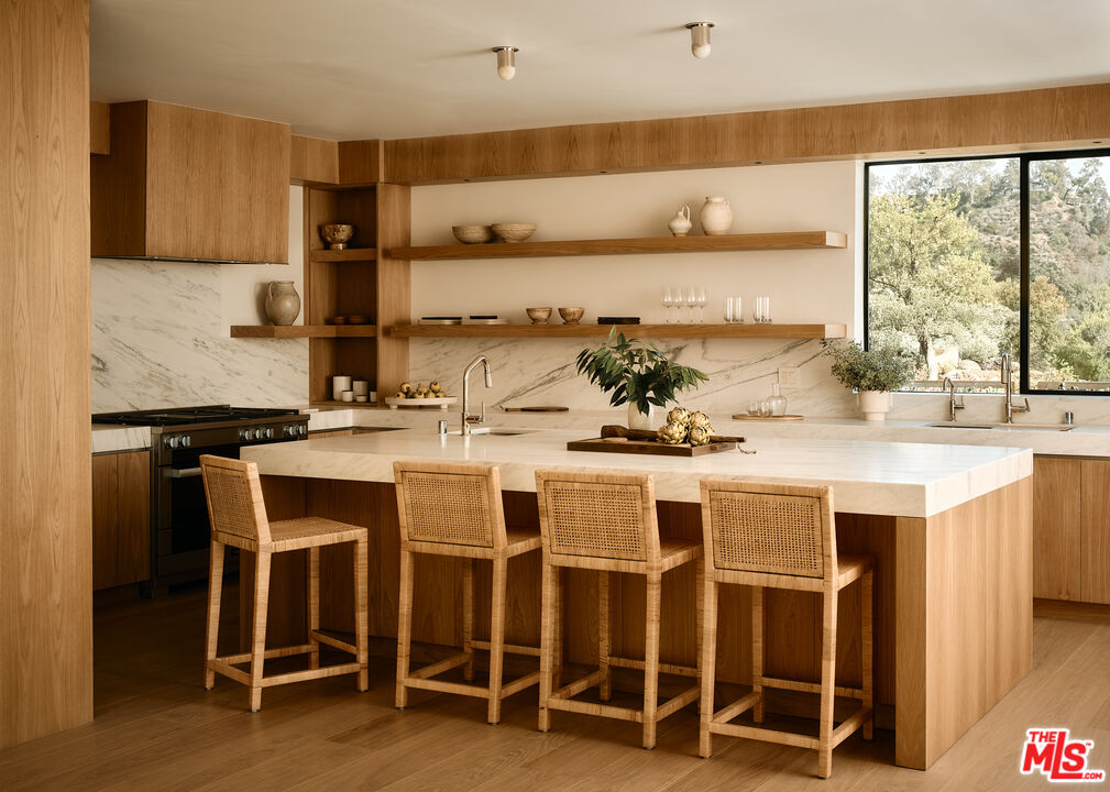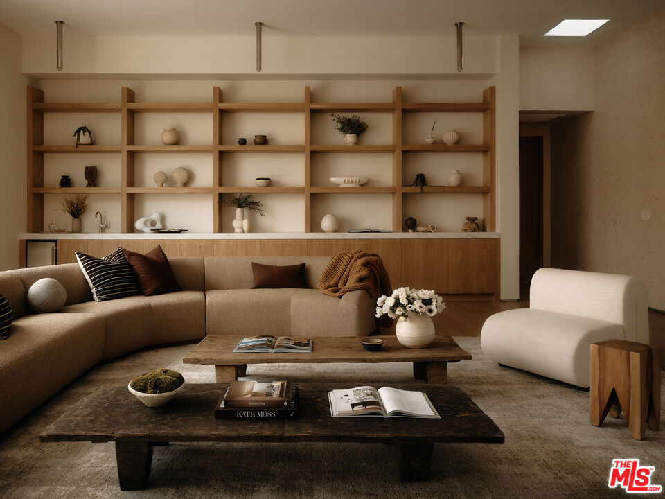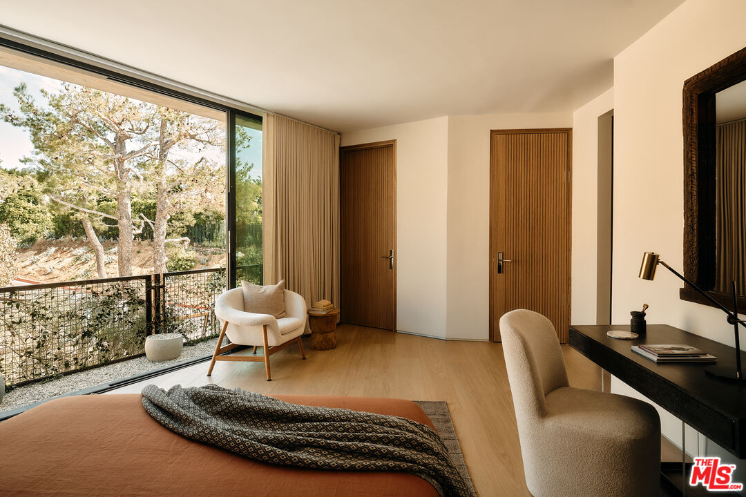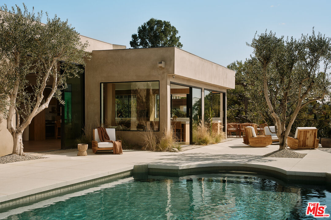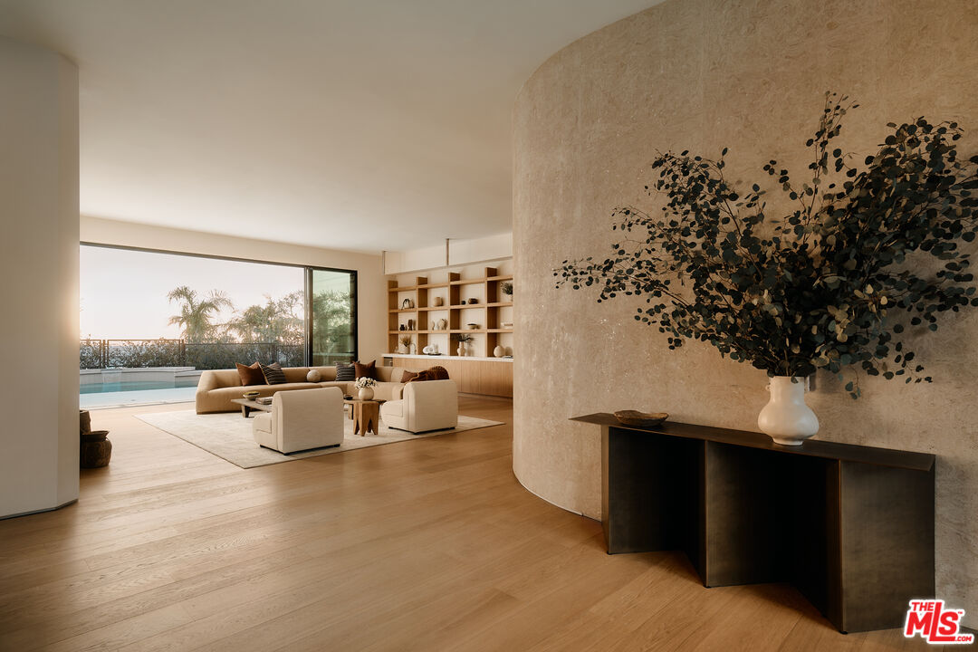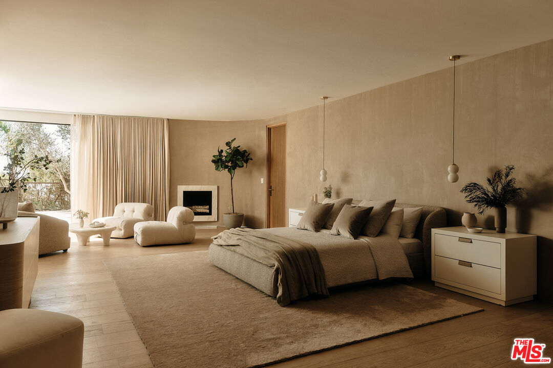 An organic, modern gem reimagining Ibiza living. A rare offering in one of the city's coveted Trousdale streets. Perched on a promontory, this exceptional residence blends seamlessly with its natural surroundings. Earthy tones and natural materials, including richly toned woods, marble, and travertine, create a warm and sophisticated atmosphere throughout. A private gated entrance opens to a long driveway, leading to a motor court framed by mature olive trees. The grand 12-foot-tall front door sets the stage for the architectural brilliance found within. Spanning 6,309sqft, the open floor plan flows effortlessly through the main living areas. The living and dining rooms are elegantly divided by a striking double-sided fireplace, while a library den connects seamlessly with the gourmet kitchen and outdoor spaces. The backyard is a true showstopper, extending horizontally to link the main public rooms and primary suite. An oversized pool, expansive terrace, and a large yard offer breathtaking panoramic views of the Santa Monica Mountains, Ocean and city skyline. Features include six bedrooms, nine bathrooms, and impeccable design. Experience unparalleled beauty, privacy, and elegance. Shown only to prequalified buyers.Interested in this Listing?