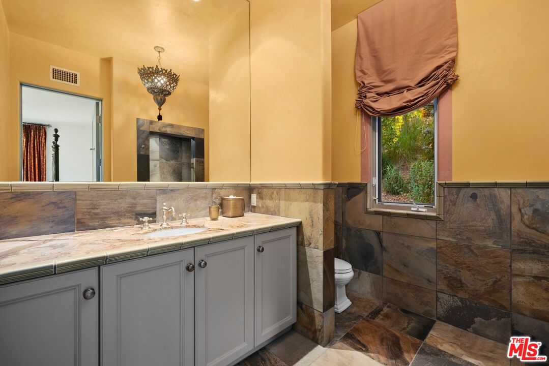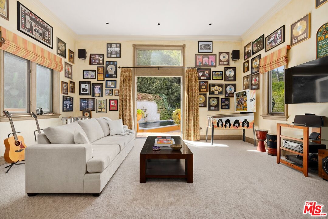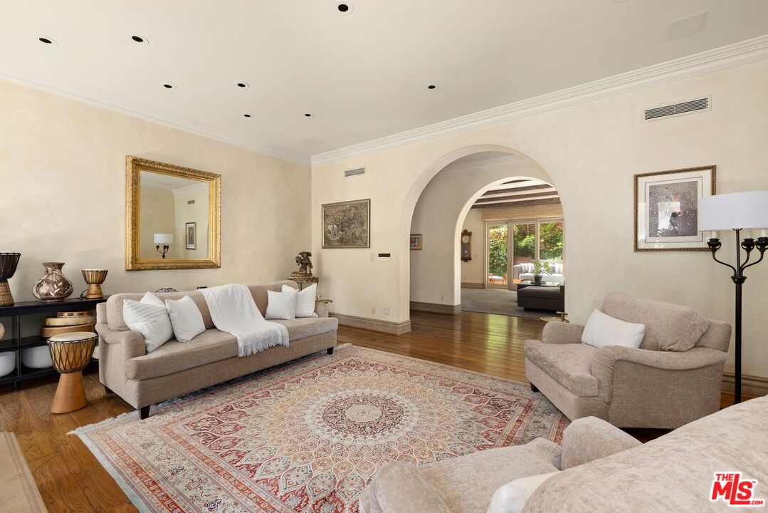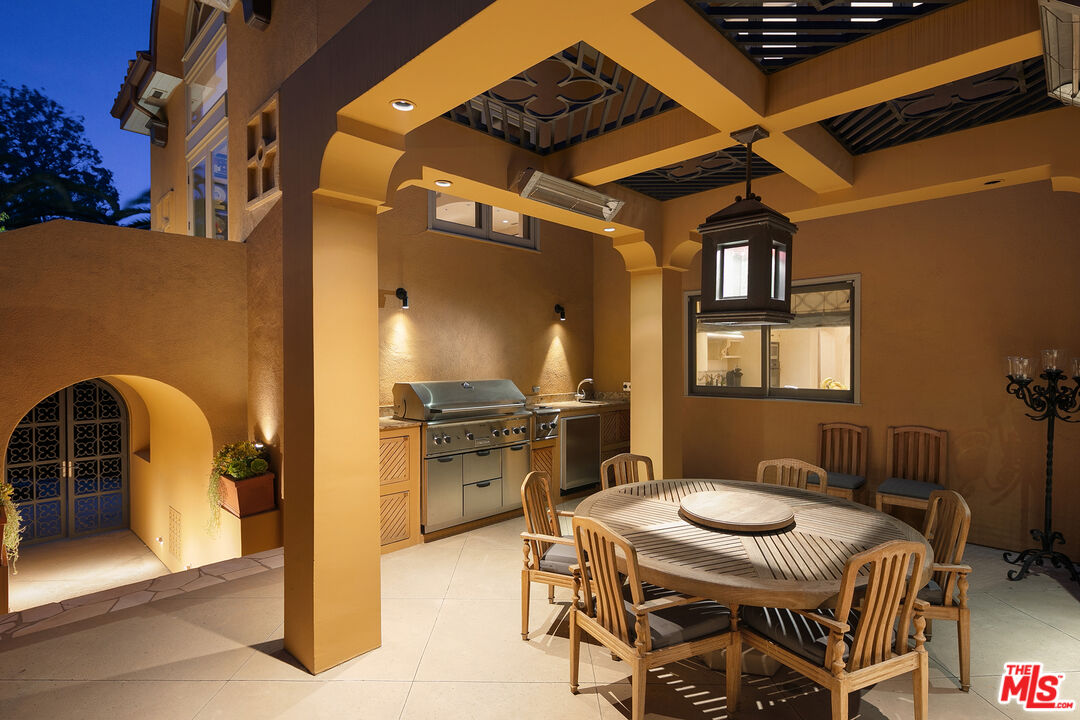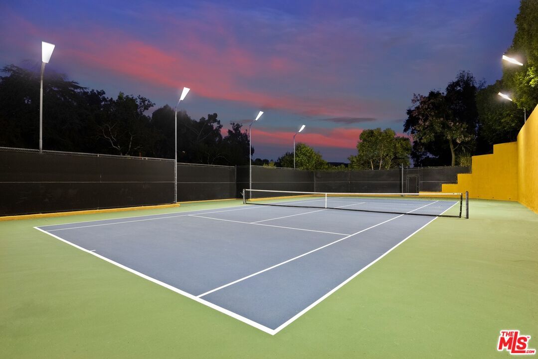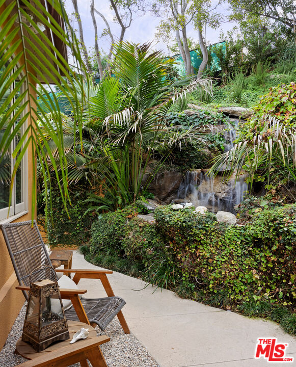 Concealed behind privacy gates, this Mediterranean-inspired tennis court compound offers resort-caliber living in the most exclusive estates section of Benedict Canyon. Set on over 1.5 acres, the fire-hardened grounds promise a peaceful sanctuary while remaining just minutes to the high fashion of Beverly Hills with close proximity to studios. A true entertainer's dream, the estate features numerous private areas that seamlessly blend indoor and outdoor living. Upon arrival, guests are greeted by drought-tolerant landscaping and a sprawling motor court with ample parking for up to fifteen vehicles. The main residence, perched above the tennis court, showcases exquisite design details such as coffered ceilings, exposed wood beams, and wainscoting throughout along with wireless smart home technology. The grand foyer opens to the expansive rear grounds, adorned with multiple fountains, a cascading waterfall, and a variety of lounging spaces perfect for relaxation. The primary suite is a masterpiece, featuring a European-inspired fireplace, custom built-ins, a private lanai, and a sitting room currently used for massage, meditation, and yoga. The suite also includes dual walk-in closets and a luxurious bathroom with a marble spa tub, new dual wireless steam showers, dual vanities, makeup station, and two water closets. A separate grand guest house, once its own standalone residence, offers a large living room, kitchen, office, upstairs bedroom, two bathrooms, and gym which could be used as an additional bedroom. French doors open to the enchanting pool and spa area, making this additional structure an ideal space for relaxation or a potential two-bedroom layout. Outdoor dining and lounging spaces provide the perfect backdrop for al-fresco dining or unwinding with a favorite beverage. Additional amenities include a viewing lounge with a designer copper-top hardwood bar, a wine room adjacent to the formal dining area, and buried power lines and subterranean wires to maximize the estate's verdant, natural ambiance.Interested in this Listing?