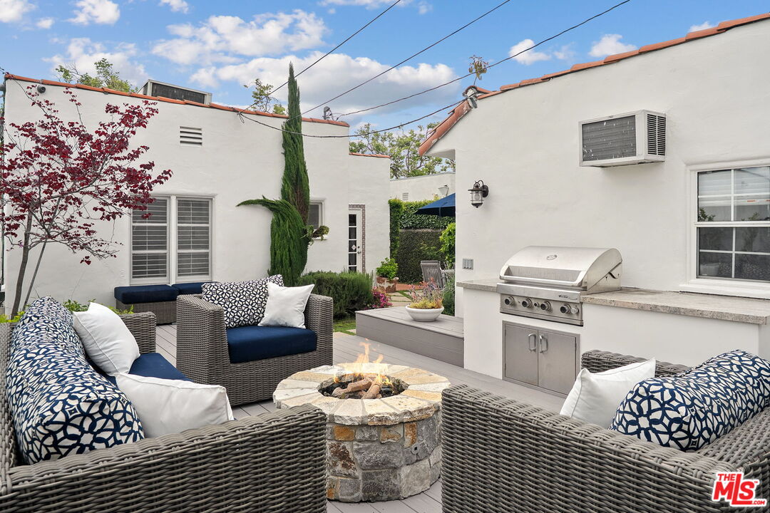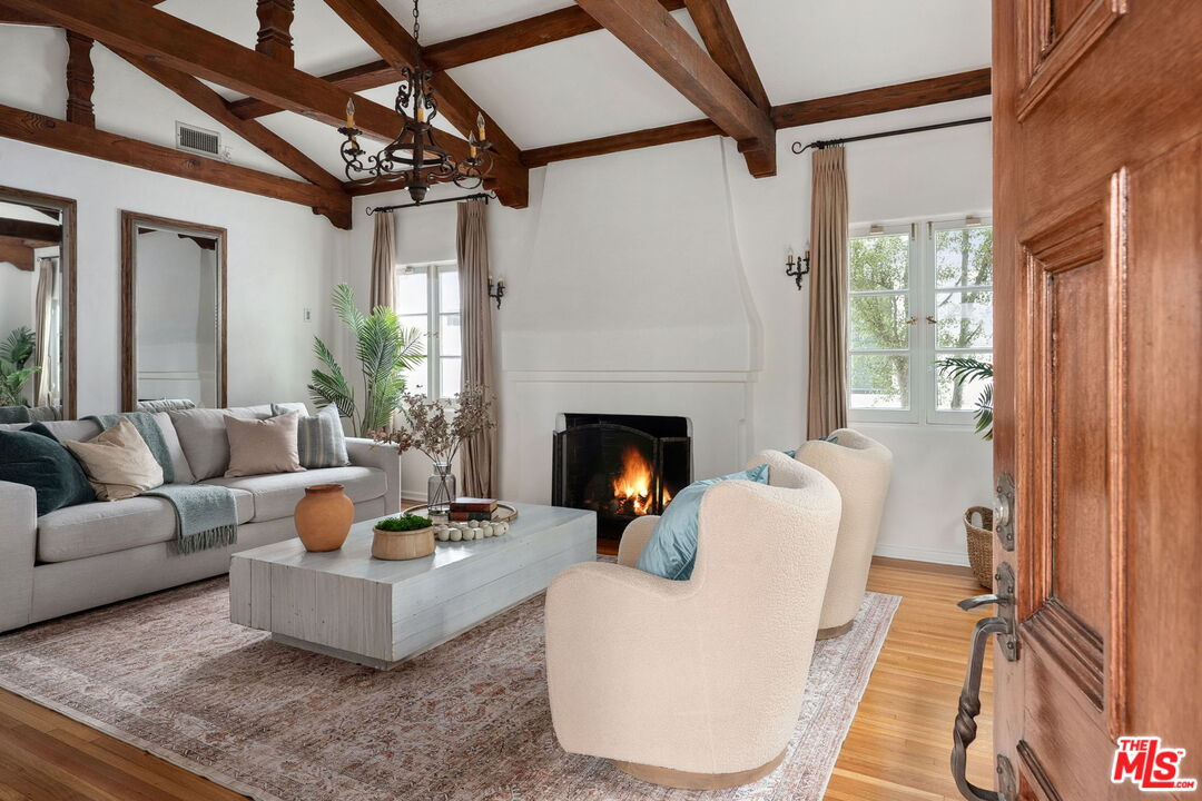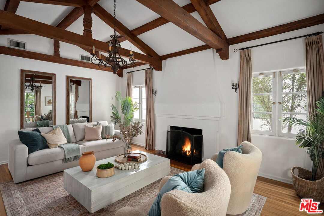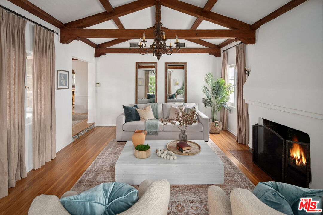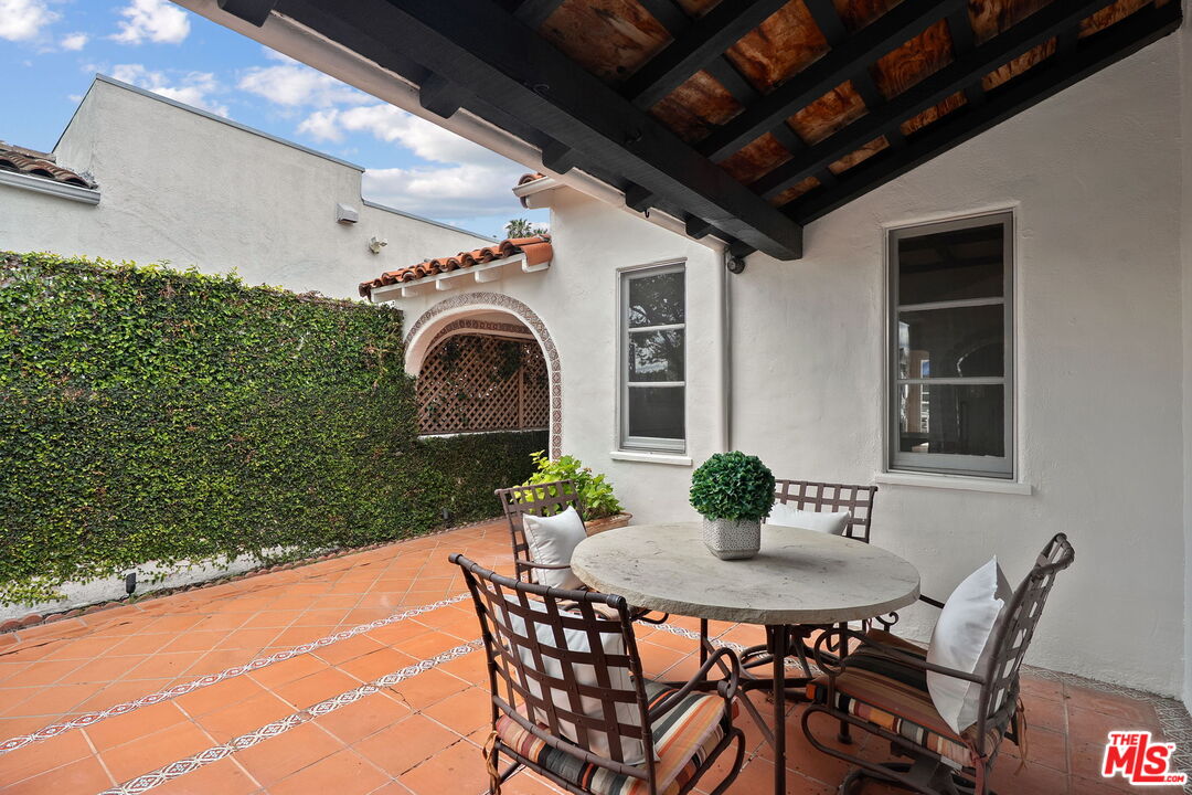 Offers due on Monday May 12th at 2:00PM. This stunning contemporary Spanish-style home masterfully blends timeless elegance with thoughtful modern updates. Tucked behind a private courtyard entry, the home welcomes you into a gracious formal living room with soaring vaulted ceilings, exposed wood beams, large paned windows, and a cozy fireplace that adds warmth and character. Just beyond, the formal dining room provides an ideal space for entertaining, while the gourmet kitchen features stainless steel appliances, authentic cabinetry, and abundant storage. A charming breakfast nook with built in banquet offers the perfect spot for casual meals or morning coffee. The home boasts three well-proportioned bedrooms, each offering comfort and style. The primary suite features an updated spa-like bath with sleek finishes, a spacious layout, and a double vanity for added convenience. The second bathroom has also been tastefully upgraded, serving the additional bedrooms. At the rear of the property, a versatile flex space with its own bath makes for an ideal guest suite, home office, game/family room or creative studio. Step outside to discover a lushly landscaped, private backyard oasis, complete with an incredible built-in outdoor BBQ area and fire-pit, perfect for dining and entertaining under the stars. Meticulously maintained and full of original charm, this exceptional home offers elegant design, updated amenities, and true indoor-outdoor living in a serene, secluded setting. Other features include: Hardwood floors through-out, central heat/air and ample storage. Prime Beverly Hills location close to shops, restaurants, excellent schools, and houses of worship. Don't miss the chance to make this exceptional home yours!Interested in this Listing?