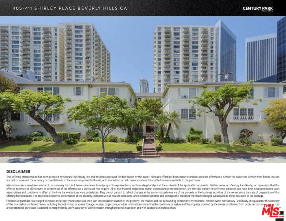 Century Park Realty, Inc. is proud to present this pride-of-ownership 11-unit apartment complex located in prime Beverly Hills, across from Beverly Hills High School and at the gateway to Century City. 405 Shirley Place is a 13,122 SF building situated on a 0.32-acre lot, consisting of ten (10) spacious two-bedroom, two-bathroom units (averaging almost 1,200 SF) and one fully renovated standalone studio. The building features classic Beverly Hills charm with a leafy brick-gated courtyard, original crown moldings in units, and timeless architectural details with modern updates.This offering presents a compelling value-add opportunity, with a proven value add business plan already in motion. Five of the eleven units have been partially or fully updated as tenants naturally moved out over the year and those renovated units have achieved significantly higher rents (up to 95% rental premium through interior renovation), clearly demonstrating the potential to increase income across the board. A new owner can execute the same or similar renovation strategy to increase net operating income (NOI) by +/- 40% a clear path to increased cash flow and long-term value creation.Additional Opportunity to Acquire Adjacent Parcel(s)Interested in this Listing?