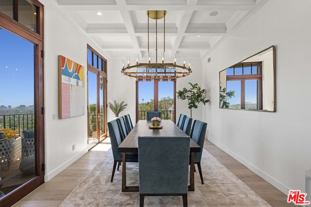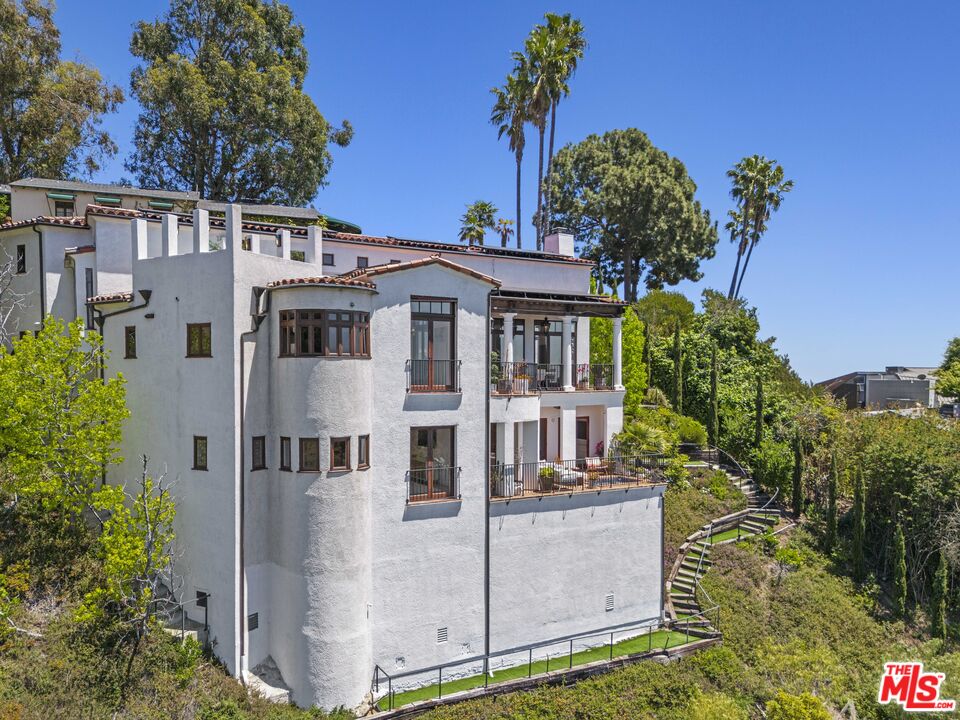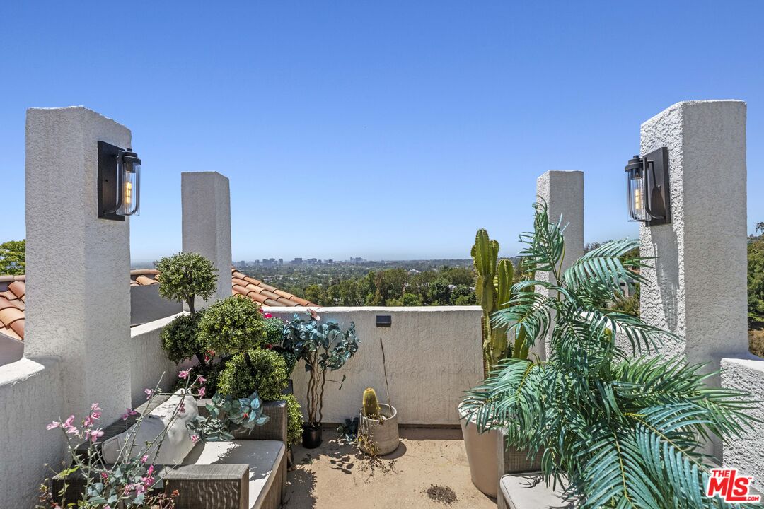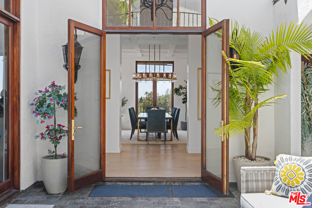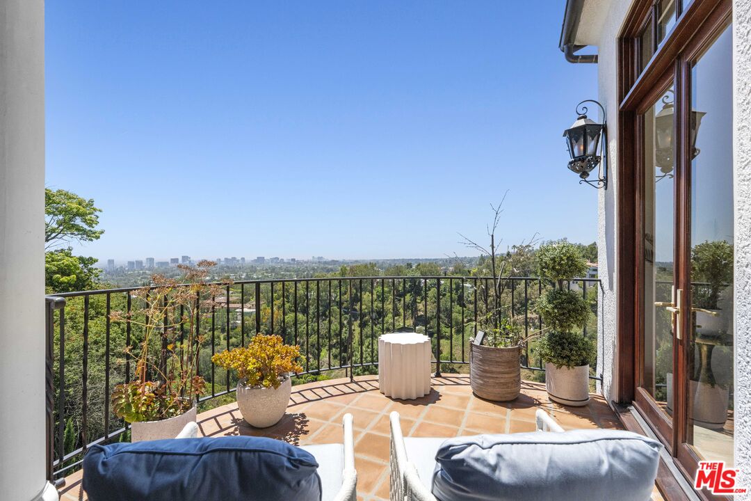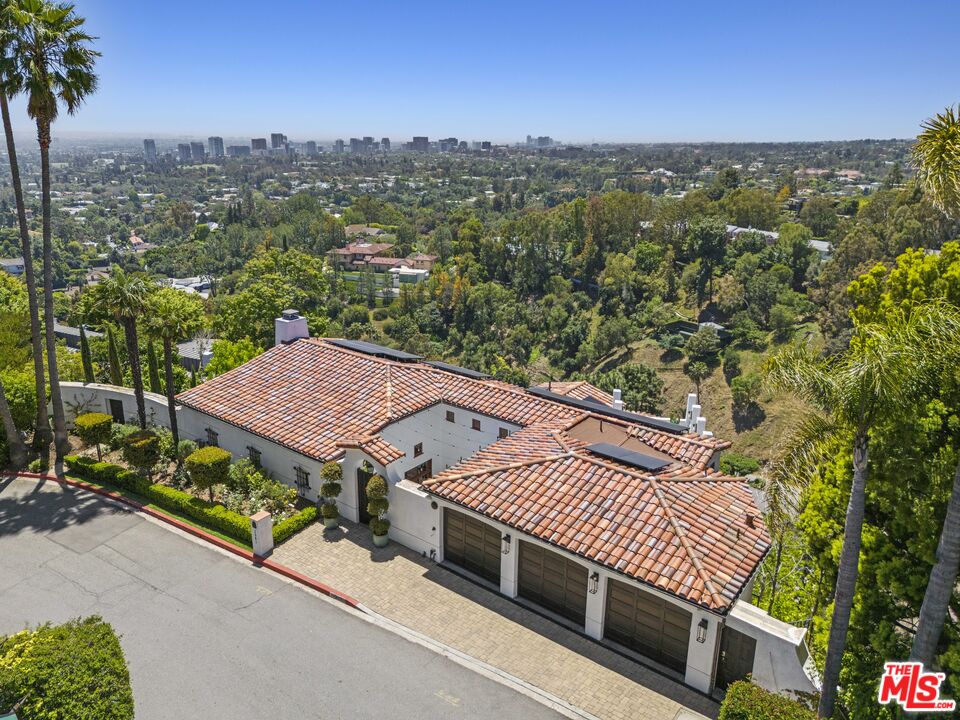 Welcome to this exquisitely reimagined estate with explosive canyon views. Nestled in a coveted enclave of Beverly Hills Post Office, Mediterranean elegance meets modern sophistication in this unique property. Behind a striking Moroccan entry door, a charming Spanish courtyard welcomes you with hand-laid Moroccan tile and blooming bougainvillea. Panoramic, unobstructed views stretching to the coastline are on full display from the upper sundeck and throughout the home's expansive interior. Soaring 20-foot vaulted, coffered ceilings and wide-plank European oak floors enhance the grandeur of the living space, centered around a dramatic fireplace. The chef's kitchen features a La Cornue range with custom hood, bespoke stone island, SubZero appliances including a wine fridge and dual Bosch dishwashers. A formal dining room with an elegant chandelier captures the same breathtaking views, ideal for intimate gatherings or lavish entertaining. Indoor-outdoor flow is seamless, with tiled patios perfect for al fresco dining and a lower-level terrace with hot tub offering romantic sunset vistas. All bedrooms are positioned to capture the sweeping views, while spa-quality bathrooms feature custom floating vanities, invisible drains, and Brizzo brass fixtures. The primary suite includes a freestanding HydroSystems tub and marble tile floors. Additional highlights include an elevator servicing all three levels, custom Emtek satin brass hardware, Restoration Hardware lighting, integrated sound and lighting systems, Nest thermostats, and a Ring doorbell all contributing to a refined yet relaxed California lifestyle. Situated moments away from prime Beverly Hills, the Sunset Strip, and Century City.Interested in this Listing?