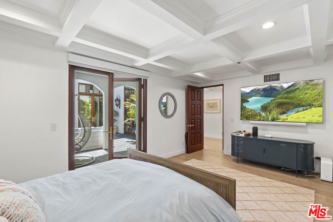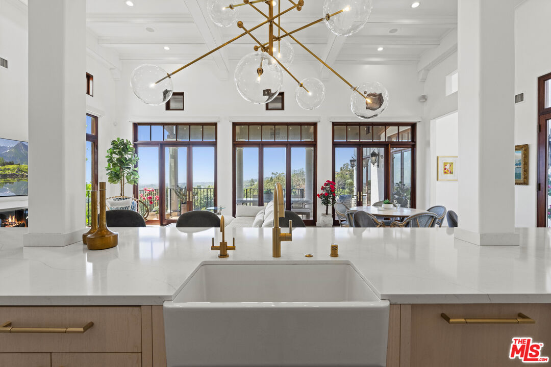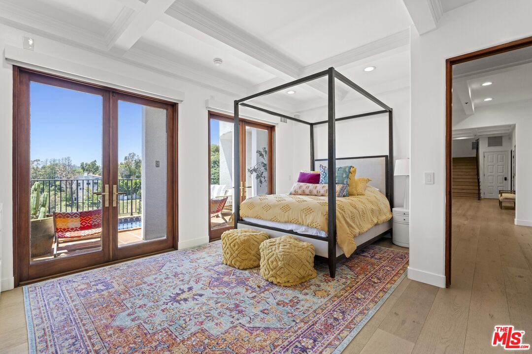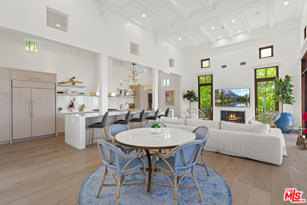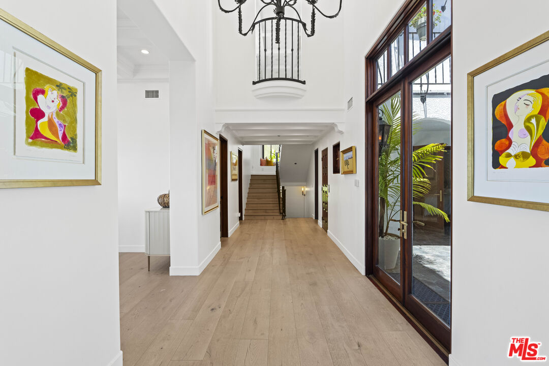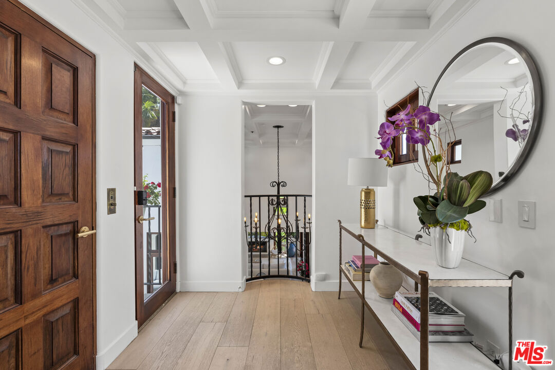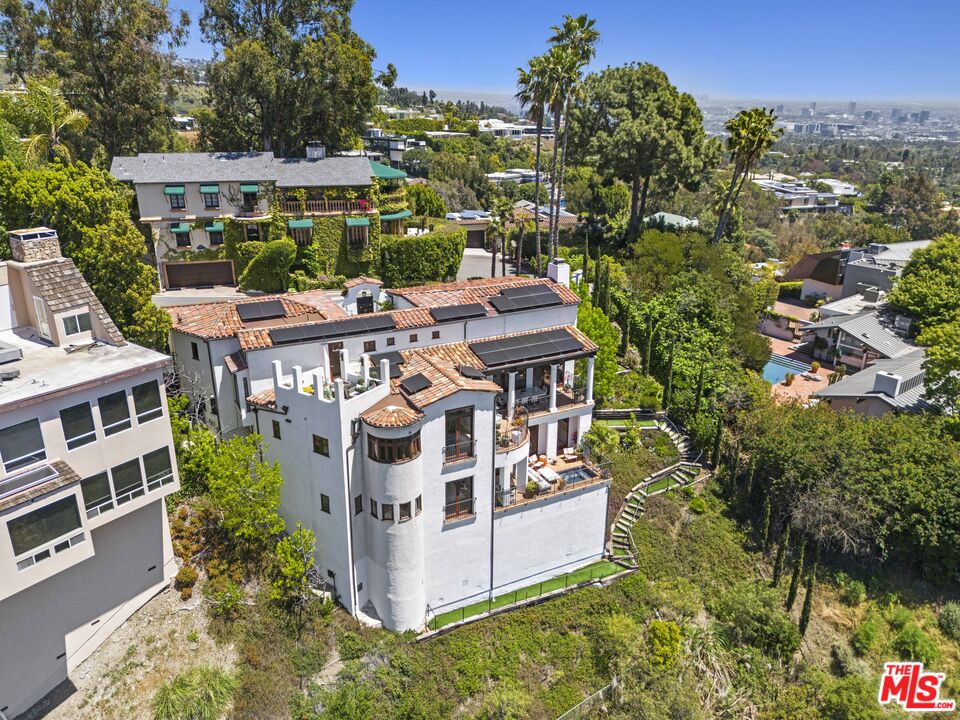 Welcome to this exquisitely reimagined estate with explosive canyon views. Nestled in a coveted enclave of Beverly Hills Post Office, Mediterranean elegance meets modern sophistication in this unique property. Behind a striking Moroccan entry door, a charming Spanish courtyard welcomes you with hand-laid Moroccan tile and blooming bougainvillea. Panoramic, unobstructed views stretching to the coastline are on full display from the upper sundeck and throughout the home's expansive interior. Soaring 20-foot vaulted, coffered ceilings and wide-plank European oak floors enhance the grandeur of the living space, centered around a dramatic fireplace. The chef's kitchen features a La Cornue range with custom hood, bespoke stone island, SubZero appliances including a wine fridge and dual Bosch dishwashers. A formal dining room with an elegant chandelier captures the same breathtaking views, ideal for intimate gatherings or lavish entertaining. Indoor-outdoor flow is seamless, with tiled patios perfect for al fresco dining and a lower-level terrace with hot tub offering romantic sunset vistas. All bedrooms are positioned to capture the sweeping views, while spa-quality bathrooms feature custom floating vanities, invisible drains, and Brizzo brass fixtures. The primary suite includes a freestanding HydroSystems tub and marble tile floors. Additional highlights include an elevator servicing all three levels, custom Emtek satin brass hardware, Restoration Hardware lighting, integrated sound and lighting systems, Nest thermostats, and a Ring doorbell all contributing to a refined yet relaxed California lifestyle. Situated moments away from prime Beverly Hills, the Sunset Strip, and Century City.Interested in this Listing?