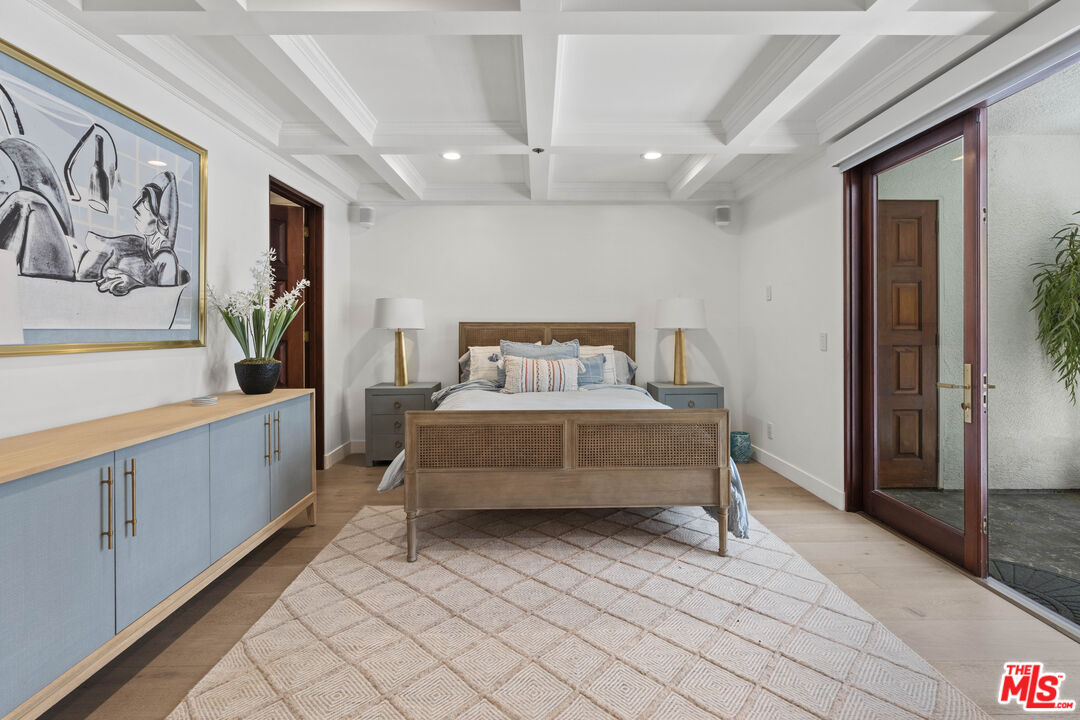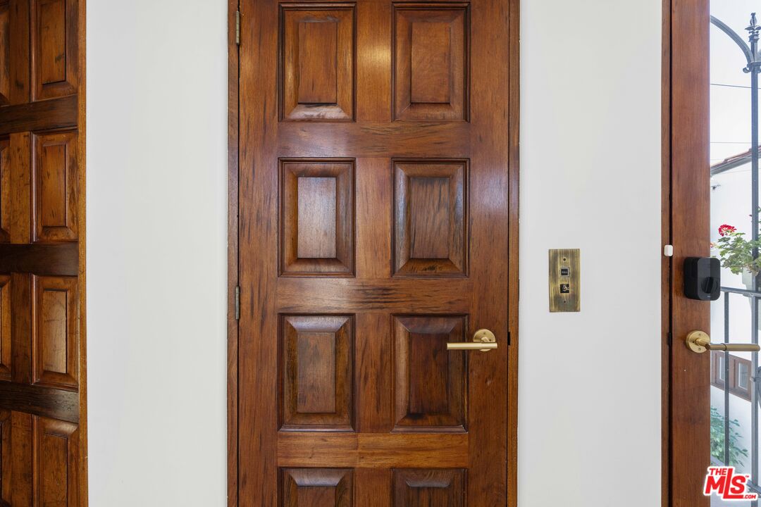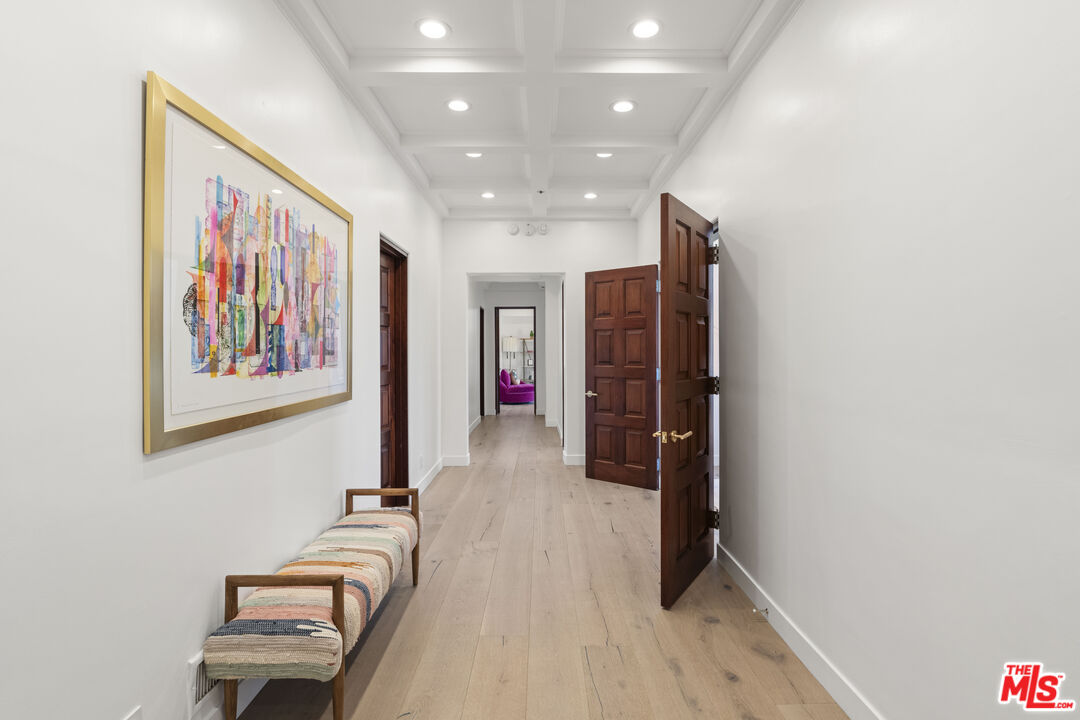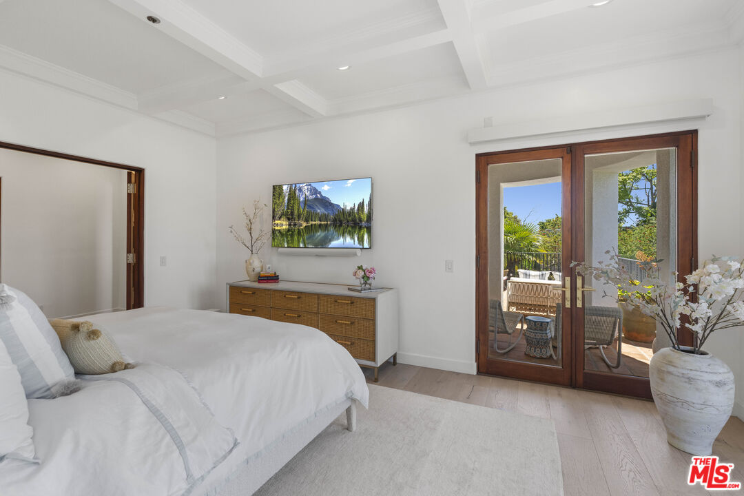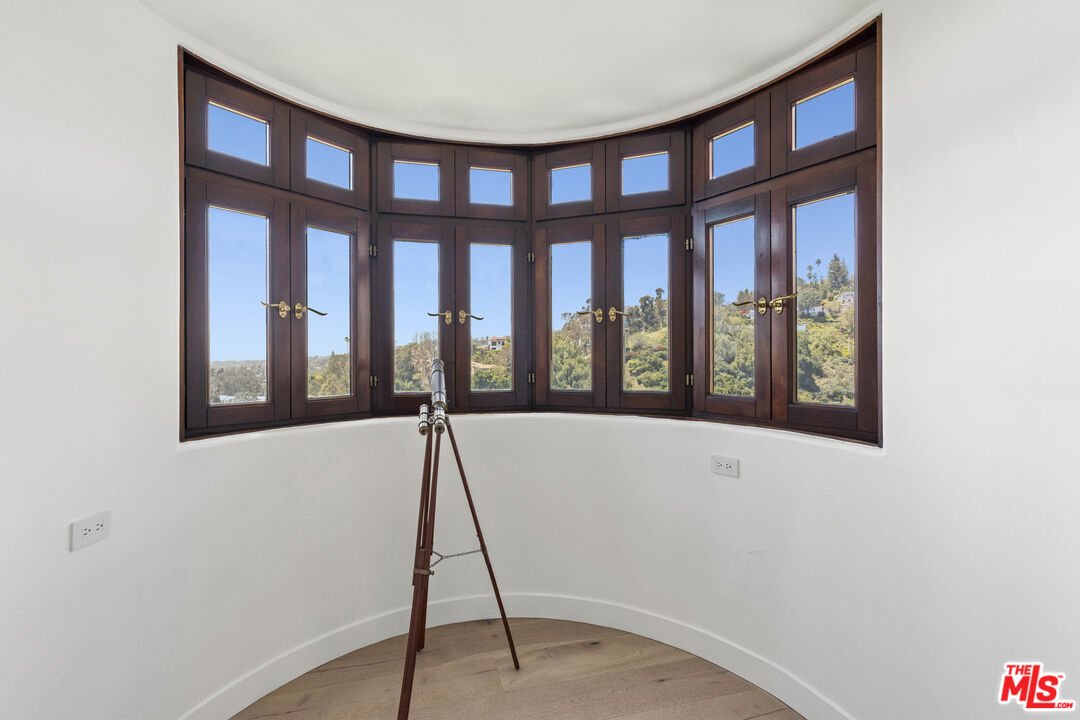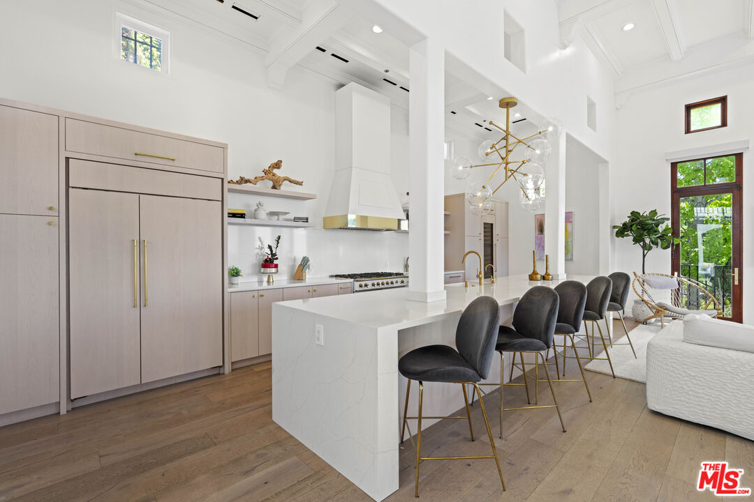 Welcome to this exquisitely reimagined estate with explosive canyon views. Nestled in a coveted enclave of Beverly Hills Post Office, Mediterranean elegance meets modern sophistication in this unique property. Behind a striking Moroccan entry door, a charming Spanish courtyard welcomes you with hand-laid Moroccan tile and blooming bougainvillea. Panoramic, unobstructed views stretching to the coastline are on full display from the upper sundeck and throughout the home's expansive interior. Soaring 20-foot vaulted, coffered ceilings and wide-plank European oak floors enhance the grandeur of the living space, centered around a dramatic fireplace. The chef's kitchen features a La Cornue range with custom hood, bespoke stone island, SubZero appliances including a wine fridge and dual Bosch dishwashers. A formal dining room with an elegant chandelier captures the same breathtaking views, ideal for intimate gatherings or lavish entertaining. Indoor-outdoor flow is seamless, with tiled patios perfect for al fresco dining and a lower-level terrace with hot tub offering romantic sunset vistas. All bedrooms are positioned to capture the sweeping views, while spa-quality bathrooms feature custom floating vanities, invisible drains, and Brizzo brass fixtures. The primary suite includes a freestanding HydroSystems tub and marble tile floors. Additional highlights include an elevator servicing all three levels, custom Emtek satin brass hardware, Restoration Hardware lighting, integrated sound and lighting systems, Nest thermostats, and a Ring doorbell all contributing to a refined yet relaxed California lifestyle. Situated moments away from prime Beverly Hills, the Sunset Strip, and Century City.Interested in this Listing?