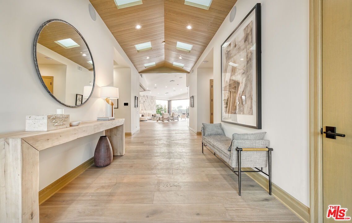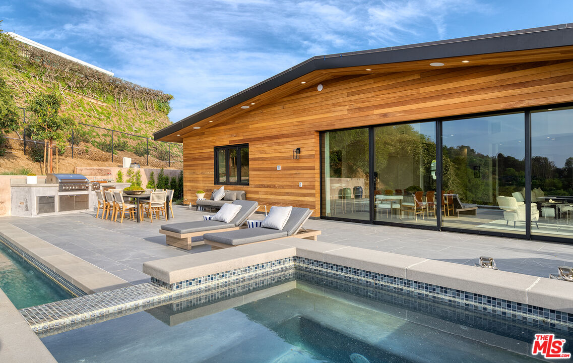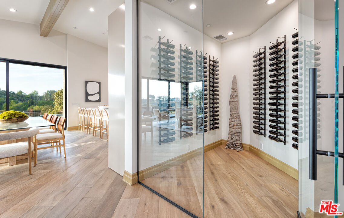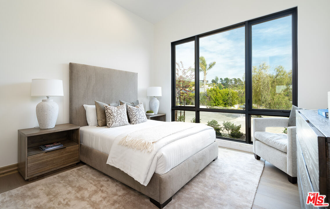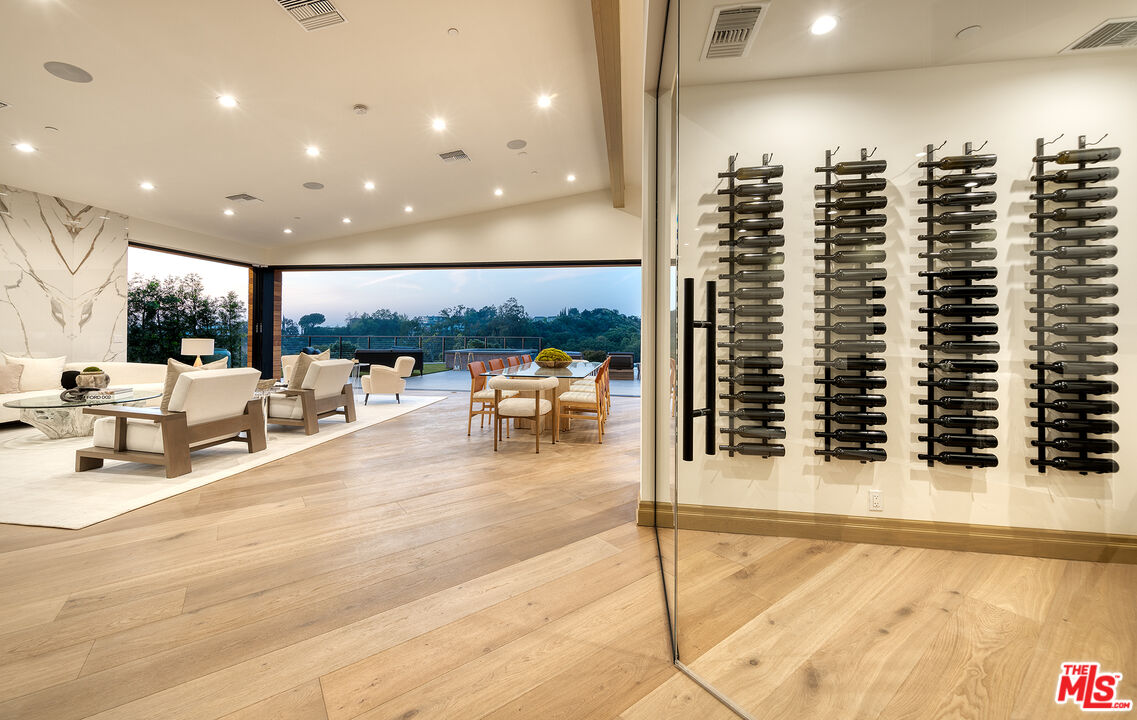 The Janice Place Estate is a contemporary masterpiece on a 28,950 square-foot lot oasis set within a secluded cul-de-sac just north of coveted Trousdale Estates. The newly built, 6194 square foot, single-story home boasts six en-suite bedrooms and nine bathrooms, surrounded by a lush and expansive backyard featuring an infinity pool and spa set over stunning canyon views. Past the sustainably harvested garapa wood facade with iron windows at the front exterior lies a 10-foot high, pitched oak ceiling entryway that leads to retractable floor-to-ceiling glass doors allowing the great room to seamlessly merge into the Eco-conscious backyard landscaping. The chef's kitchen features Meile appliances, Calacatta Borghini waterfall islands, custom-designed cabinetry and pantry, a full wet bar, and a glass-enclosed wine room. The media room sits beside a matchbook feature wall and easily converts from an expansive entertaining space or flows into an intimate home theater. Inside the spacious primary bedroom suite is a pearl onyx double-sided fireplace, his/hers baths; each with a sitting tub, steam shower, personal closet, and private patio. The five additional bedroom suites are perfect for family, guests, a private office, an indoor gym/yoga studio, or au-pair quarters. Outside is an entertainer's paradise with a custom barbecue station, multiple lounge areas, and a fire pit. This turnkey property is immediately ready with curated interior-designed furniture and a one of-a-kind art collection. Smart home technology, a Sonos sound system, and a camera security system complete this affluent lifestyle home.Interested in this Listing?