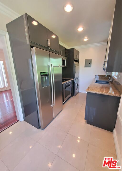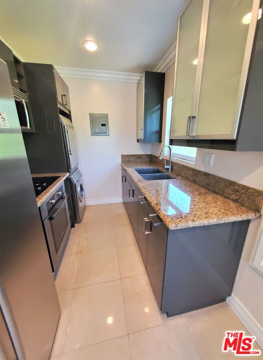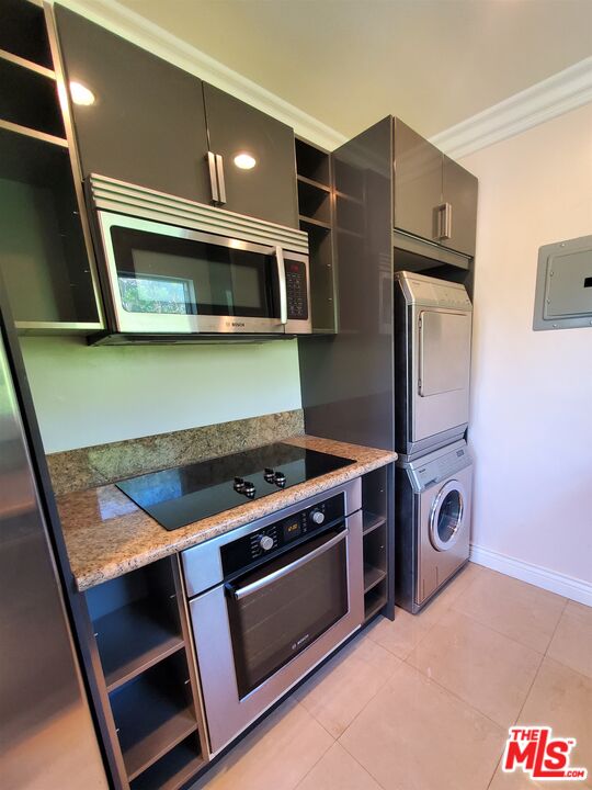 This charming second floor furnished unit is a spacious apartment in a classic Spanish style building. Recessed lighting, crown moldings, new lamented floors, recently painted. Remolded kitchen with top-of-the-line stainless steel appliances, refrigerator & range, stackable washer & dryer in the unit with updated bathroom. Off-street parking only, located in the heart of the prestigious Beverly Hills area by Wilshire Blvd. Centrally located to all of the magnificent Beverly Hills shopping, restaurants and hotels.