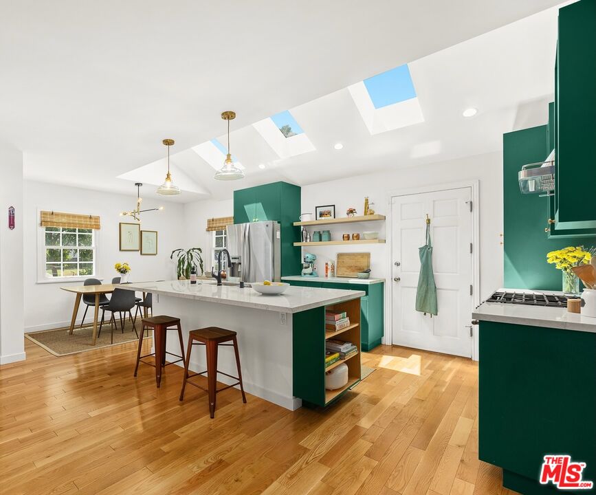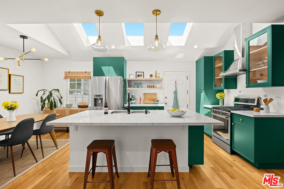 Welcome to this beautifully updated and bright 3 bedroom, 2bathroom home that blends modern comfort with timeless design. This move-in ready home features an open-concept layout ideal for both everyday living and effortless entertaining. The inviting living room showcases rich oak hardwood floors, a classic fireplace, and large picture windows that fill the space with natural light and offer views of the vibrant front garden. The sun-drenched gourmet kitchen is the heart of the home, complete with a spacious center island, stainless steel appliances, vaulted ceilings, and skylights that flood the space with light. Whether you're hosting dinner parties or enjoying quiet mornings, this kitchen was designed for connection and functionality. The expansive primary suite is a true retreat, featuring a generous wardrobe closet and a stylish en-suite bathroom with clean finishes. Two additional bedrooms provide comfort and flexibility, each with spacious closets and peaceful garden views. The hallway bath blends clean lines with ease, offering both a tub and a separate shower. Backyard is surrounded by mature trees and lush landscaping, ideal for outdoor dining, relaxing weekends, and barbecue gatherings. A custom removable sunshade adds comfort and makes this outdoor space feel like a true extension of the home. Additional features include central air and heat, recessed lighting, a newer roof, new hardwood flooring, and a large garage for extra storage or parking. This is more than a home, it's a feeling the moment you arrive. Your next chapter begins here.Interested in this Listing?