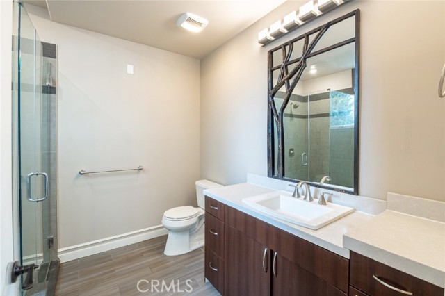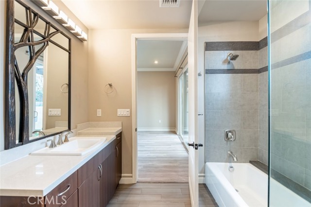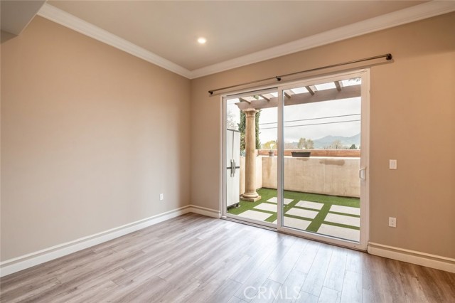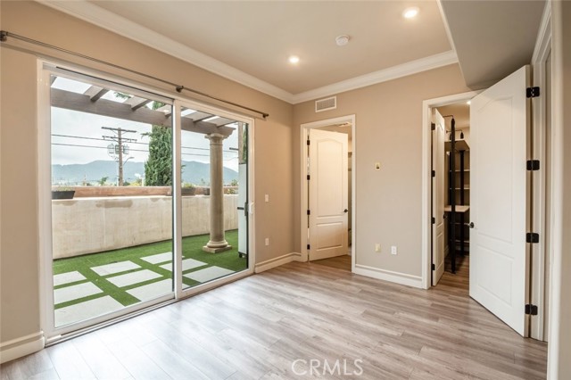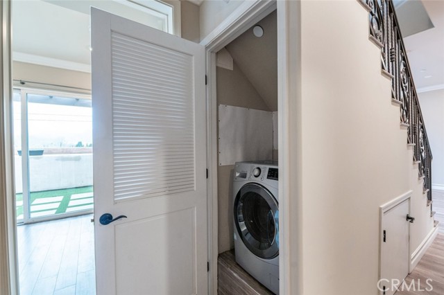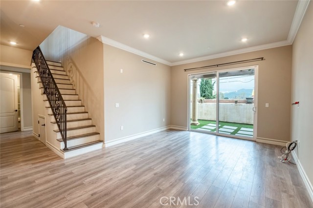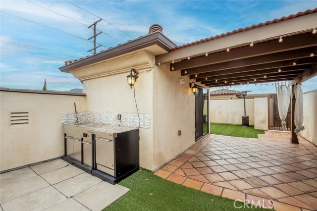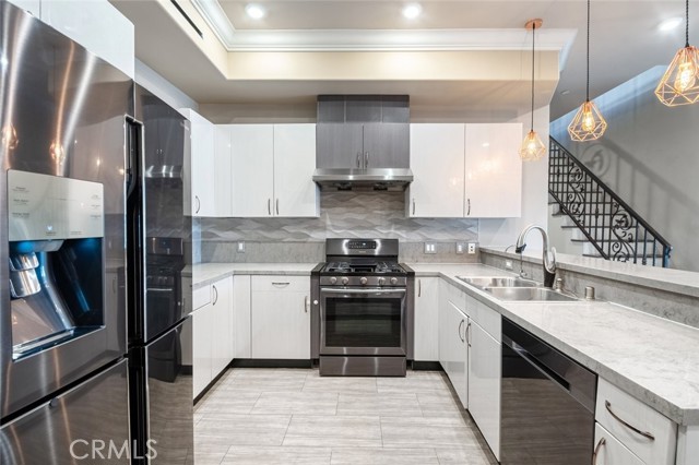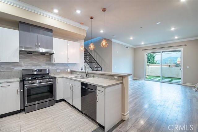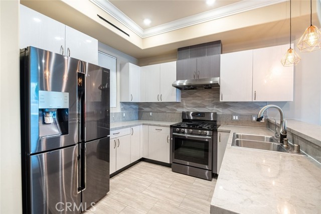 This stunning condo boasts three bedrooms and two bathrooms and is situated in a prime location in Burbank. Spread across several levels, the unit offers a spacious 1,100 sqft floor plan. As you enter the unit, you'll be greeted by a bright and airy living area. The kitchen is equipped with gorgeous countertops, modern cabinets, top-notch appliances (refrigerator and appliances all included), a double-basin sink, and bar seating that seamlessly connects to the rest of the room. Recessed lighting, baseboard and crown molding, and sliding doors that lead to the patio complete the elegant living room. Laundry is convenient with washer and dryer inside the unit. The bedrooms are generously sized, with plenty of closet space, and the primary bedroom features a walk-in closet with custom shelving and a private bathroom with a spacious shower and vanity. The private rooftop patio is perfect for entertaining and relaxing while enjoying city and mountain views. Secure parking is available with two spots in the gated subterranean garage. Additional features include: easy trash access, filtered water system, a ring security system, and wifi. The central location provides easy access to downtown Burbank, North Hollywood, Griffith Park, freeways, and other attractions. Less than half a mile to Grocery Outlet, 7-Eleven, and other stores.