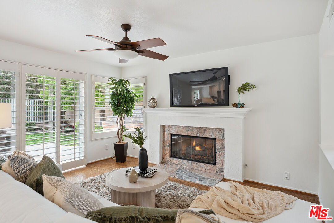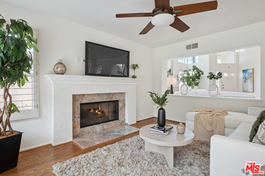 Tucked into a quiet cul-de-sac in the gated Calabasas Hills community, this well-maintained 3-bedroom, 3-bathroom home offers 2,262 square feet of thoughtfully designed living space on a landscaped 6,225 sq ft lot. Recently updated with fresh interior paint, all-new carpeting, and newly landscaped grounds, this light-filled home offers a layout that seamlessly blends everyday comfort with spaces designed for entertaining. Inside, classic engineered wood floors, vaulted ceilings, and soft natural light create a warm and welcoming atmosphere. The formal living and dining areas are enhanced by wide plantation shutters and a central fireplace, providing a stylish space for gatherings or quiet evenings at home. The kitchen features wraparound granite countertops, dual ovens, a breakfast bar, and a charming bay window that brightens the cozy breakfast nook. Just off the kitchen, the family room complete with its own fireplace opens directly to the private backyard, creating an effortless indoor-outdoor flow. Upstairs, the primary suite is set apart for added privacy and includes vaulted ceilings, a spacious walk-in closet, and an en-suite renovated bathroom with dual sinks, an oversized soaking tub, and a separate glass-enclosed shower. Two additional bedrooms share a Jack-and-Jill bathroom with separate vanity and shower areas, perfect for family or guests. Other highlights include a full-sized laundry room, a powder room for guests, and a direct-access three-car garage with built-in storage. The backyard offers a peaceful retreat with mature trees, a built-in BBQ, stone patio, grassy area, and newly refreshed landscaping ideal for dining, lounging, or weekend entertaining. Situated in the sought-after Las Virgenes School District and close to parks, hiking trails, the Calabasas Commons, and easy freeway access, this home blends timeless character with modern comforts in one of Calabasas' most desirable gated communities.Interested in this Listing?