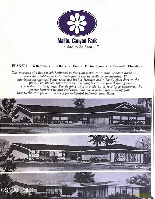 TENANT IN PLACE. 5BR+2BA on tax records, 1,850 sf Single Story on 13,537 sf lot in Prime location w/stunning VIEWS to SM Mountains & Sunsets in apex of cul-de-sac. Beloved Malibu Canyon Park's highly desirable sprawling single floor Model #501. The perfect home to start and later retire in! Serene flat lush yard of green serenity and tranquil meditation. No homes behind you. LVUSD Award Winning Schools and Lupin Elementary, nearby. Stores, restaurant Shoppes, Grocery Parks, dog parks, take Las Virgenes direct to ocean in approx 25min. Attached garageInterested in this Listing?