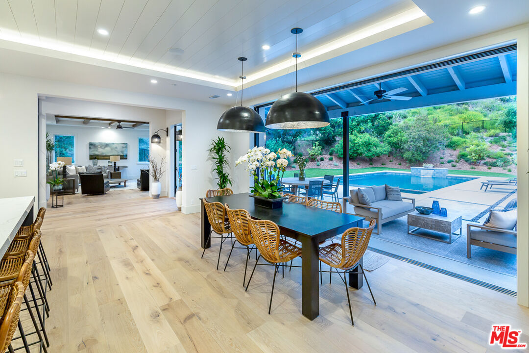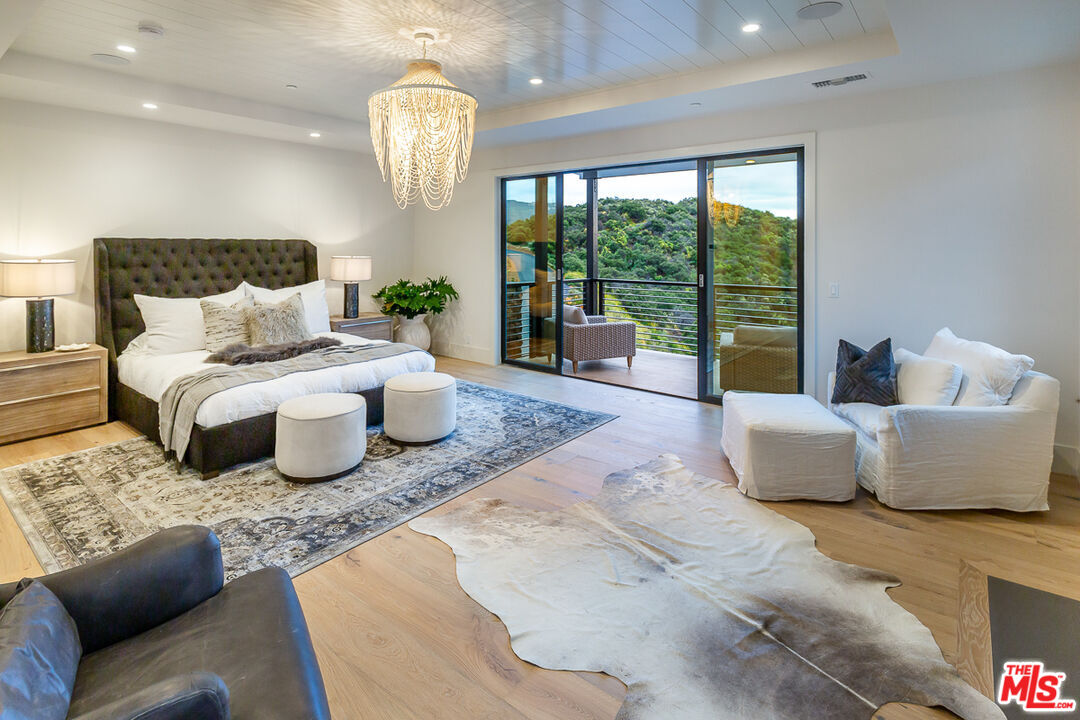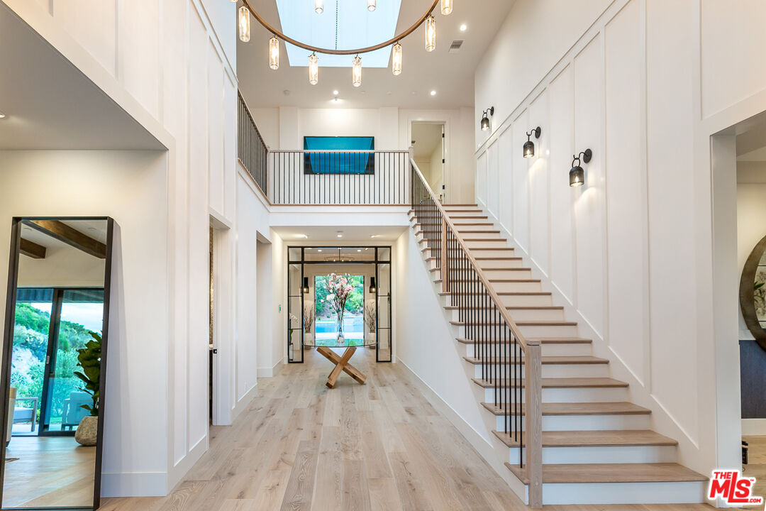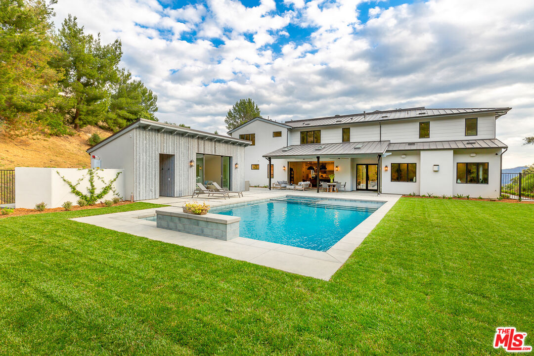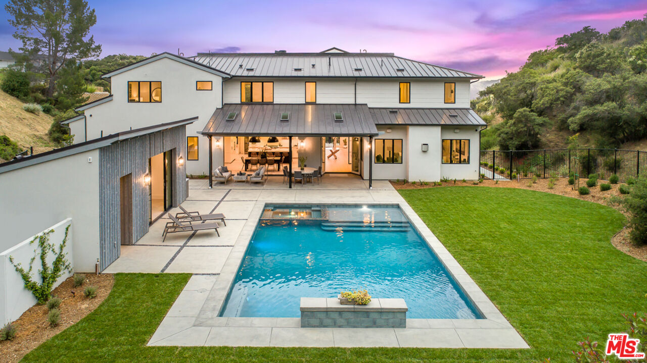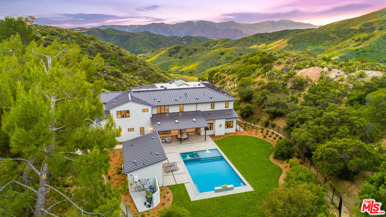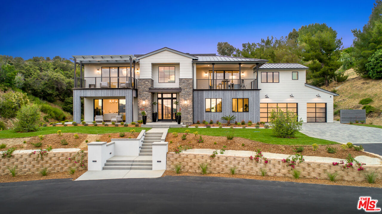 Nestled within the scenic rolling hills of Calabasas, this exquisite modern farmhouse redefines luxury living. Spanning over 2 acres of lush, flourishing land, this estate seamlessly blends contemporary elegance with natural beauty, offering an unforgettable retreat. From the moment you step into the striking foyer, you're captivated by the soaring volume ceilings, an abundance of natural light pouring through expansive windows, and the warmth of wide-plank white oak floors that flow throughout the home. The formal living room exudes sophistication, while the superb office space and inviting great room are anchored by a sleek, modern fireplace. The state-of-the-art kitchen is a chef's dream, boasting top-of-the-line Thermador appliances, a subway tile backsplash, shiplap accent walls, and a butler's pantry that conveniently opens to the outdoors; perfect for effortless year-round al fresco dining. Upstairs, discover three generously sized en-suite bedrooms and a versatile bonus room with an attached balcony. The primary suite is a true sanctuary, offering breathtaking views of the surrounding hills. The spa-inspired master bath features dual walk-in closets, a soaking tub, and a stunning double-sided shower that epitomizes luxury. The rear grounds are an entertainer's paradise, complete with a cabana featuring a private bathroom, an outdoor grill station, and a sparkling pool and spa. Whether hosting gatherings or enjoying quiet evenings under the stars, this property is designed for seamless indoor-outdoor living at its finest.Interested in this Listing?