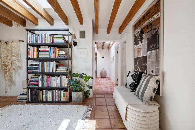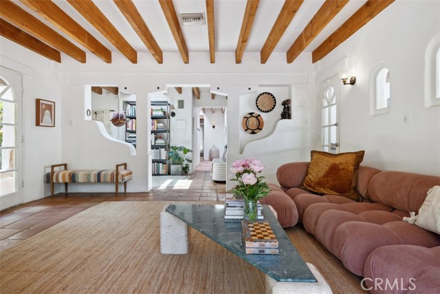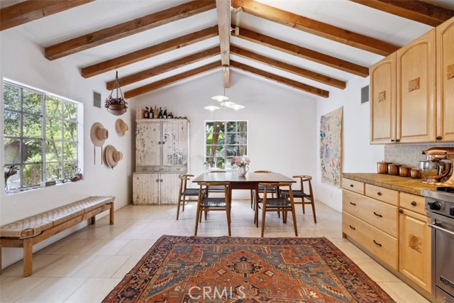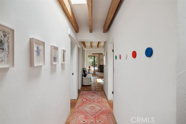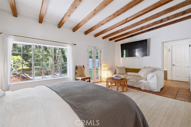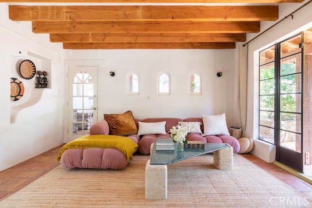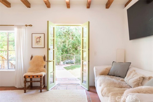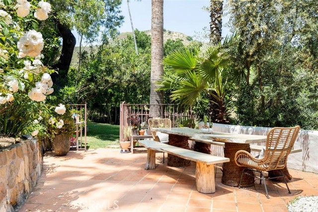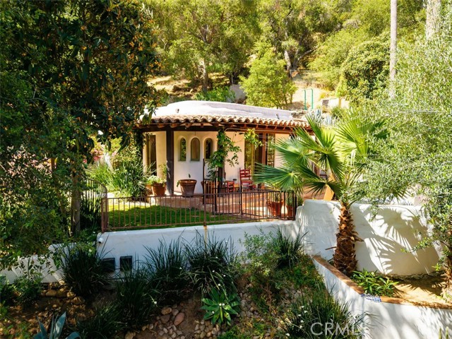A Zen Oasis: Your Private Spanish Villa Retreat Awaits Welcome to your own private sanctuary, a serene, light-filled Spanish villa-style home, nestled in the lush landscape of Topanga Canyon. Surrounded by towering palms, olive trees, and fragrant citrus, this one-of-a-kind property blends timeless architecture with peaceful, resort-style living. - Step into a designer's dream, where high exposed wood-beamed ceilings, great natural light, and indoor/outdoor flow define every space. Nearly every room opens to the outdoors through elegant French doors, leading to a stunning Saltillo tile patio perfect for entertaining and al fresco dining. The property features a large grassy yard, ancient rose, fig, pomegranate, passion fruit, lime, and cara cara orange trees- a dream setting to grow, play, and connect with nature. The expansive gourmet kitchen, outfitted with state-of-the-art appliances and generous eat-in space, is ideal for intimate gatherings and culinary exploration. A romantic master suite offers its own private patio and a spa-like master bathroom, a tranquil retreat within the home. Enjoy world-class hiking in your own back yard or head to the beach, only 15 minutes away. With two separate entrances, a private road, and ample parking, the layout offers privacy and expansiveness. Ideally located with convenient access to all Calabasas has to offer and top private and public schools within a 5-minute drive, yet feels like a world away. This serene and vibrant home is the perfect blend of California living and timeless tranquility. *Available furnished upon request