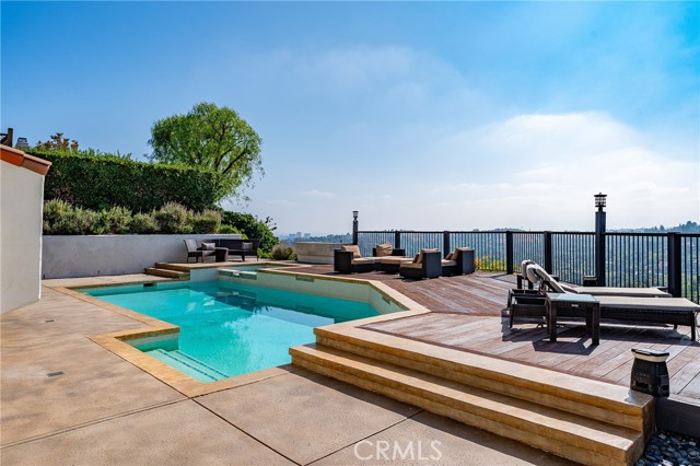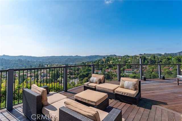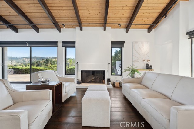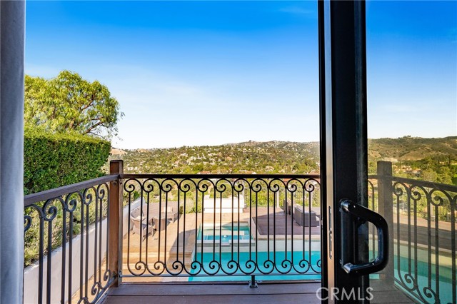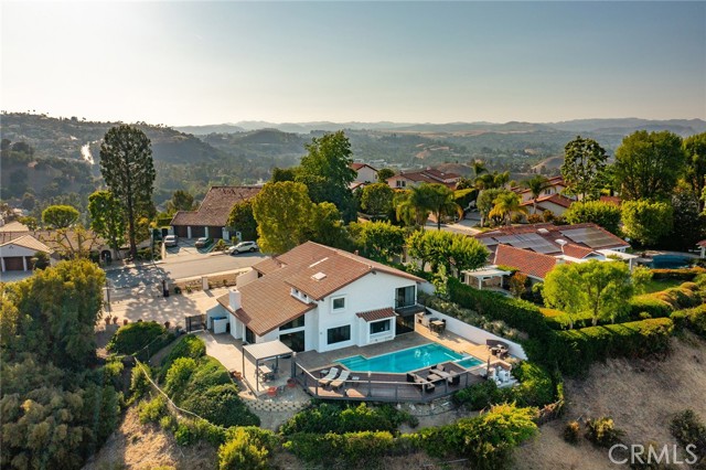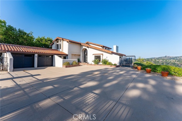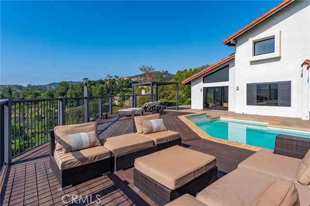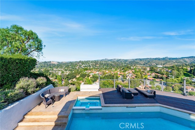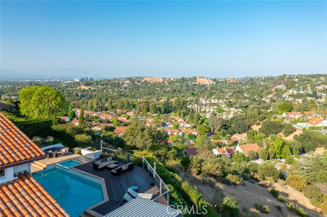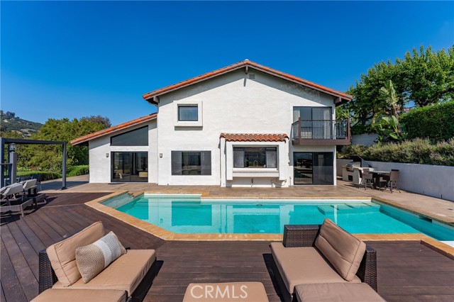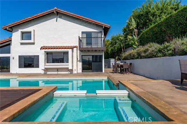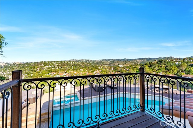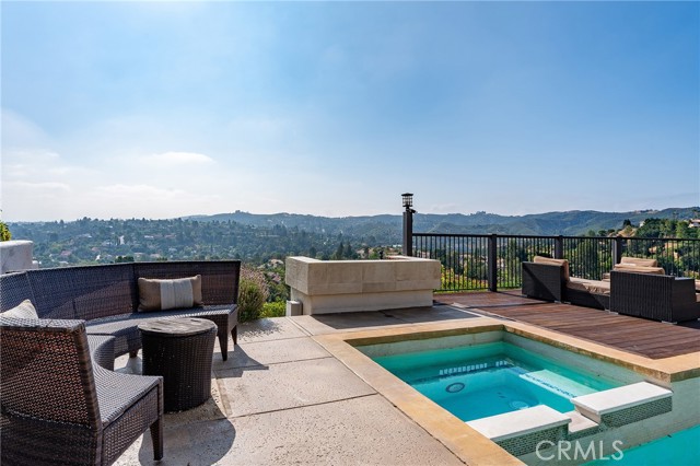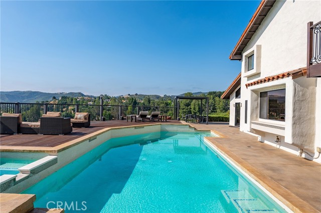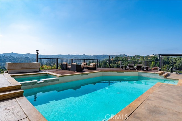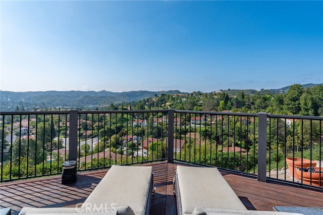 Nestled at the end of a cul-de-sac, on one of the most coveted streets in Calabasas Park, come see this updated, custom home with 4 bedrooms, 4 and 1/2 bathrooms, Office, and 180 degree city-view light. The VIEW captures the sunrise in the mornings and city-lights in the evenings. Designed as the original builder's personal home, this home has an arched entry, custom-stair banister, an open-wood beamed ceiling in the living, unique-aged espresso floors, new black-trimmed LED lighting, a built-in refrigerator, Thermador double-oven and more. Outside enjoy the eco-friendly landscaping, an oversized driveway that accommodates 6 cars, and security gates. Additionally, you will enjoy every aspect of the backyard-from the Custom BBQ Area and shaded pergola, to the large deck where you can show movie on the back of the house or stare out into the night. Plenty of space for entertaining any size group. Back inside, enjoy the view from the dining room, kitchen, living rooms(2) and Primary Suite. ALL bedrooms are ensuite. The Primary bathrooms plus the upstairs bathrooms were recently updated with stone-coated counters black fixtures, luxury tile floors, and solid wood doors. This home is a quality home with warm and inviting touches. 4 ensuite bedrooms, 1 lower office/living space with separate entry, plus views, pool, jacuzzi and deck.Interested in this Listing?