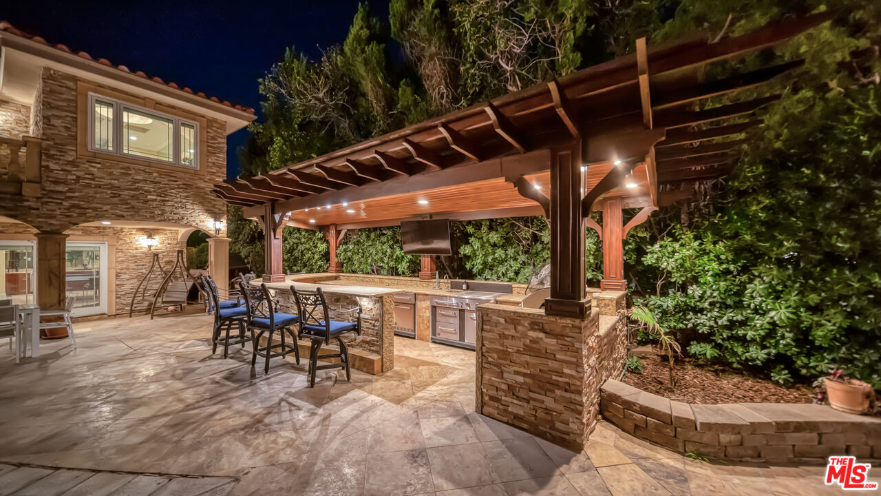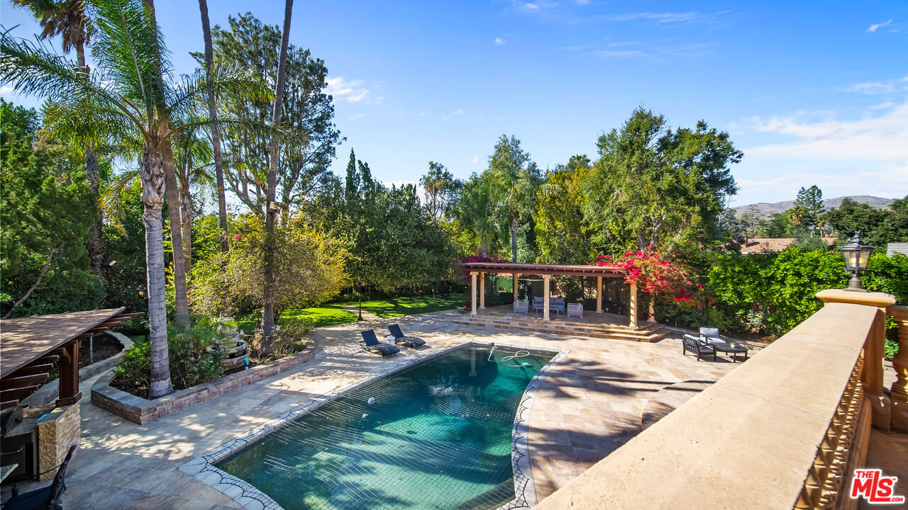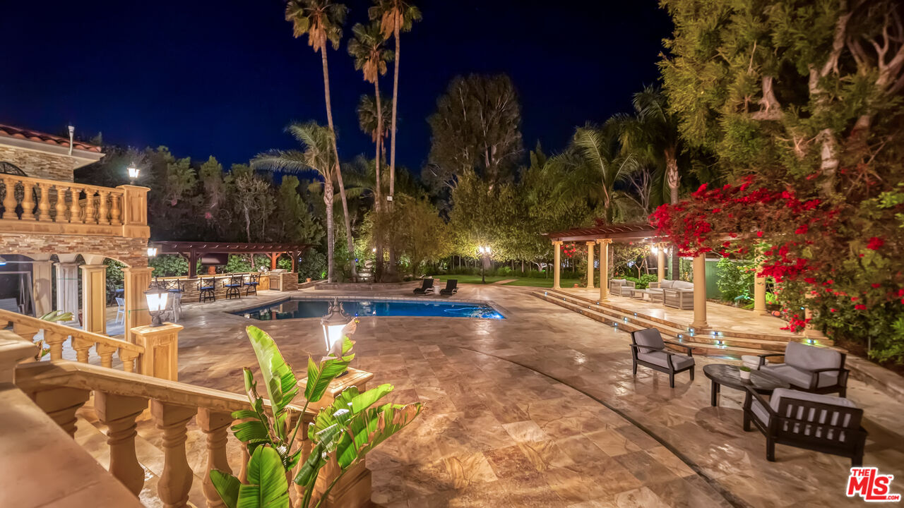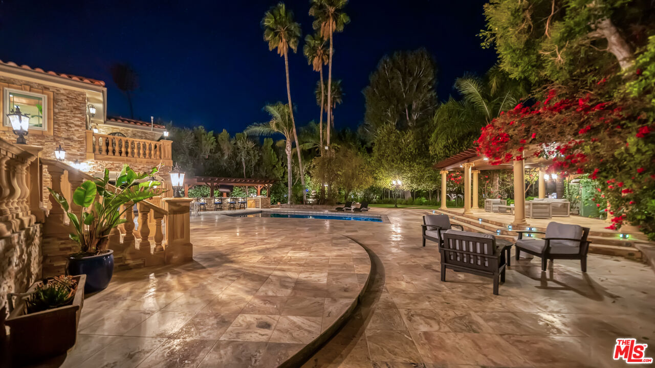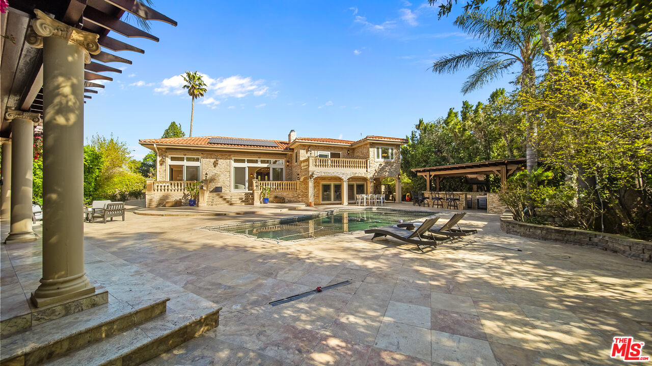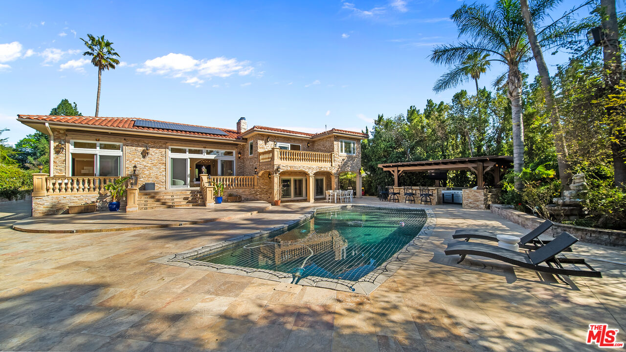 Exquisite Mediterranean Estate in Chatsworth! Welcome to this elegant, reimagined Mediterranean estate in the heart of Chatsworth! Nestled on an expansive 18,000+ SQFT lot, this luxurious 5-bedroom, 4-bathroom residence offers nearly 4,300 SQFT of living space, showcasing high-end finishes and impeccable craftsmanship.From the moment you enter, you'll be captivated by soaring ceilings, stunning custom arches, and gleaming marble floors bathed in natural light. The state-of-the-art chef's kitchen is a true masterpiece, featuring a 6-burner gas Wolf range, built-in custom Sub-Zero refrigerator, oversized eat-in island, skylight, dramatic marble backsplash, and stainless steel farmhouse sink. Designed for grand entertaining, the formal living and dining areas boast coffered ceilings, Roman/Greek columns, dazzling chandeliers, and an elegant White Carrara marble fireplace. A second living room on the lower level offers a full wet bar, Italian-inspired fireplace, and custom sliding doors leading to the breathtaking backyard.Step outside to your private oasis, where travertine floors, an expansive patio, and a full outdoor kitchen create the ultimate indoor-outdoor living experience. Take a dip in the sparkling pool, surrounded by lush greenery and resort-style landscaping. The luxurious primary suite features a private balcony, generous walk-in closet, sunken jetted tub, glass-enclosed shower, and dual vanities with a makeup counter. With two additional bedrooms upstairs and two on the lower level, this home offers ample privacy and space for family and guests. Owned Solar! A custom 3-car garage with a workbench and storage completes this extraordinary home. This estate truly has it all elegance, space, and resort-style living! Don't miss this rare opportunity! Schedule your private showing today! CLICK ON THE VIRTUAL TOUR LINK FOR A FULL VIDEO.Interested in this Listing?