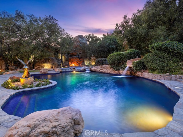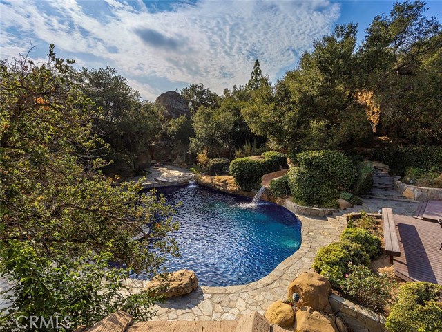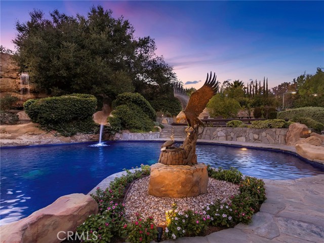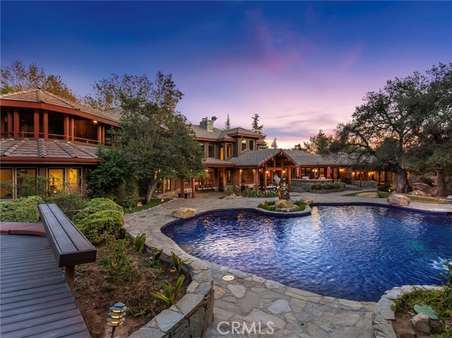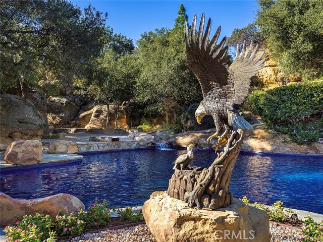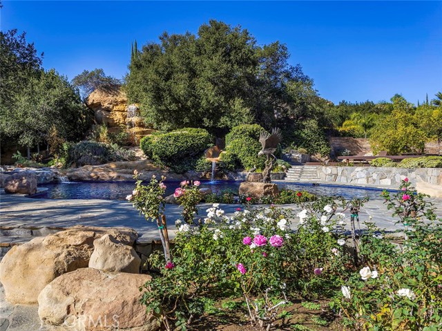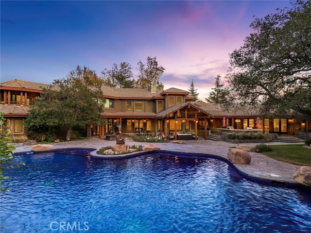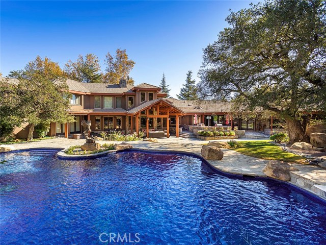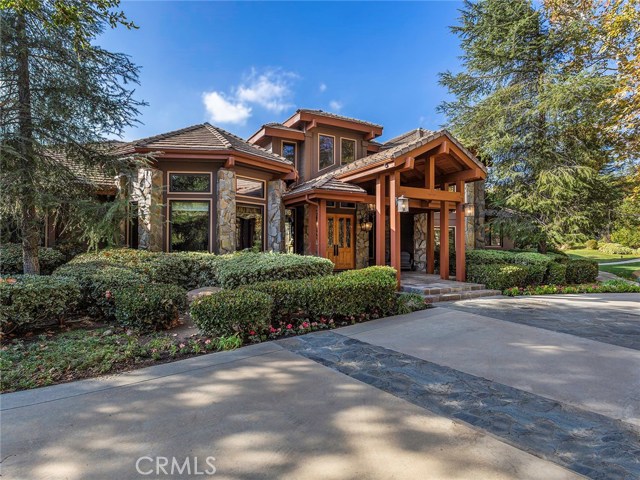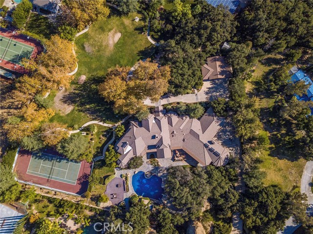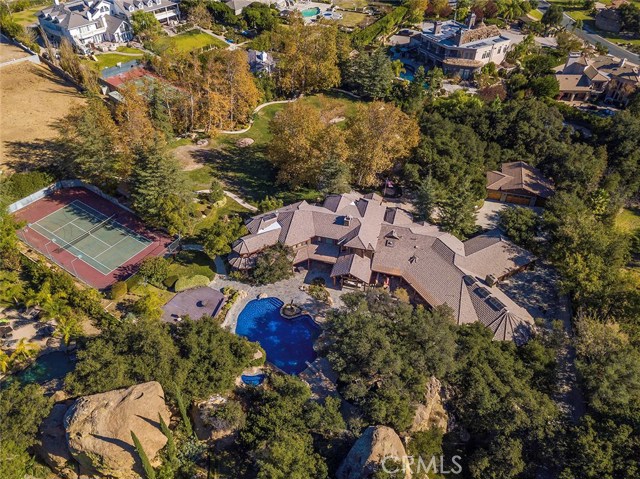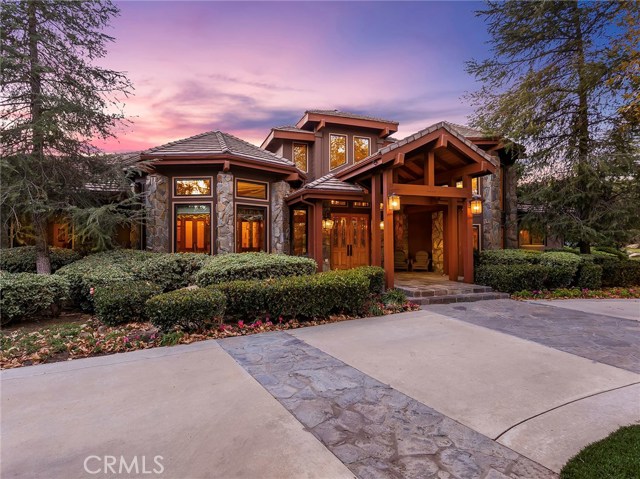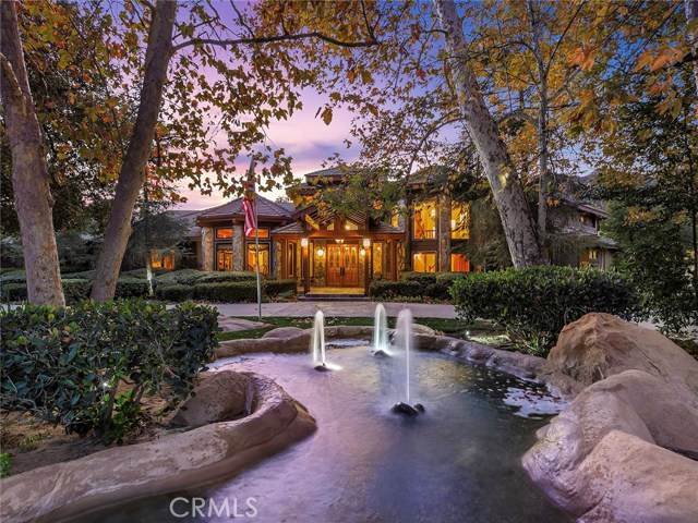 Vacation living all year round. Quiet and private. Set behind private gates & down a long driveway sits this amazing, 6 bed, 6 ½ bath, almost 8,500 square foot estate. Grand architecture with craftsman details. Enormous Great Room/Game Room featuring a wet-bar, built in entertainment center & double-sided stone fireplace with inglenook seating. The remodeled kitchen has granite counter tops, large center island, high-end stainless steel appliances, butler s pantry & large walk-in pantry. There is also a large wine cellar. The Owner's suite encompasses the entire upstairs & incl. built-in dual desks, stone fireplace, dual closets, large balcony & exquisite bath with dual vanities, jetted tub & steam shower. No luxury has been overlooked. The additional 5 bedrooms are on the main level & in each you will find a walk-in closet &en-suite bath. Garage parking for 8 cars plus additional RV and motorcycle parking. The approx. 2 ½ acre lot incl. a lighted N/S Tennis Court w/ covered viewing pavilion, fire pit, pitch & putt golf course,Dual BBQ Center & a truly breathtaking fully-tiled pool & spa crowned with a waterfall that cascades from natural rock formations. Truly a resort, no detail was overlooked, no amenity is lacking, and this estate is exceptional in every way. Coveted 24-hour guard gated neighborhood is convenient to 118-fwy, dining, and entertainment.Interested in this Listing?