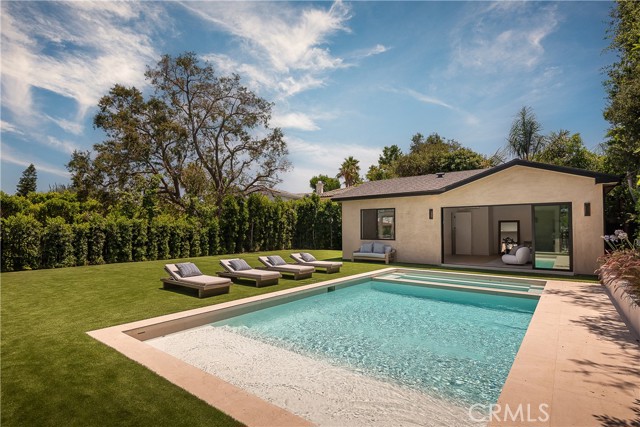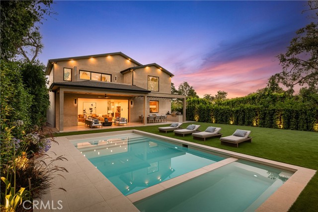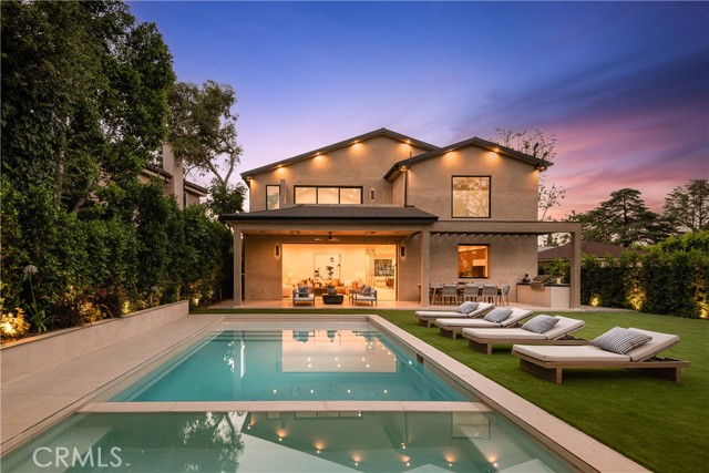 Unveil a breathtaking stunning estate in the coveted Encino neighborhood, where luxury meets meticulous design. This gated, new construction 6,500 sq. ft. residence on an 11,321 sq. ft. lot offers 6 bedrooms and 6.5 bathrooms. The open-concept interior dazzles with 10-foot ceilings, flooding the space with natural light. A sleek living room, anchored by a plaster-finished fireplace, flows into a refined dining area with a chic wet bar and wine cellar, ideal for grand gatherings. The chef s kitchen shines with Taj Mahal quartzite counters, bespoke white oak cabinetry, premium appliances, and elegant Watermark fixtures. The adjacent family room, with expansive sliding pocket doors, merges seamlessly with the lush outdoors. A state-of-the-art movie theater promises cinematic evenings at home. The primary suite is a haven, featuring a cozy fireplace, private balcony, and a vast walk-in closet. Its spa-inspired bathroom boasts dual vanities, dual water closets, and a luxurious dual shower and freestanding tub combo. The outdoor oasis beckons with a gleaming pool and spa, covered patio, open trellis, and built-in BBQ, perfect for al-fresco entertaining. A versatile 1BD/1BA ADU offers space for guests or additional use. Elevated by a Control4 smart system, surround sound, and security cameras, this home blends sophistication with technology. Nestled in the esteemed Encino Charter School District, near premier shops, dining, and freeways, this residence redefines upscale living.Interested in this Listing?