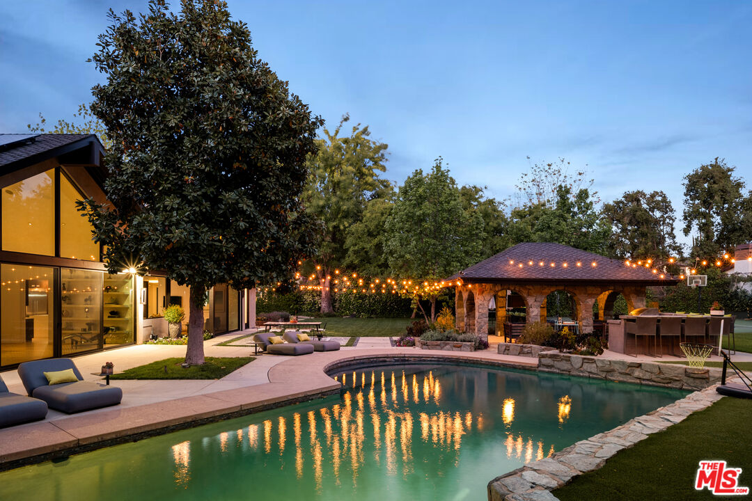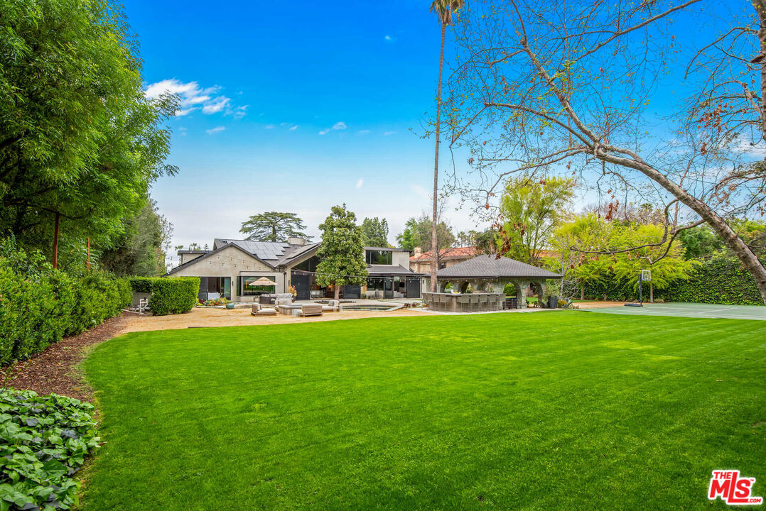 The Magnolia Estate, in the prestigious Amestoy Estates of Encino, conveys a captivating allure. A pancake-flat 49,000 sq. ft. lot and an absolutely turn-key gorgeous gem of a house. This is why the Westside buyer moves to the Valley - land! Impressive wide frontage, gated, and set back off the quiet cul-de-sac street. Alluring architecture that immediately announces the unique character of this stellar modern masterpiece. Warm natural woods with soaring beams and floor to ceiling windows that expose the massive flat yard that spans out in jaw-dropping fashion. The distant basketball court, the serene vegetable gardens, the inviting fire pit, the sparkling pool, and the covered outdoor dining all deliver the finest in outdoor living. The single-story floor plan with a main level master suite, along with four other over-sized secondary bedrooms, make this a coveted long-time asset for any future re-sale. The upstairs movie theater, gigantic rumpus room, gym/yoga studio, powder bath, and a full en suite guest bedroom complete the compelling package of a true family compound. Close to all the great private schools, after-school sports, and easy shopping. RARELY is such a gem presented that can literally take a lifetime to find or build.Interested in this Listing?