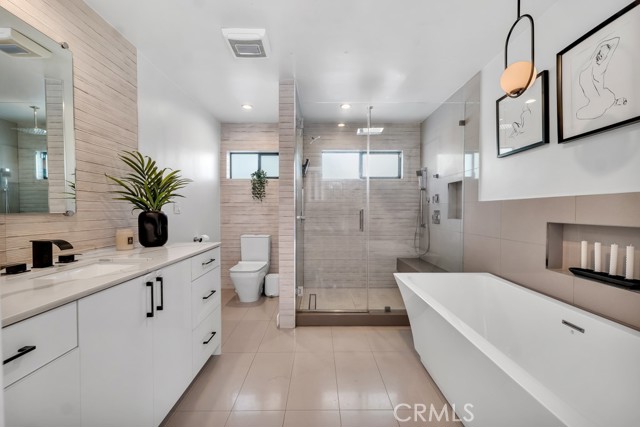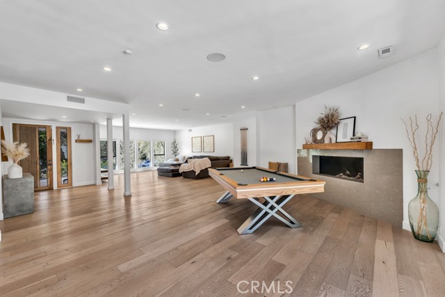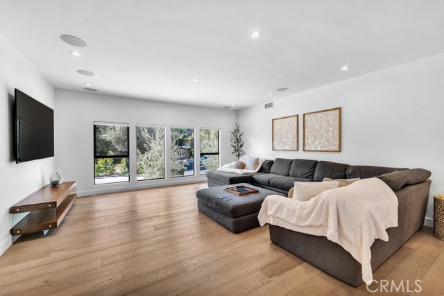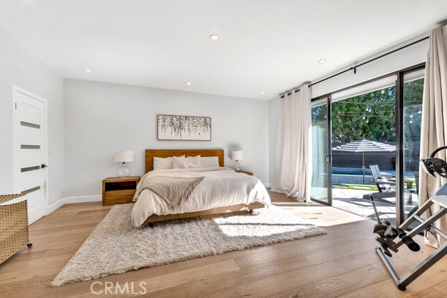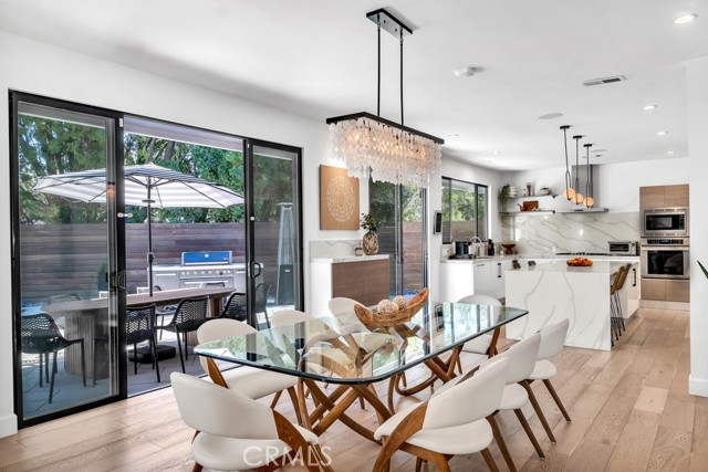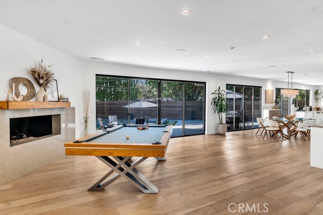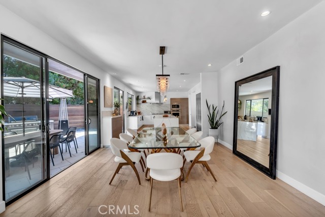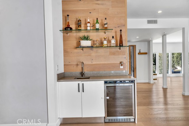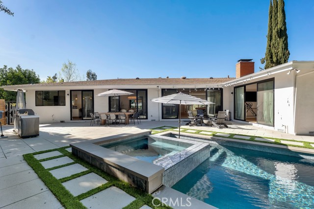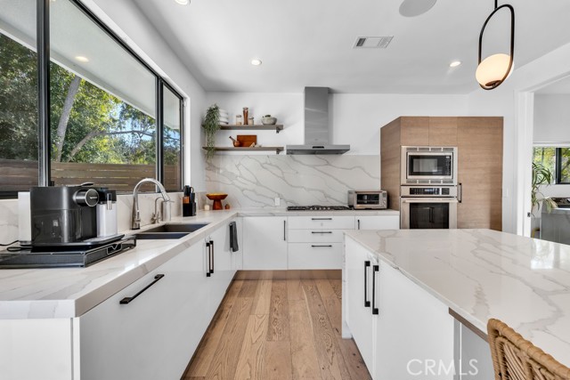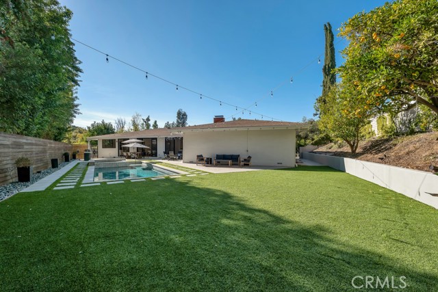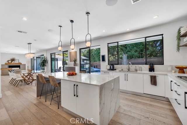 This stunning, single-story mid-century modern home in Lake Encino was fully remodeled in 2018, with additional upgrades completed in 2021. Featuring an open-concept floor plan, the home boasts high ceilings, hardwood floors, and elegant Italian Armony cabinetry throughout. The expansive great room includes a bright living room area with a wall of windows, a family room with a fireplace, and a dining area complete with a wet bar and a wine/beverage fridge. The modern kitchen is a chef s dream, showcasing quartz countertops, a waterfall-edge center island with bar seating, and premium Thermador appliances, including a refrigerator, oven, range, microwave, dishwasher, and hood. The luxurious primary suite features a custom walk-in closet and a spa-like bathroom with a stall shower and a freestanding tub. Two spacious bedrooms share a Jack-and-Jill bathroom with dual sinks, a shower, and a tub, while the en-suite fourth bedroom is perfect as an office or maid s quarters. Sliding glass doors in multiple rooms lead to the entertainer s backyard, remodeled to include a pebble-tec pool and spa with updated equipment. The outdoor space also offers a large artificial turf lawn, new pavers, and new fencing. Additional features of the home include a powder room, a spacious laundry room, dual-zone HVAC, a tankless water heater, and an attached two-car garage.Interested in this Listing?