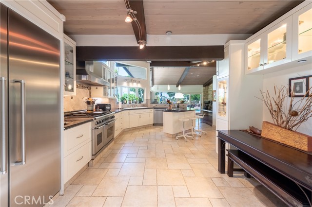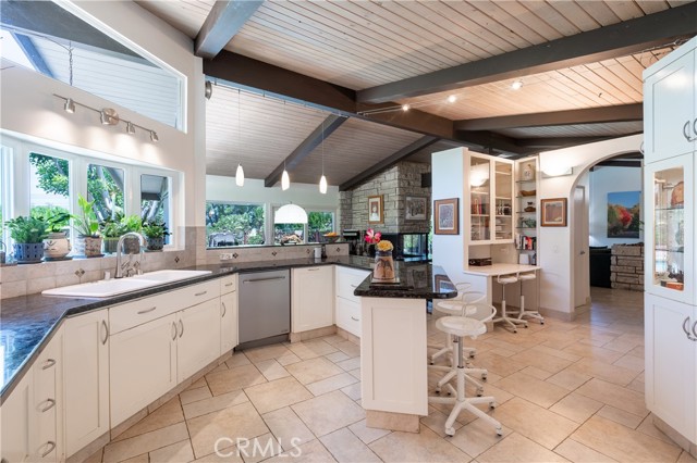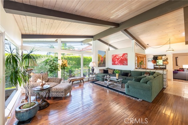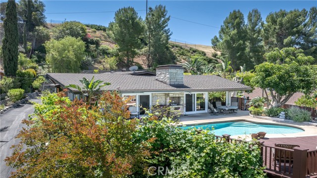 Tucked away up a long private driveway, this mid-century modern view home offers style, privacy, and serenity. Step inside to find an inviting entry with pendant lighting, beadboard beamed and vaulted ceilings, rich wood floors, and walls of glass that frame lush greenery and open out to the views and pool evoking the feel of a peaceful retreat. A Terrazzo and stone-clad two-way fireplace connects the living and dining areas, where more glass sliders bring the outdoors in and provide the best in the quintessential California entertaining lifestyle. The open floor plan showcases original mid-century modern details throughout with both the stone and brick entryway and fireplace containing fossil relics and rooms with angled windows. The spacious kitchen is a cook s dream, featuring white glass-front cabinetry, stone counters with tiled backsplash, a breakfast bar, and a built-in desk with bookshelves and a pantry with pull-out shelves. High-end appliances include a Dacor stovetop, double oven, and dishwasher. French glass doors open to a pergola-covered patio surrounded by lush plantings perfect for dining or relaxing. The primary suite includes a walk-in closet, ceiling fan, and a bathroom with marble counters, walk-in shower, and a vanity. Secondary bedrooms with shutters and walls of closets are large and one is currently set up as an office. A full bath with dual sinks and exterior access makes it ideal for poolside use. The backyard is a true retreat with a viewing deck, sparkling pool, both covered and open patios, and a built-in grill an entertainer s dream. Located within the Lanai School District and the many shops and restaurants that dot Ventura Blvd., with easy westside access.Interested in this Listing?