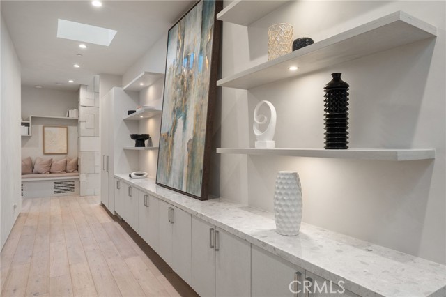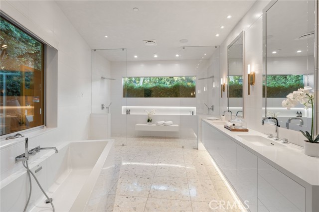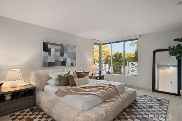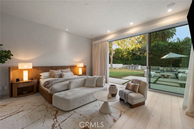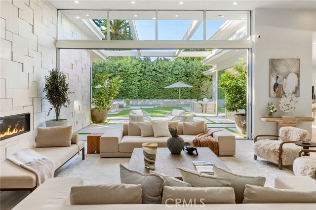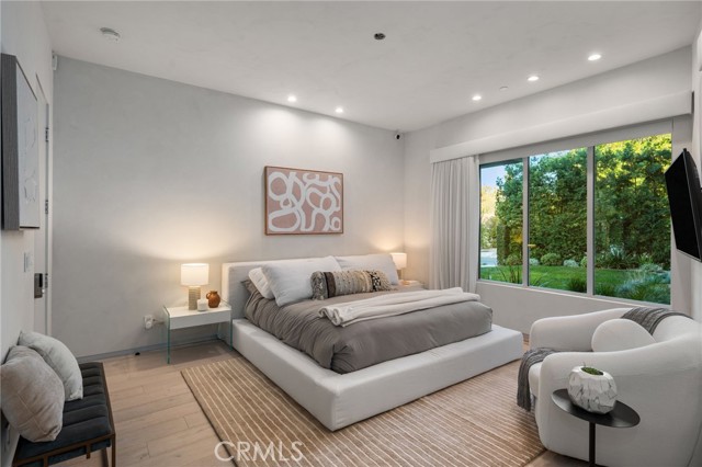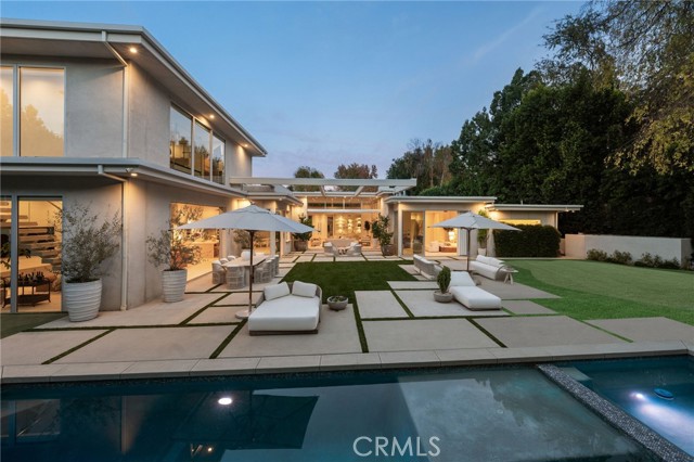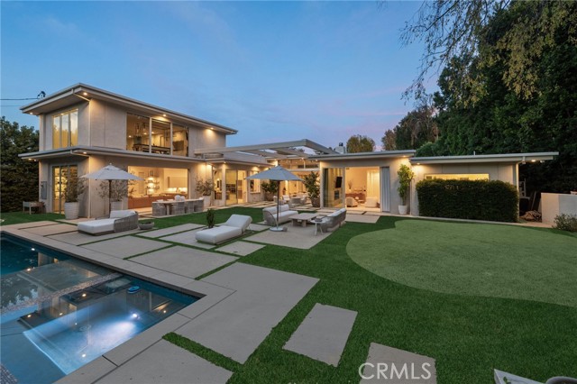 Set back from the street, behind private gates, this newer-construction mid-century modern masterpiece sits on a sprawling 18,000+ sf lot in prime Encino. Double doors open to reveal a warm and inviting interior, showcasing natural woods, imported stone and dramatic floor-to-ceiling walls of glass that bathe the space in natural light. Enjoy a spacious open-concept floor plan that is accentuated by lofty 14 ceilings and gorgeous oak flooring. A culinary enthusiast's dream, the gourmet kitchen is equipped with high-end Miele appliances, a massive island with a breakfast counter, butlers pantry and wet bar with a pass through window to the patio. Both the living and family room have an oversized Fleetwood pocket door that disappears into the wall, seamlessly extending your living space outside for effortless entertaining and a true indoor-outdoor lifestyle. A sun drenched formal dining room and glass-enclosed office complete the main living space. Spread throughout the first floor you ll find four en-suite bedrooms, including a stunning primary suite that features dual walk-in closets and a spa-inspired bathroom, complete with a soaking tub, large rainfall shower, smart toilet and double vanity. A sleek floating staircase leads you up to an additional ensuite bedroom, currently utilized as a fitness room, the space boasts a sauna and steam shower. Enveloped by mature privacy hedges, the spacious backyard retreat is a serene escape designed for both relaxation and entertaining. Highlights include a sparkling pool/spa, sports court, putting green, outdoor kitchen, built-in fire pit and ample patio space for al fresco dining. Additional amenities include a laundry room, smart home features like integrated speakers and motorized blinds, a state-of-the-art security system, plentiful storage space and a two-car garage with an EV charging station. This prime South of the Boulevard location is in the heart of Encino, within an excellent school district and just moments away from everything the Valley and Westside have to offer.Interested in this Listing?
