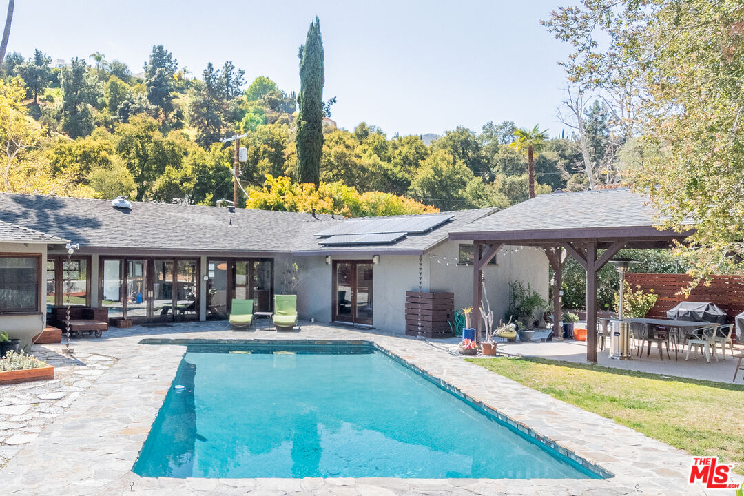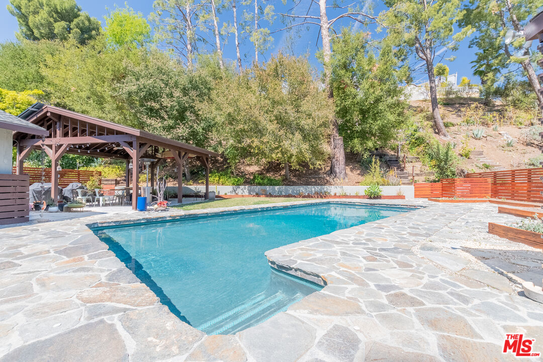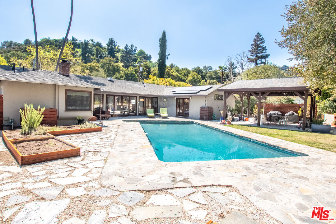 Welcome to this stunning freshly painted midcentury3 bedroom 2.5 baths residence located south of the boulevard in the prestigious Encino neighborhood. Minutes away from the restaurants on Ventura Boulevard, Whole Foods, Gelson's market, and a short 3 minute drive to sought after Lanai Elementary school, the location offers easy access to anywhere in the valley and a scenic drive over the hill to the Westside. Beautifully landscaped drought resistant front yard and stone stairs leading to the front entrance complete the curb appeal of the home. Upon entering the formal living room a wall of windows bring the outdoors inside with expansive views of the pool and backyard. The open floorplan has space for large furniture or multiple seating areas around the fireplace. Modern sleek design kitchen features abundant lower cabinets with soft close drawers, kitchen island, Caesarstone countertops, stainless steel Viking appliances, Bosch dishwasher, and a built in pantry. Right off the kitchen, you will find a formal dining area with more storage cabinets and a family room with built-in shelving. There is a large powder room available for your guests.Spacious master bedroom suite is located in the left wing of the house away from the other two bedrooms and will fit a king size bed and ample room for additional furniture. It features vaulted ceilings, walk-in closet, ceiling fan and french doors opening up to the backyard. En-suite master bathroom comes with a dual vanity and a glass walk-in shower. The other two large bedrooms are on the opposite side of the house and share a hallway bathroom with a dual vanity and shower over tub. There is a separate laundry room that also can serve as a mud room with extra storage space.Large entertainer's backyard with a sizeable heated pool, and built-in garden beds with irrigation. Spacious seating area under gazebo providing shade during the hot summer days and fairy lit dining at night. There is also space for a storage shed in the side yard. Driveway parking available for multiple cars. The home is well maintained and has many more upgrades and features, such as hardwood floors throughout the house, plush carpet in the bedrooms, recess lights, dual pane windows, central A/C and heating, ready to use plug for electric cars and solar panels! All appliances are included.Interested in this Listing?