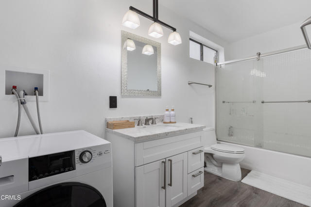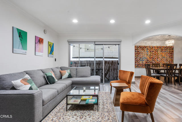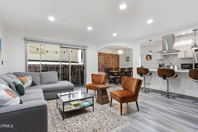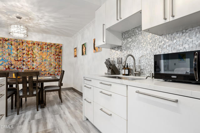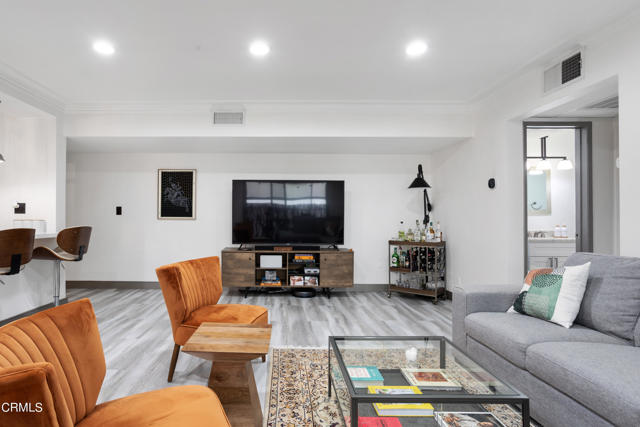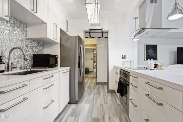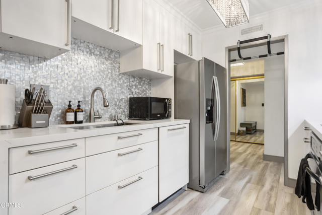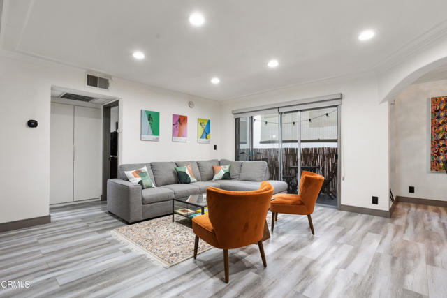 Welcome to this modern and updated one bed/one bath corner upper unit. This 792 sq ft unit has a great floor plan with a light and bright living room that leads you to a private balcony. The large bedroom has a walk-in closet. The kitchen is absolutely beautiful with white cabinets, a gorgeous silver aluminum backsplash, induction cooktop and shabby chic counter tops. The bathroom has a washer/dryer combo installed, updated vanities, and a bathroom light/fan with bluetooth speakers. Walking distance to the Americana, Glendale Galleria, Fashion Center, Wholefoods, Trader Joes, and more!