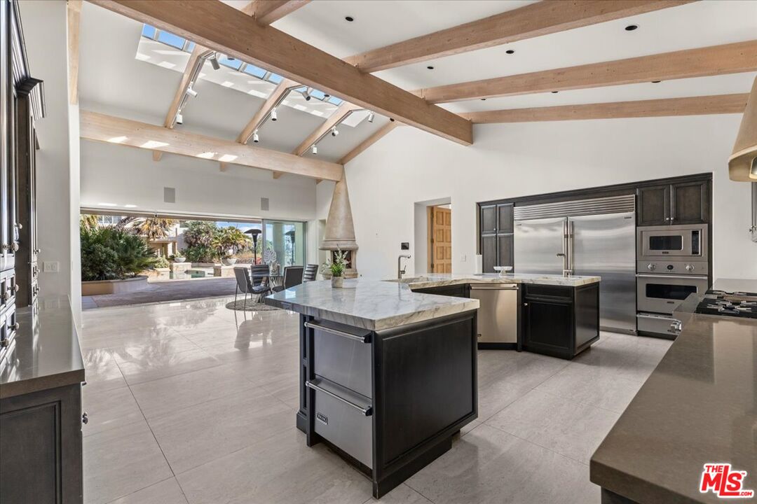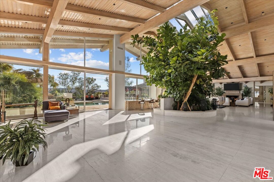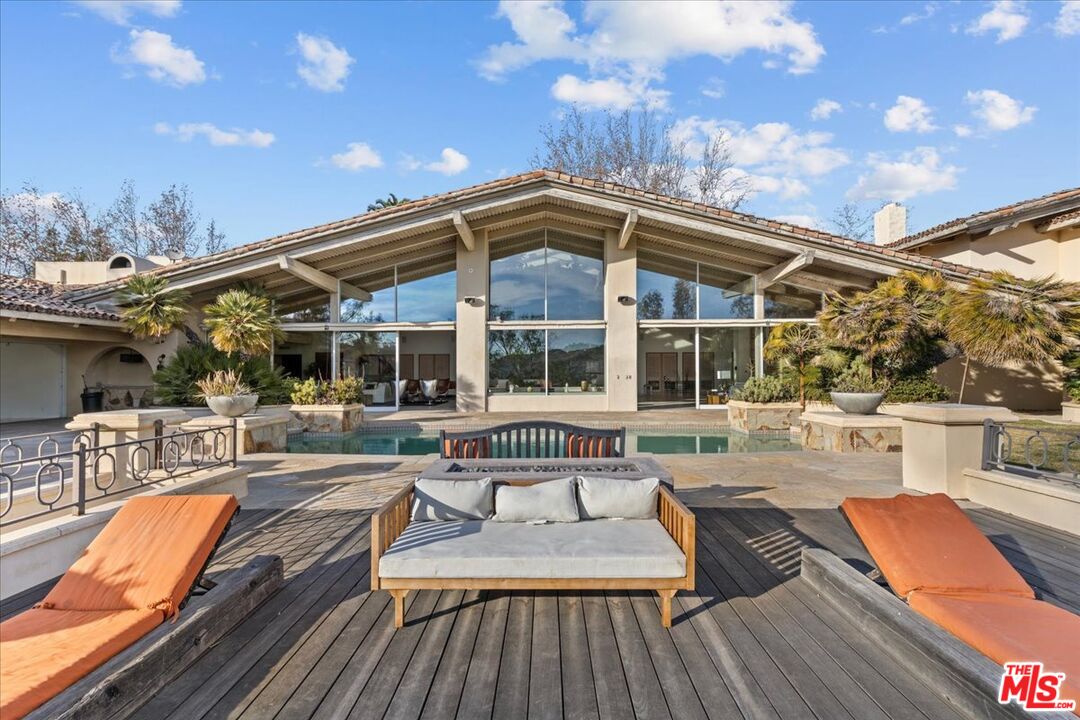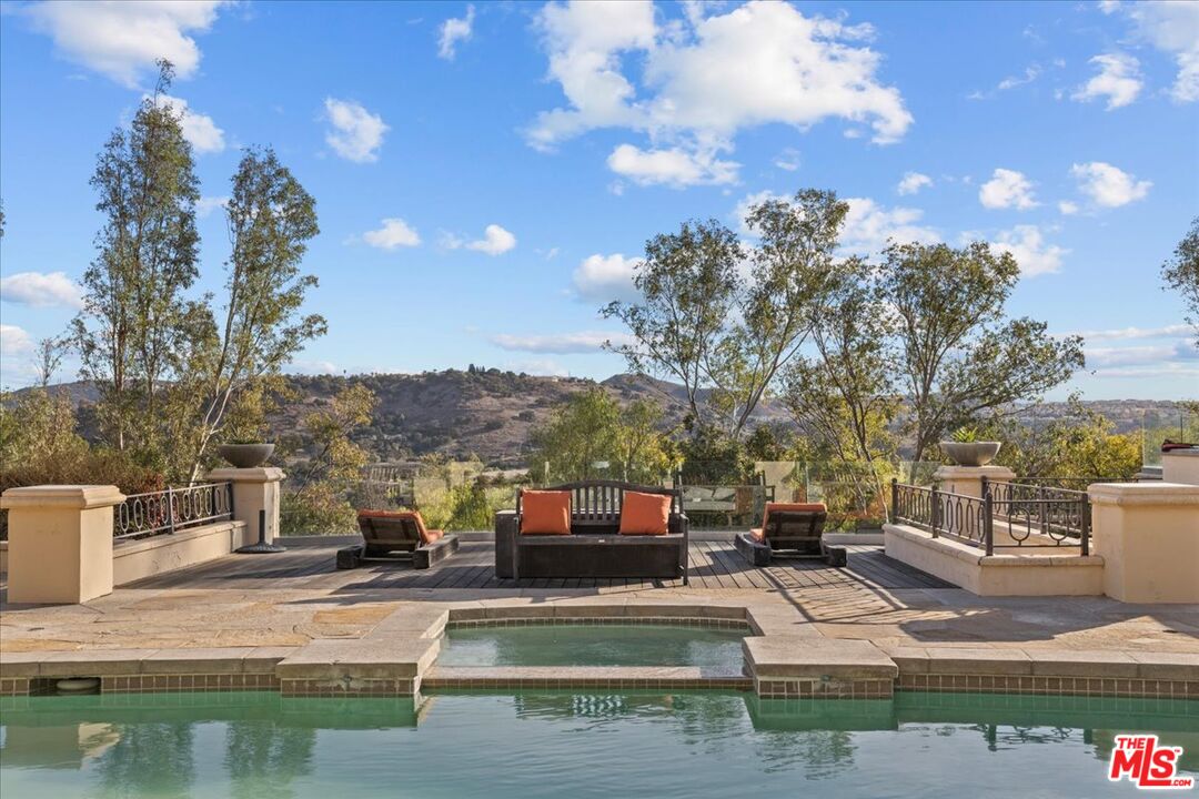 Sited on nearly an acre and a half in the exclusive Ashley Ridge enclave of guard-gated Hidden Hills, this 16,000 SqFt custom designed estate is complete with impeccable details and a backdrop of canyon vistas. A private circular driveway and manicured lawn are canopied in mature trees, welcoming you to the middle of a three-peak architectural build through a grand arched doorway. Bespoke wooden ceilings laid in oak beams contrast the sleek limestone flooring to frame walls of glass, showcasing an irreplaceable view. The craftsmanship of the highest regard detail each room through grand open skylights, perfectly spaced and flushed custom lighting, carved wooden doors, built-in shelving, marble fireplaces, and deep green indoor landscaping with gorgeous mature trees bringing a balance of vibrance and life to the home. The open floor plan draws you through to the picturesque windows lining the rear wall, featuring an artisan bar seating five in length, with a sink, refrigerator, temperature-controlled wine storage, and marble countertops. To your right, the chefs' kitchen and breakfast corner is bathed in natural light from a center peak skylight and brought to life by dark wooden cabinetry and island paneling, matching stone countertops and backslash, and a built-in floating fireplace curated in the same clay as the kitchen hood above the 7-range burner stove. Top-of-the-line stainless steel Viking appliances, dual ovens, a warmer tray, and dual sinks are all built in to create both a luxurious and functional space. The main level is complete with a formal dining room, a lounge with a wet bar and fireplace, an ornate mahogany office/library, and two en-suite bedrooms. Ascend upstairs to the royal primary wing offering gorgeous wooden flooring and beams, a fireplace, a separate lounge room with a kitchenette, a custom double-sized walk-in closet, and a spa-like bath finished in marble flooring, bright windows, an open skylight, a relaxing sitting tub and glass standing shower. Outside, the upper deck is anchored by a sparkling pool and spa, lush foliage, a fire pit and veranda balcony, and a separate covered loggia with a seating area with a TV, fireplace, and a full outdoor kitchenette, cooktop, and Viking grill. Explore down the stairs to a grand flat yard space, a full-sized basketball court, a wooden walkway to the side yard with raised beds for gardening plants and vegetables, and a playground, all overlooking the Santa Susana Mountain Range. The owner worked for over two years closely with the Architectural and Design firm, Iqosa, to develop creative yet meticulous plans totaling 19,000 SF should the new owners like to explore a reimagined project in both architecture and interior decor. The refreshed plans include 9-bedrooms, 2-service quarters, a full theater, gym, spa, and a redesigned chef kitchen all submitted and approved with the city of Hidden Hills and HOA. This sophisticated estate is boasting of exclusivity, design, and quality while being equipped with amenities for both families and an entertainer and sited in one of the safest, most coveted school districts and communities in the country.