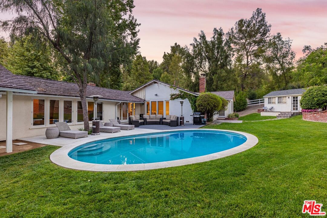 Drive up your tree lined U shaped driveway to your very own tranquil ranch estate offering 1.6 picturesque acres in the prestigious guard-gated community of Hidden Hills. Nestled at the end of a private cul-de-sac the property provides exceptional privacy. The home features light-filled living spaces with hardwood floors, high ceilings, and fireplaces throughout. Floor-to-ceiling doors open to a seamless indoor-outdoor flow, leading to gorgeous outdoor entertaining area that spans from a pristine front courtyard to lush equestrian grounds and a landscaped backyard with a heated pool and Guest House. A nearly 800-square-foot guest house and pool house provide added flexibility on this 5 -bedroom, 5-bathroom estate. An idyllic lifestyle awaits in one of L.A.'s most exclusive communities. Inquire about the option to acquire the neighboring estate and create your ultimate compound.Interested in this Listing?