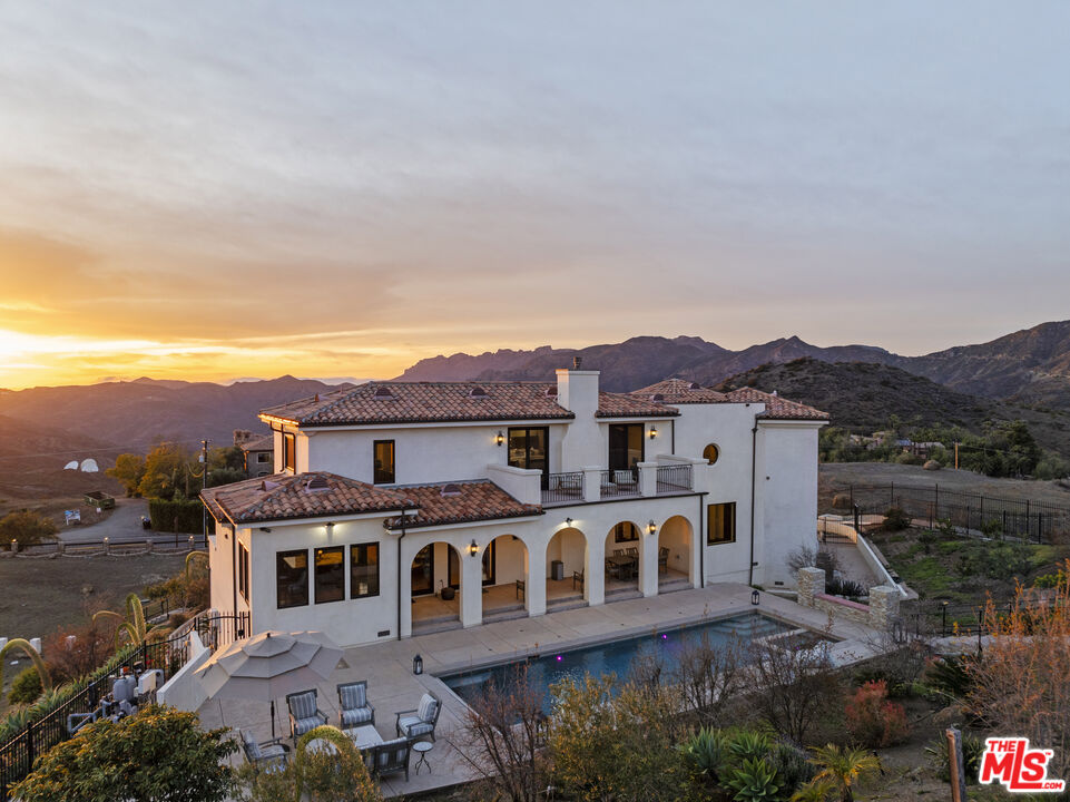 Welcome to a luxurious oasis in Malibu's prestigious wine country! This stunning Spanish Colonial Revival estate spans approximately 2 acres on a commanding promontory, offering breathtaking mountain, canyon, and ocean views. The property features a lavish pool, spa, and an elegant patio perfect for grand entertaining. Inside, the main living level boasts expansive view windows, soaring beamed ceilings, and rich distressed hickory hardwood floors. The custom chef's kitchen includes top-tier appliances, a spacious walk-in pantry, breakfast bar, and separate dining area. The main entry level has a versatile office/bedroom, stylish powder bath, and a generously proportioned second bedroom. The opulent primary suite is a private sanctuary with a cozy fireplace, exclusive viewing deck, luxurious shower, and dual walk-in closets. The Estate provides ample space for horse facilities or additional structures, and the expansive 3-car garage and driveway can accommodate up to 10 vehicles. Experience refined living in this magnificent Malibu Estate, where every detail exudes sophistication and elegance. Make it your own and indulge in unparalleled luxury.Interested in this Listing?