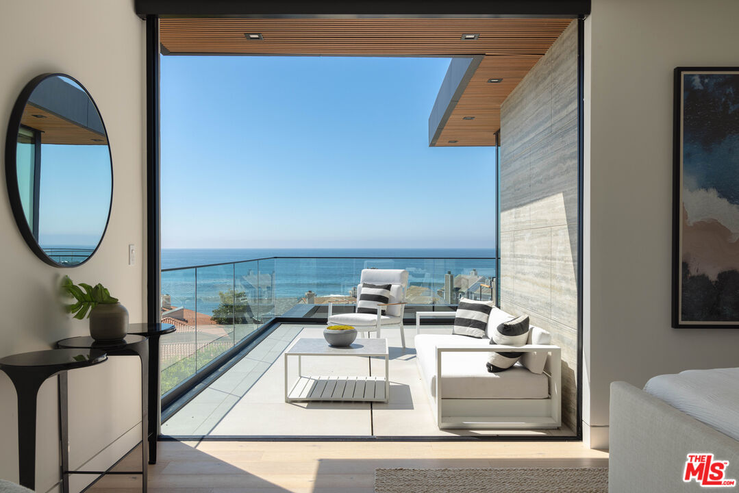 New Construction in Malibu. Located in the private, gated enclave of Malibu Colony Estates, this stunning home offers breathtaking ocean views and contemporary design by renowned architect Douglas W. Burdge, AIA. One of just four homes in this prestigious community, it sits on approximately 1.3 acres with five bedrooms and ten bathrooms. A dramatic pivot entry door, framed by sculptural water features, sets the stage for the seamless indoor-outdoor flow of the home. Expansive glass walls, high ceilings, and premium materials like vein-cut travertine and rare Calcutta Gold stone enhance the elegant design. The grand living room features a striking floor-to-ceiling Blue Bibas marble fireplace, while the gourmet kitchen is equipped with top-of-the-line appliances and custom backlit cabinetry. Designed for effortless entertaining, the outdoor spaces include multiple lounge areas, a covered bar that seats six and an outdoor dining space. The private backyard also features an infinity pool and spa, a firepit with banquet-style seating, and a fenced lawn ideal for pets or play. The main level of the home includes a media area, a full bar with bifold doors to the patio, a spacious dining area, and an impressive office with stunning views. A guest suite with an en-suite bath completes this floor. Upstairs, the primary suite is a private retreat with two en-suite bathrooms, dual walk-in closets, and a wraparound patio with ocean and mountain views. Three additional en-suite bedrooms provide ample space for family and guests. The lower level is designed for entertainment and relaxation, featuring a home theater, game room, gym/bonus room, powder room, additional bathroom, and laundry room. A three-car garage, ample guest parking, and an elevator add to the home's conveniences. Just minutes from Malibu's top beaches and shopping, this estate offers a rare combination of luxury, privacy, and breathtaking surroundings.Interested in this Listing?
