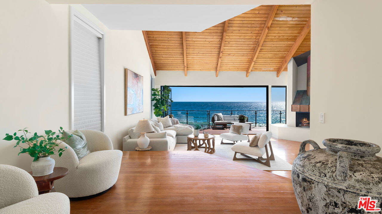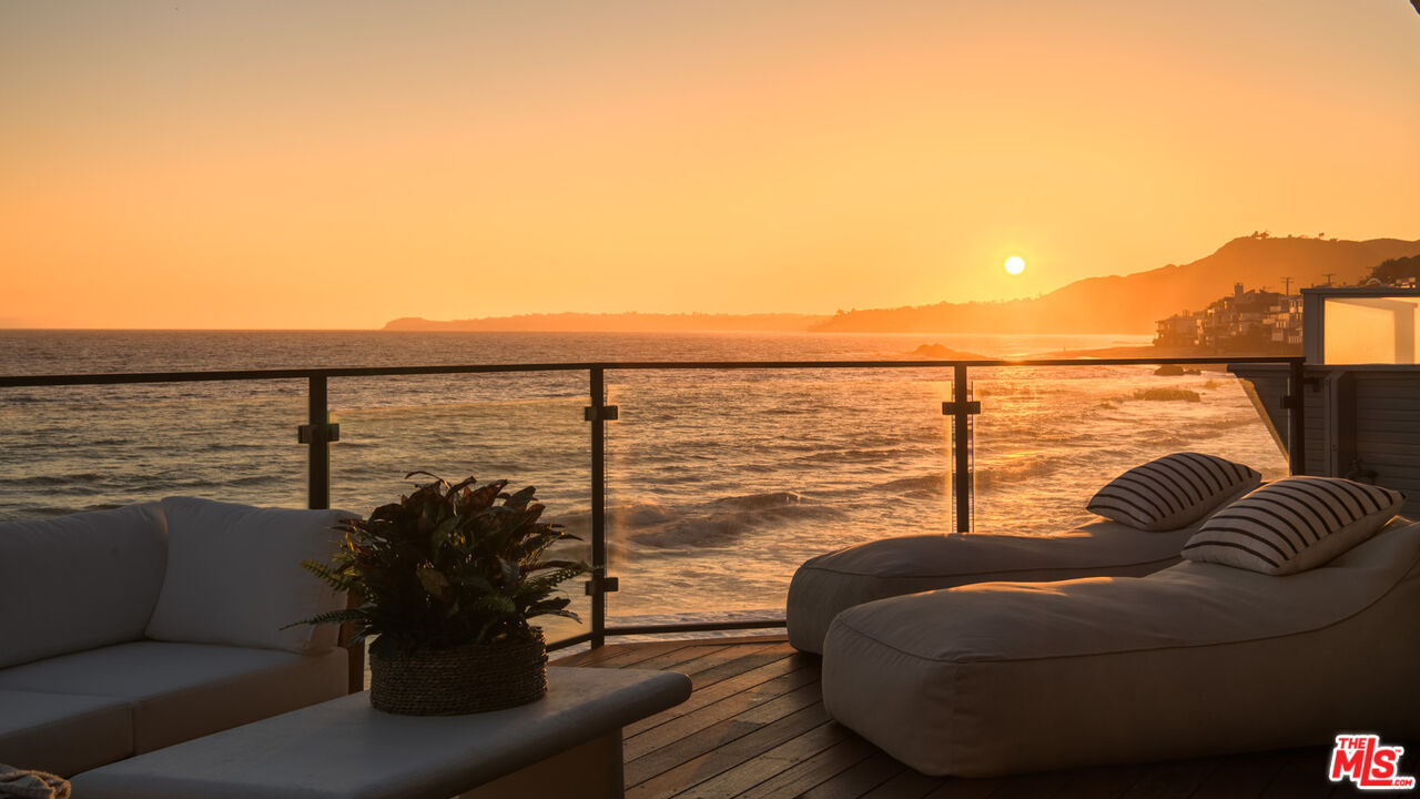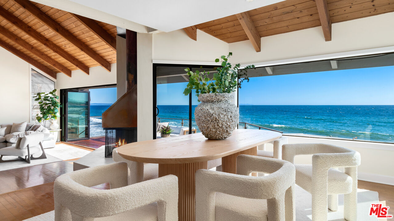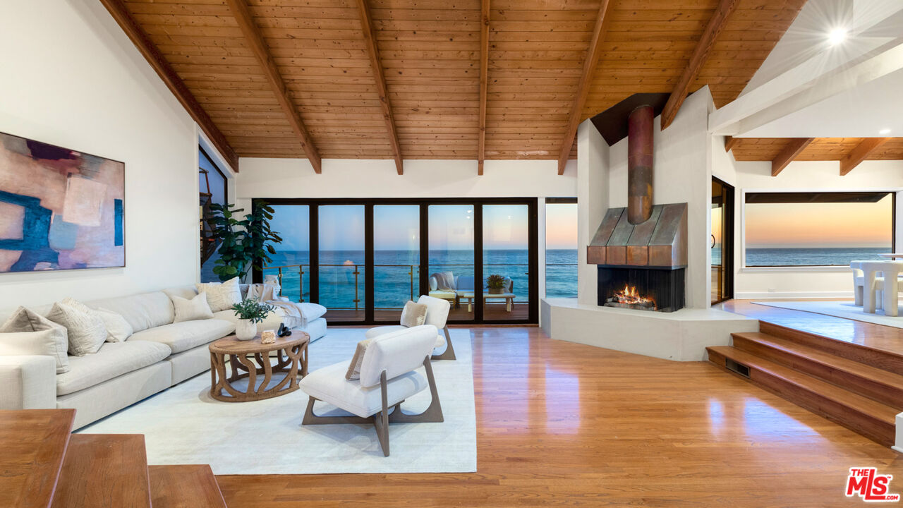 Step through the grand double-door entry into a sunlit foyer where sweeping ocean views unfold before you. Rich wood floors set a warm and inviting tone, while the natural beauty of the Pacific is immediately on display. To the left, a stylish powder room offers stone counters, a custom vanity, and a sleek sink, creating an ideal space for guests to refresh. Descending just a few steps, the home opens into a stunning sunken living room with soaring vaulted ceilings adorned with exposed wood beams and skylights that bathe the space in light. A striking fireplace creates a cozy focal point, while a sophisticated wet bar with granite counters, built-in cabinetry, and a bar sink elevates the space for entertaining. Accordion-style sliding glass doors dissolve the boundary between indoors and out, revealing an expansive oceanfront deck with glass railings. From here, panoramic coastline views stretch from the sands below to the distant skyline of Los Angeles. To the right of the foyer, the chef's kitchen impresses with a blend of modern amenities and timeless design. Recessed lighting highlights the wood floors, granite counters, and an illuminated stone backsplash. A six-burner Viking range with double ovens, a Viking hood fan, Subzero fridge and freezer, and Miele microwave make this kitchen fully equipped for culinary excellence. A large island with built-in storage and a prep sink anchors the space, complemented by a granite breakfast bar. The kitchen flows seamlessly into the formal dining area, where sliding glass doors open to a second deck, once again framing those incredible ocean vistas.Throughout the home, modern conveniences abound, including central air conditioning and heating, a tankless water heater, and direct access to the two-car garage.Upstairs, a skylight brightens the hallway leading to a spacious guest bedroom, where vaulted wood-beamed ceilings, a ceiling fan, and generous natural light create a peaceful retreat. This room includes a walk-in closet and an en suite bathroom with tile floors, a vanity, and a shower over tub. Across the hall, the primary suite offers luxurious comfort, complete with plush carpet flooring, stained glass accents, vaulted wood-beamed ceilings, and a gas fireplace. Sliding glass doors open to a private deck overlooking the ocean. The en suite bathroom features a built-in jetted tub, a spacious walk-in shower with dual showerheads, a private water closet, and an oversized walk-in closet, while an additional door conveniently accesses the garage level. The lower level reveals additional living space with wood floors, recessed lighting, and more ocean views. A secondary family room opens directly to another oceanfront deck. To the right, a bedroom with high ceilings and direct deck access features an en suite bath with wood floors, a mirrored closet, and a tiled shower. Another guest bedroom across the hall offers sliding glass doors to the deck, wood floors, recessed lighting, and mirrored closet doors. A Jack and Jill en suite bathroom, complete with stone counters, a vanity, and a tiled shower stall, connects the two rooms.Nearby, a laundry area with a stacked washer and dryer is tucked behind a sliding wood door and leads to a recreation space with a ping-pong table and additional storage with mirrored closets.For ultimate privacy, a separate guest suite completes the lower level, offering wood floors, a kitchenette, dining area, and sliding glass doors to a private ocean-view deck with beach access. The guest bedroom includes a mix of wood floors and soft carpeting, a walk-in closet, and an en suite bath with a walk-in shower and vanity. A dedicated elevator connects every level of this thoughtfully designed residence, where luxury meets comfort and spectacular coastal scenery surrounds you at every turn.Interested in this Listing?