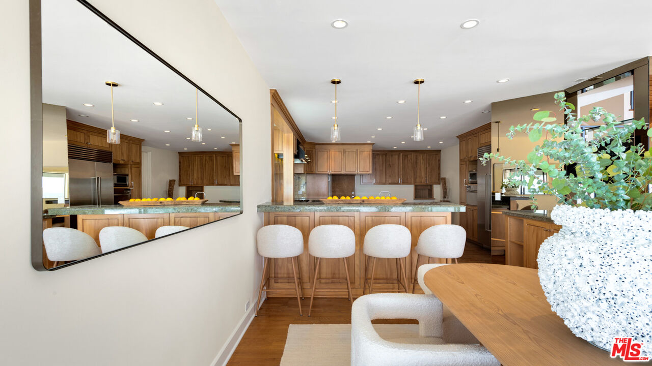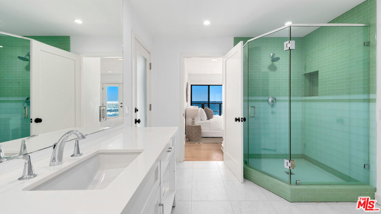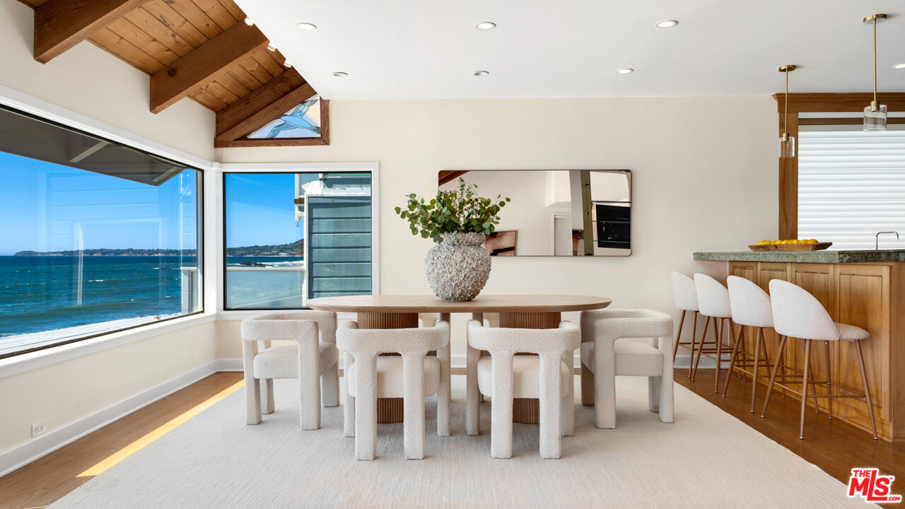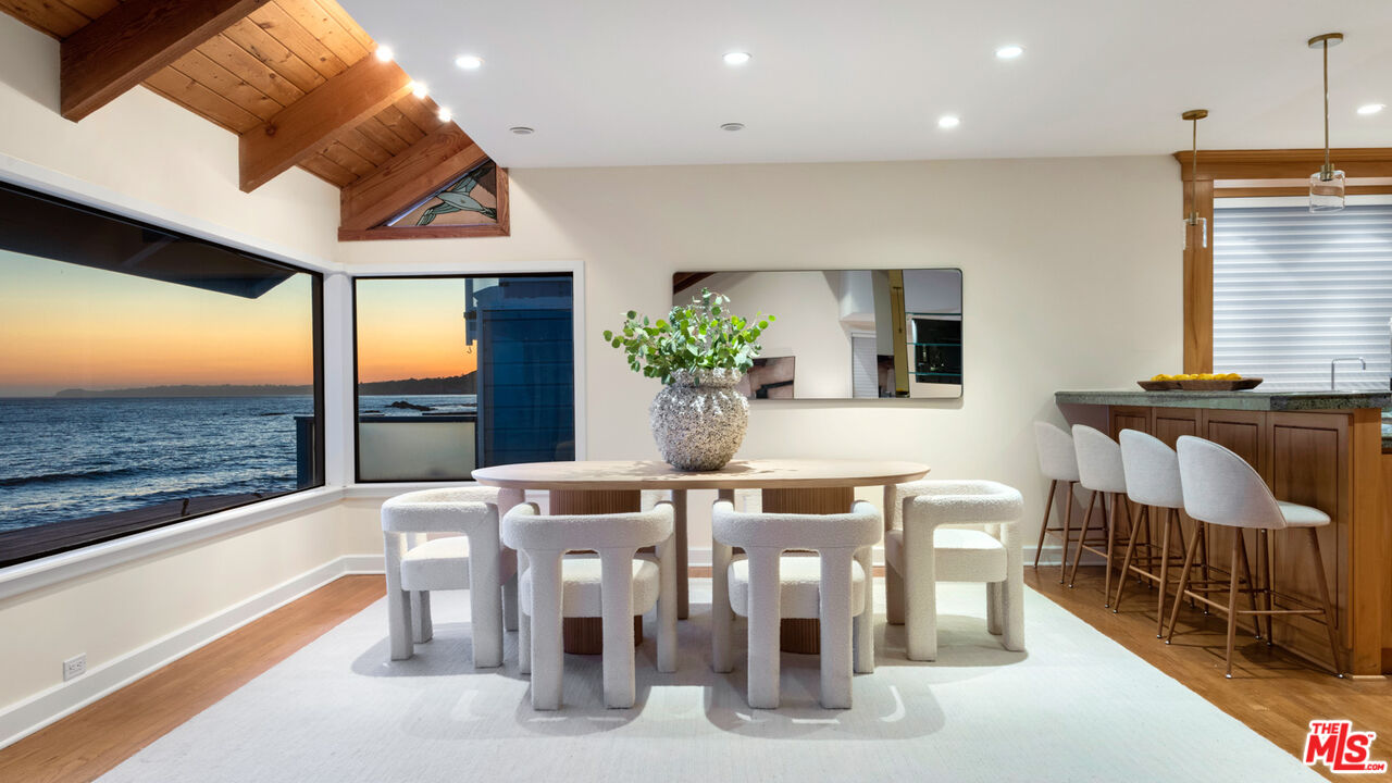 Step through the grand double-door entry into a sunlit foyer where sweeping ocean views unfold before you. Rich wood floors set a warm and inviting tone, while the natural beauty of the Pacific is immediately on display. To the left, a stylish powder room offers stone counters, a custom vanity, and a sleek sink, creating an ideal space for guests to refresh. Descending just a few steps, the home opens into a stunning sunken living room with soaring vaulted ceilings adorned with exposed wood beams and skylights that bathe the space in light. A striking fireplace creates a cozy focal point, while a sophisticated wet bar with granite counters, built-in cabinetry, and a bar sink elevates the space for entertaining. Accordion-style sliding glass doors dissolve the boundary between indoors and out, revealing an expansive oceanfront deck with glass railings. From here, panoramic coastline views stretch from the sands below to the distant skyline of Los Angeles. To the right of the foyer, the chef's kitchen impresses with a blend of modern amenities and timeless design. Recessed lighting highlights the wood floors, granite counters, and an illuminated stone backsplash. A six-burner Viking range with double ovens, a Viking hood fan, Subzero fridge and freezer, and Miele microwave make this kitchen fully equipped for culinary excellence. A large island with built-in storage and a prep sink anchors the space, complemented by a granite breakfast bar. The kitchen flows seamlessly into the formal dining area, where sliding glass doors open to a second deck, once again framing those incredible ocean vistas.Throughout the home, modern conveniences abound, including central air conditioning and heating, a tankless water heater, and direct access to the two-car garage.Upstairs, a skylight brightens the hallway leading to a spacious guest bedroom, where vaulted wood-beamed ceilings, a ceiling fan, and generous natural light create a peaceful retreat. This room includes a walk-in closet and an en suite bathroom with tile floors, a vanity, and a shower over tub. Across the hall, the primary suite offers luxurious comfort, complete with plush carpet flooring, stained glass accents, vaulted wood-beamed ceilings, and a gas fireplace. Sliding glass doors open to a private deck overlooking the ocean. The en suite bathroom features a built-in jetted tub, a spacious walk-in shower with dual showerheads, a private water closet, and an oversized walk-in closet, while an additional door conveniently accesses the garage level. The lower level reveals additional living space with wood floors, recessed lighting, and more ocean views. A secondary family room opens directly to another oceanfront deck. To the right, a bedroom with high ceilings and direct deck access features an en suite bath with wood floors, a mirrored closet, and a tiled shower. Another guest bedroom across the hall offers sliding glass doors to the deck, wood floors, recessed lighting, and mirrored closet doors. A Jack and Jill en suite bathroom, complete with stone counters, a vanity, and a tiled shower stall, connects the two rooms.Nearby, a laundry area with a stacked washer and dryer is tucked behind a sliding wood door and leads to a recreation space with a ping-pong table and additional storage with mirrored closets.For ultimate privacy, a separate guest suite completes the lower level, offering wood floors, a kitchenette, dining area, and sliding glass doors to a private ocean-view deck with beach access. The guest bedroom includes a mix of wood floors and soft carpeting, a walk-in closet, and an en suite bath with a walk-in shower and vanity. A dedicated elevator connects every level of this thoughtfully designed residence, where luxury meets comfort and spectacular coastal scenery surrounds you at every turn.Interested in this Listing?