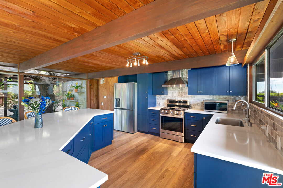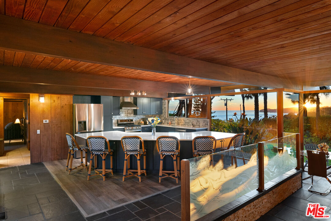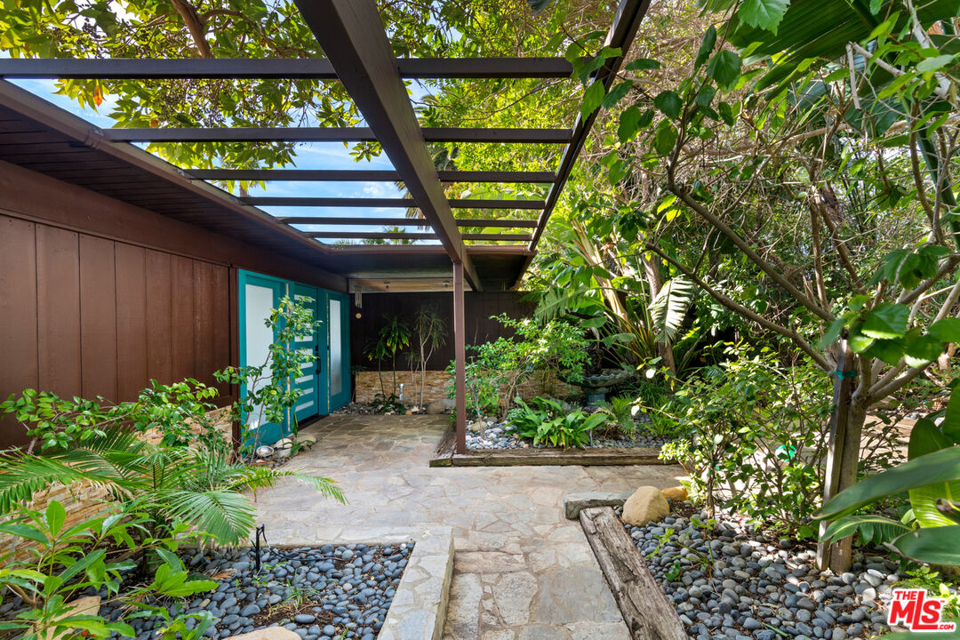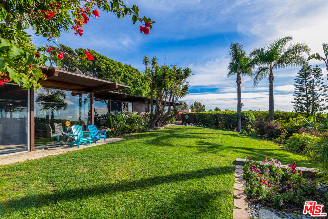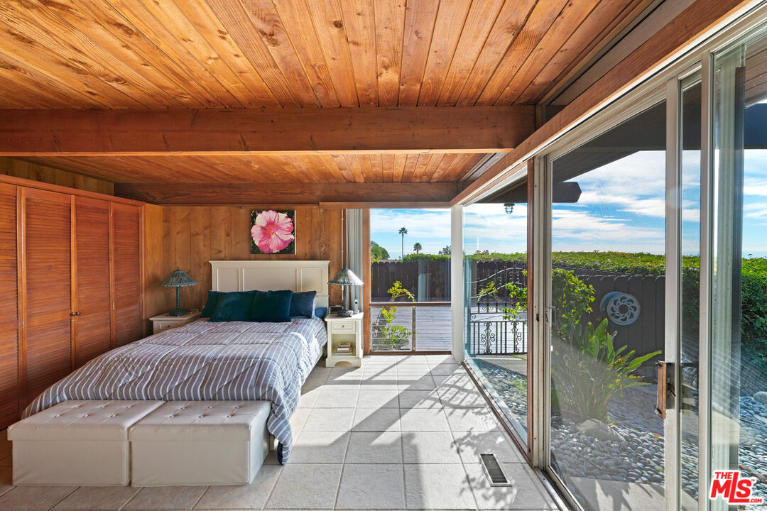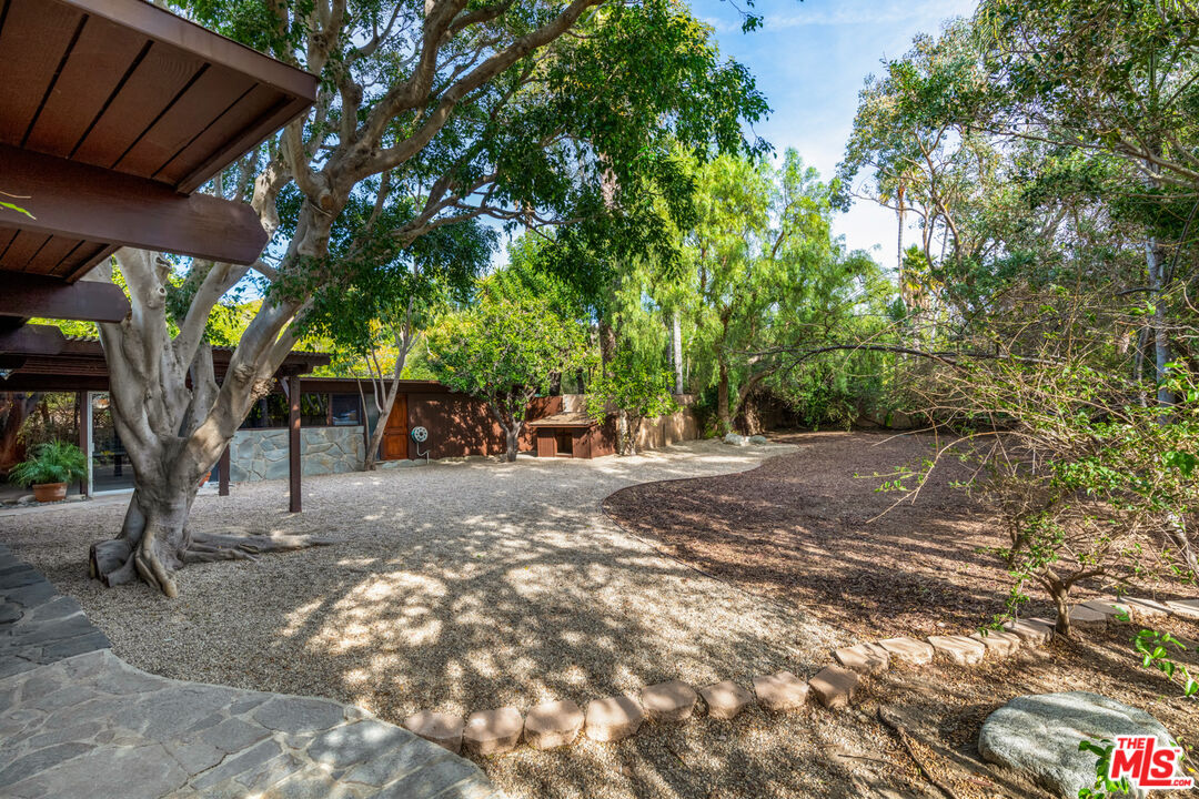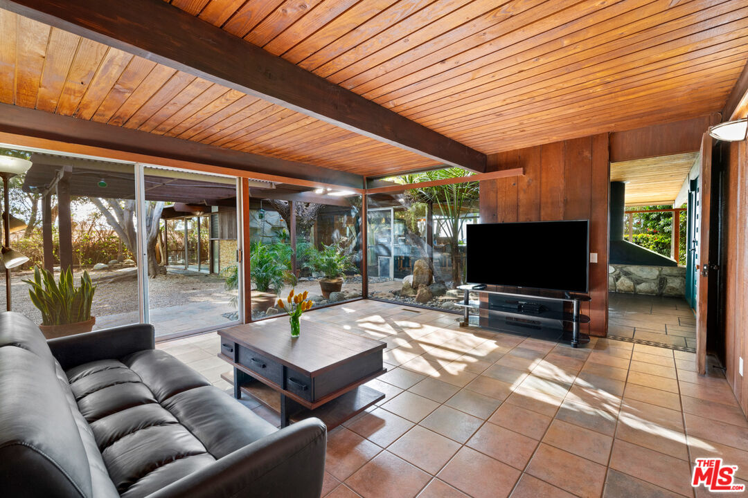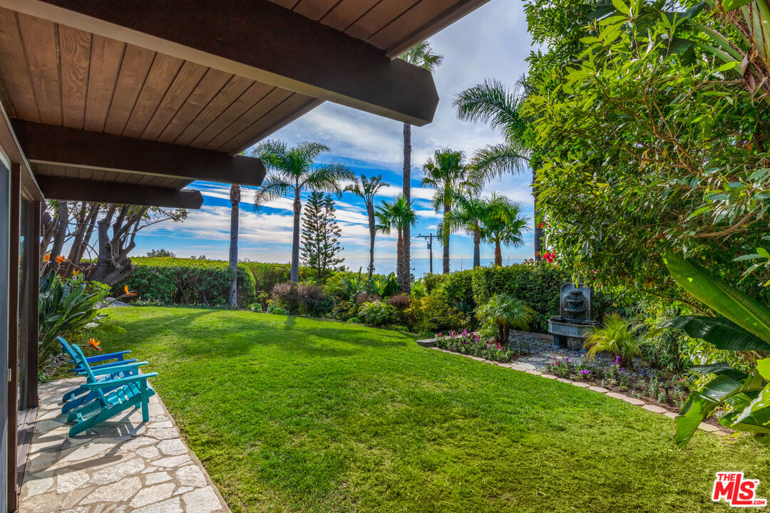 A mid-century masterpiece created by iconic Malibu architect Doug Rucker, this single-level Sycamore Park garden home blends exceptional privacy and majestic ocean and coastline views. Glass-wrapped rooms face onto private, lighted tropical gardens landscaped with palms, fruit trees, birds of paradise, bright bougainvillea, and multiple fountains. A picturesque central courtyard rock garden opens to the expansive backyard. In addition to wraparound glass, the interior detailing is classic mid-century: wood ceilings with massive beams and lustrous floors of black slate, flagstone, tile, and hardwood. The gated property of approximately 0.6 acre features a verdant front yard with a pergola-shaded porch and a wide, welcoming, glass-striped front door. Ocean views are on display immediately, the open layout flowing effortlessly from family/media room to sunken living room to kitchen. The living room features a large woodburning fireplace, a built-in sofa, and flagstone and black-slate floors. The ocean-view kitchen, newly updated with top-quality appliances, quartz countertops, and tile backsplash has a huge island with bar seating. Behind the family room is a bedroom/office with a powder room. Off the kitchen, a hallway leads to two more bedrooms, including the tranquil primary suite, complete with a brand-new skylight bath and wraparound glass walls opening to the backyard. The expansive grounds feature an enormous wood deck with a barbecue and room for dining plus areas with lawn, gravel, and covered patios for entertaining, recreation and, potentially, a pool. Views from the backyard highlight Point Dume, coastline, the ocean, and glorious sunsets. The home has a two-car garage with laundry facilities, plus room for ten vehicles in the driveway and additional street parking. With easy access to hiking trails and Escondido Beach, this wonderful Malibu retreat includes entry to the Sycamore Park Tennis Club.Interested in this Listing?