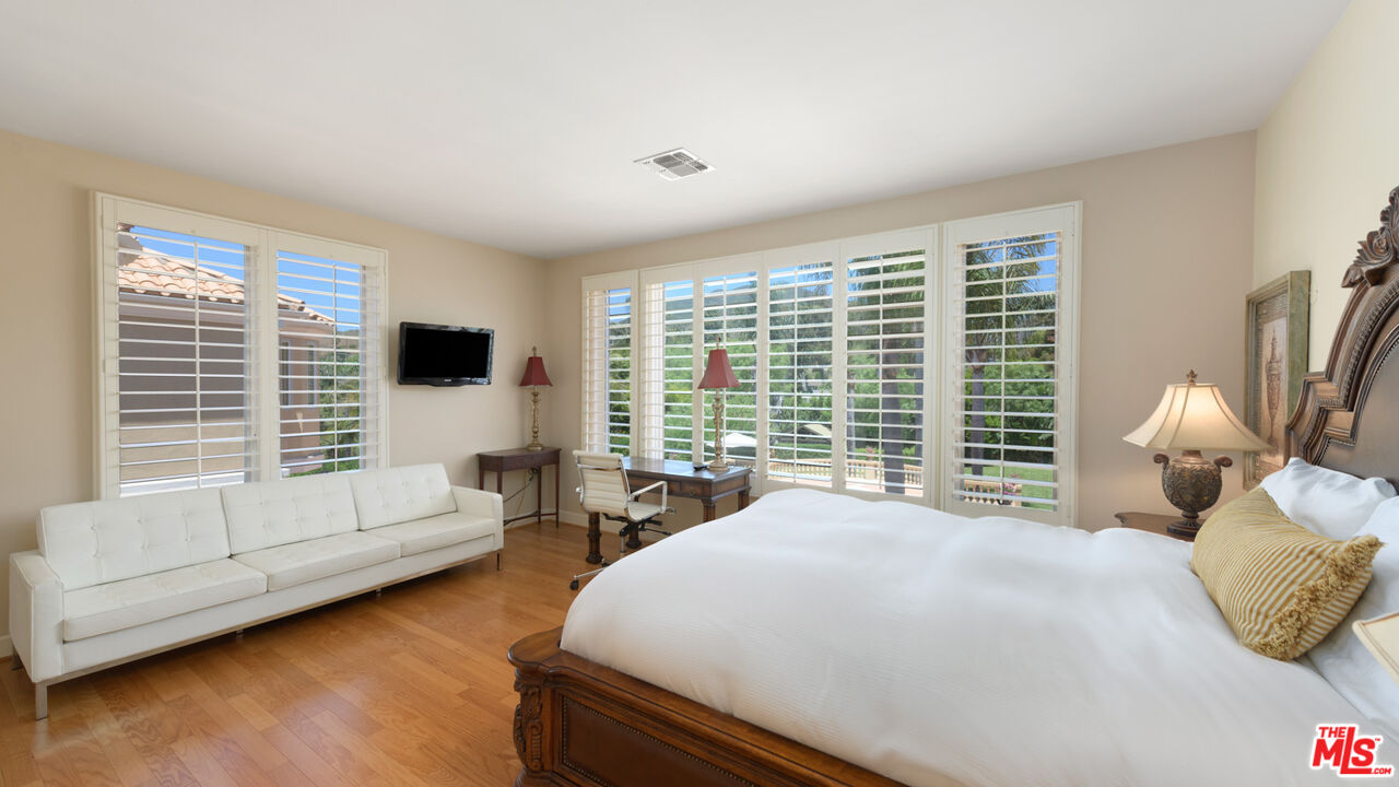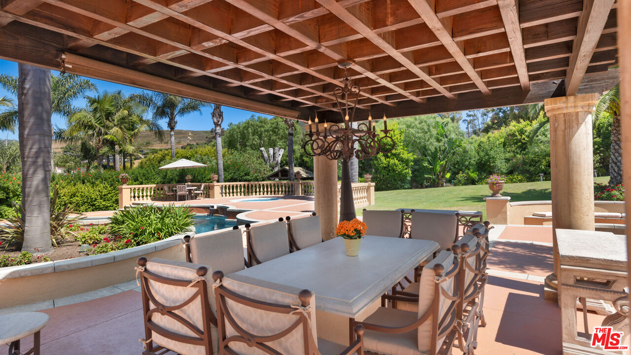Welcome to this stunning estate, an extraordinary residence that showcases an impressive array of luxurious amenities and exquisite details throughout, ensuring an unparalleled living experience in an elegant and sophisticated setting. The grand foyer greets you with a large chandelier and a two-story ceiling, complemented by elegant wood floors. Step down from the foyer to the formal living room, where you'll find stone tile floors, blackout curtains, wood beams, and a gas fireplace. This room offers backyard views and French doors leading to a covered patio with a chandelier and built-in heaters. Off the main hallway, a powder room awaits, adorned with fine art lamps, stone counters, and a stylish sink and vanity.The formal dining room features a chandelier, French doors to the backyard, pool views, and a bar area with built-ins, perfect for entertaining. The kitchen is a chef's dream, equipped with a butler's pantry, unpolished granite counters, stone tile floors, and high-end appliances, including a sub-zero fridge and freezer, a wine cellar, wine fridge, Bosch 5-burner range, oven, and microwave. Ample cabinet space, a Bosch dishwasher, a trash compactor, large pantry with built-ins provides even more storage. The breakfast area features wood floors and high coffered ceilings, bathing the space in natural light. Adjacent to the kitchen is the inviting living room, boasting wood floors, high vaulted ceilings with wood beams, built-in cabinets, and abundant natural light. A gas fireplace with a large mantle adds warmth and charm, while French doors open to the backyard. A piano can stay if the buyer choosesOn the main level, you'll find a large bedroom serving as a second primary suite, with high wood-beamed ceilings, stone tile floors, and French doors providing outdoor access. The en-suite bathroom includes a tub with jets, a shower stall, double sinks, a vanity, and a large closet. A hallway, with additional closet space, off the living room leads to another bedroom with wood floors and mirrored closet doors. The en-suite bathroom features tile floors, a shower over the tub, a sink, and a vanity. The laundry room at the end of the hallway is equipped with a large washer and dryer, built-ins, French windows, and a sink. The garage at the end of the hallway offers space for three cars and built-in cabinets.The stairs to the second floor have large windows providing pool views. On the second floor, the first bedroom features wood floors, mountain and pool views, high ceilings, an en-suite bathroom with stone counters, a shower over the tub, and a large closet with built-ins. A linen closet is conveniently located in the hall. Another bedroom on this level has wood floors, ocean views, high ceilings, and French doors to a balcony. The en-suite bathroom includes built-ins, a shower over the tub, and a large closet with built-ins. The owner's suite is a true retreat, with French doors, wood floors, a stone fireplace with a mantle, built-ins, high ceilings, ocean views, and room for a sitting area. Juliet balconies offer additional charm. The suite also includes a large closet with built-ins, an island, and glass and wood cabinets. The master bath is an oasis featuring ocean views, a makeup vanity, double sinks, a tub with jets, a shower stall with double shower heads, and two separate water closets, one with a bidet. The backyard is a paradise with a patio featuring fountains, a large pool with a waterfall feature, landscaped areas, mature trees and palms, a covered dining area with a chandelier, and screens for sun protection. Privacy hedges, a large built-in fire pit with a bench, and a built-in jacuzzi complete this outdoor haven. The front yard boasts a large lawn with a sprinkler system and a pedestrian gate leading to the side yard. Additional features of this home include three central AC units, prewiring for an alarm system, new water heater units, a circulation pump, a circular driveway, and space for eight cars in th
