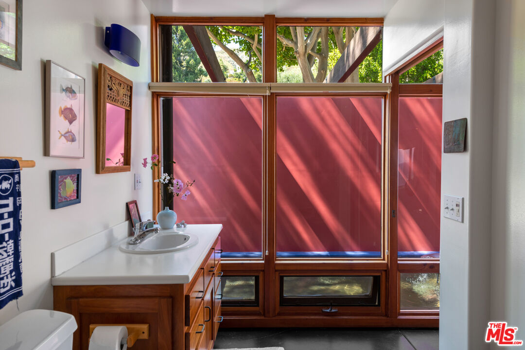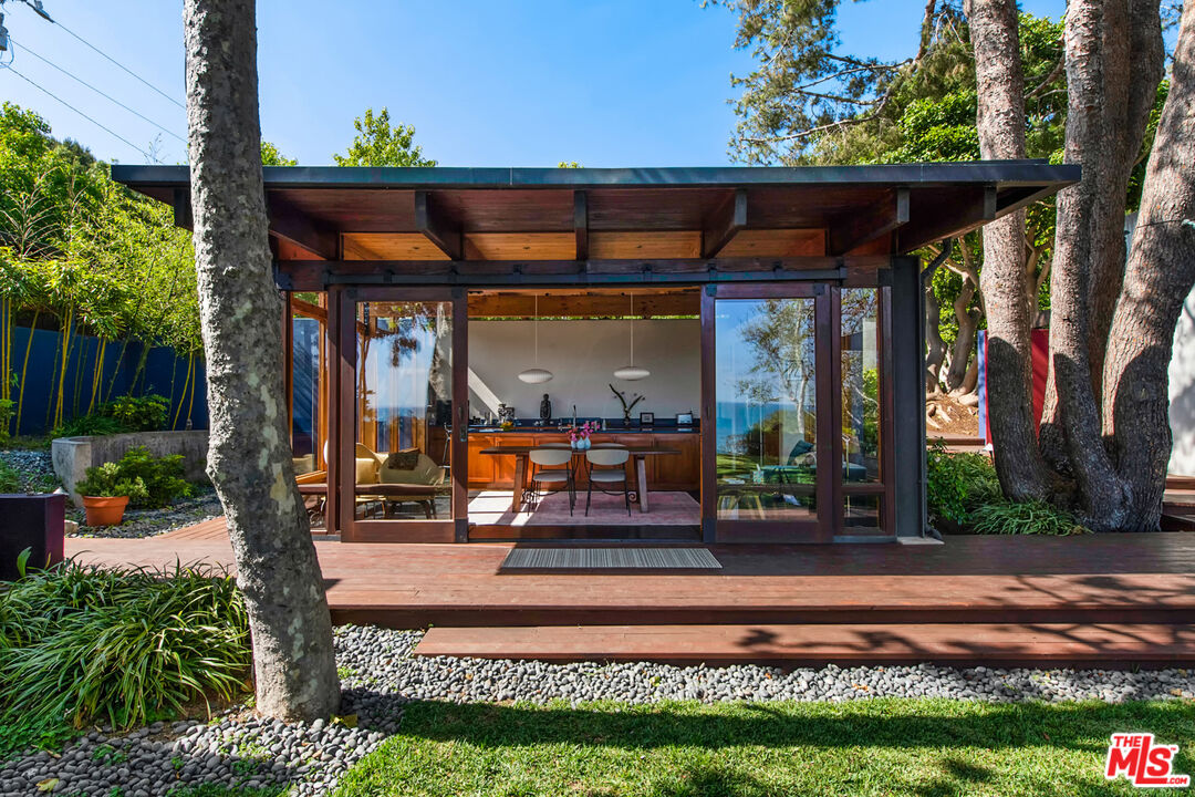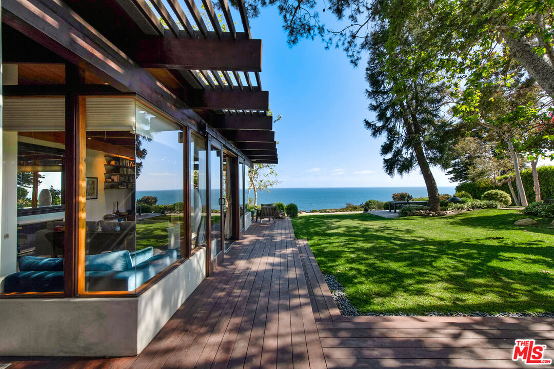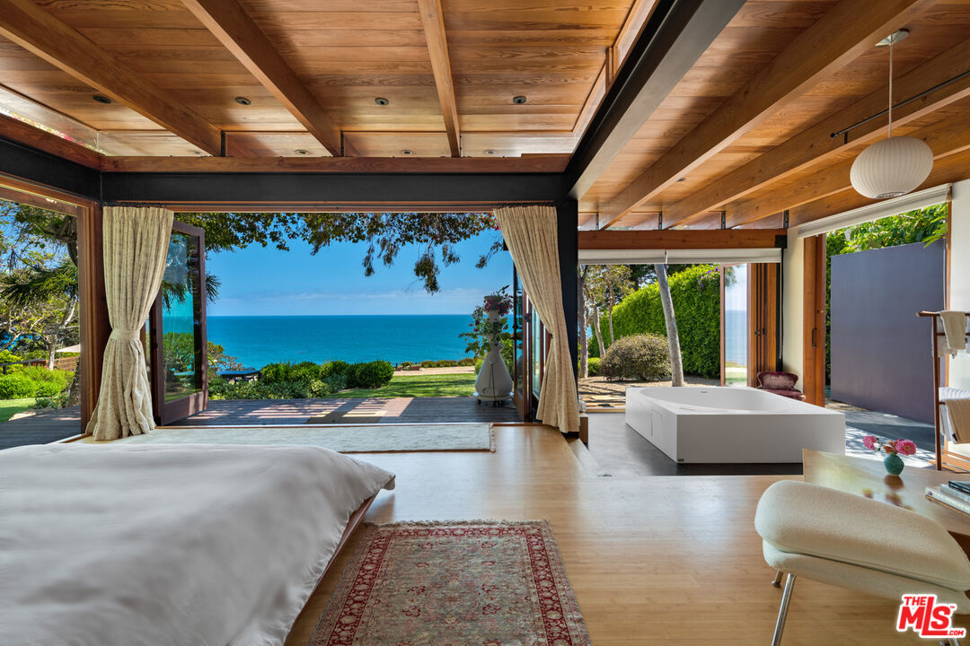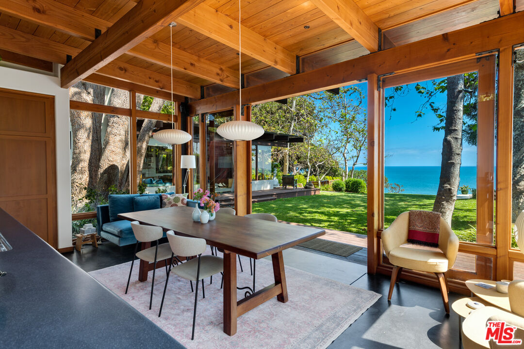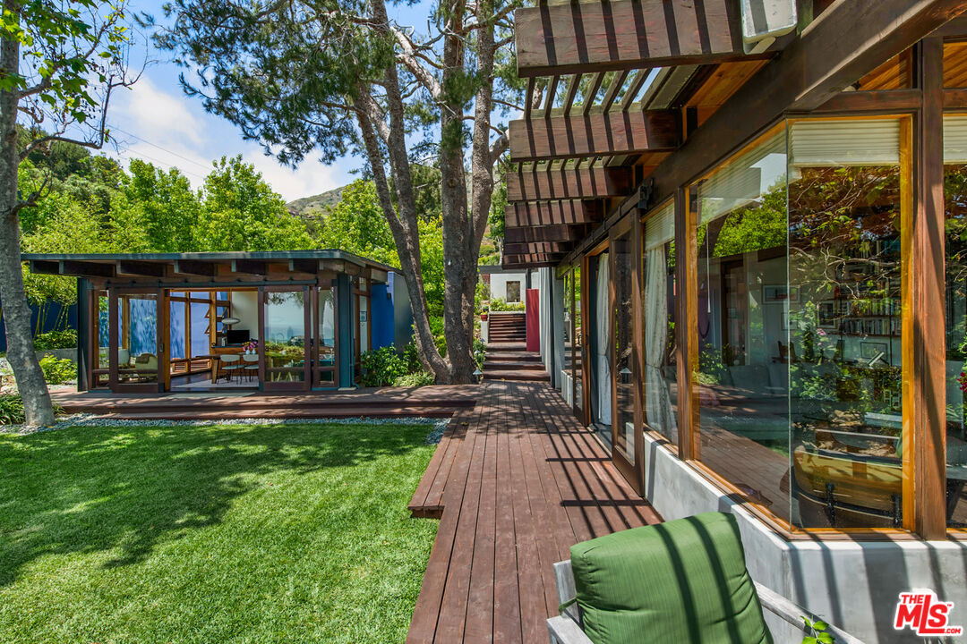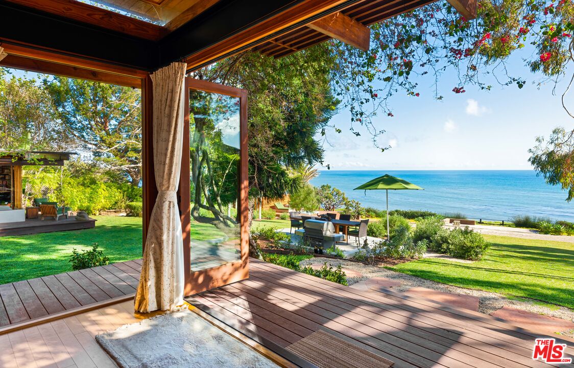 This picture-perfect Encinal Bluffs compound commands majestic ocean, island, and sunset views from over 1.84 acres of gorgeously landscaped grounds with driveway easement beach access. Absolutely unique and eminently liveable, the property is designed in five separate modules. These share their modernist architectural styling and generous outdoor areas, providing ideal settings for day and evening recreation, intimate soirees, and grand entertaining. The pavilion-style modules feature beautiful plank and beam wood ceilings, wraparound walls of glass, clerestory windows, and wide doorways onto pergola-shaded decks, patios, lawns, and sensational views. Each structure is complete in itself, with abundant privacy and easy access to the nearby modules. The exceptionally comfortable ocean-view living room has high ceilings, walls of glass on three sides, built-in bookshelves, a fireplace, a powder room, and a wraparound deck with room for outdoor seating. The deck continues around a large lawn to the kitchen/dining structure. The chef's kitchen is an entertainer's delight, with ocean views, a large island, top-quality appliances, and a Zen-style garden to one side. The deck continues up a few steps to the amazing primary suite, which features beautiful wood floors, a sitting area, a built-in office area, and a spa-worthy bath with an outdoor shower. Full-width doorways in the bedroom and bathroom both open fully to the exceptionally private backyard. There are two additional structures. One is a two-bedroom guest bungalow, each bedroom with its own sitting area and built-in desk, plus wide doors onto a wraparound deck that overlooks lawn, garden, and a large reflecting pool. The other structure is a spacious office/art studio. The backyard offers numerous options for lounging, recreation, and entertaining, including a dining and barbecue patio, a sundeck with a hot tub, and a blufftop deck positioned for round-the-clock enjoyment of the ever-changing sea and sky.Interested in this Listing?
