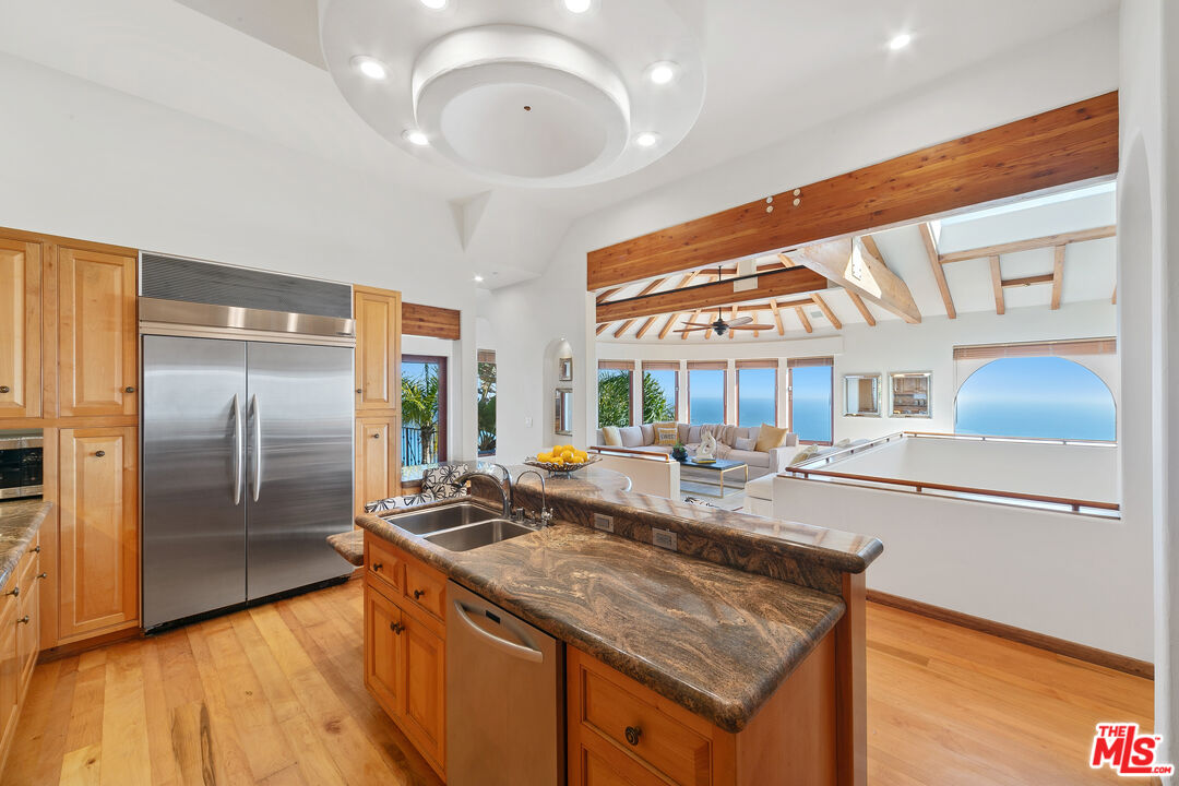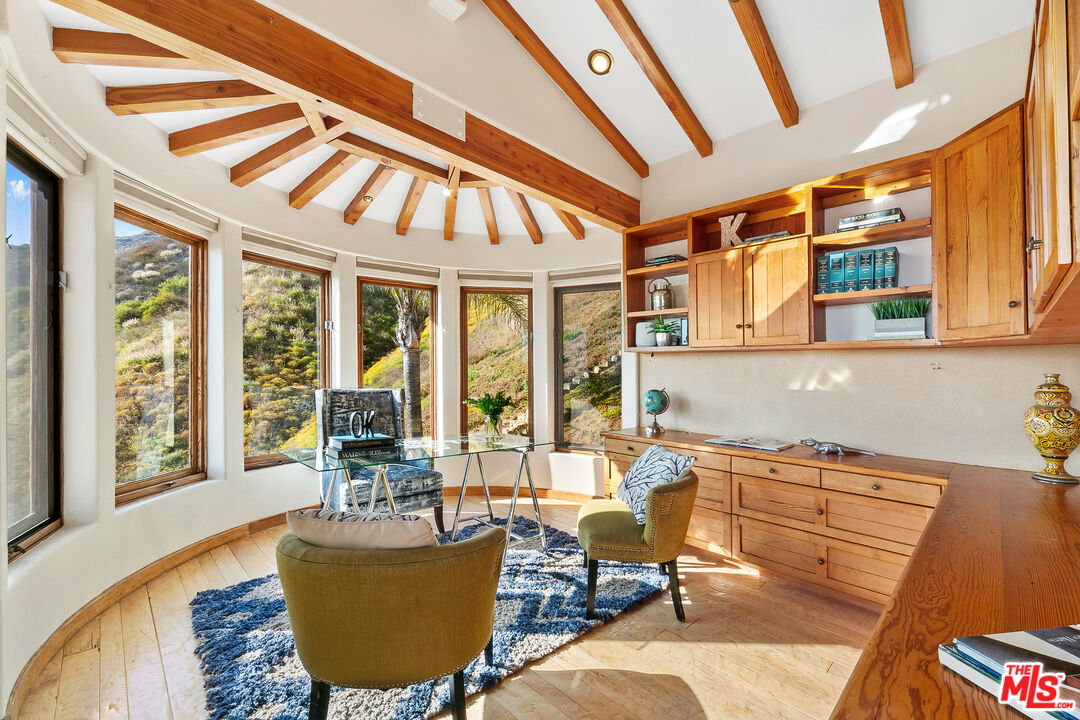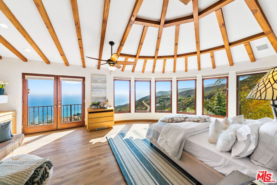 Sensational Mediterranean Villa with charming detached guest house. Offering some of the best panoramic ocean views in all of Malibu. Located on a quiet cul-de-sac street in serene western Malibu. Conveniently close to local schools, beaches and the gourmet Vintage Market. This custom built home is gated, private and secure. It features a comfortable living room with tall beamed ceilings, hard wood floors and walls of glass letting in natural sunlight and beautiful ocean views. There is a gourmet kitchen with semicircular island, custom lighting, and high end appliances. The kitchen is open to an adjacent family room and also opens out to a trellised covered deck - perfect for barbecuing, al fresco dining or just relaxing and watching the sun set into the sea. There is a generous primary suite with curved windows, spectacular views and its own private deck. Plus three additional guest/kid's rooms. Separate from the main living quarters are a private office and studio guest apartment. Across the drive is a fully equipped detached guest house with its own ocean view deck. The property has ample parking and offers a variety of charming features like hand painted tiles, lush tropical landscaping, and hand laid stone pathways. It is designed to be fire safe with its own water storage tank, hydrant, sprinkler system and more. All perfectly suited for a safe and secure live and work at home Malibu lifestyle! Also available for lease at $30k month.Interested in this Listing?