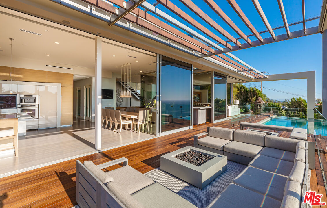 Experience breathtaking ocean and canyon views from this stunning modern masterpiece, designed by renowned architect Stephen Kanner. This 5-bedroom, 5.5-bath estate boasts soaring ceilings, exquisite cumaru wood and marble flooring, and seamless walls of disappearing glass that open to an expansive Ipe wood terrace. Enjoy the ultimate indoor-outdoor lifestyle with a spectacular infinity pool and spa overlooking the coastline. The dramatic floor plan features grand living spaces and a show-stopping Pedini professional kitchen, serving as the heart of the home. A spacious lower-level media room, and a speakeasy bar area, offers the perfect setting for entertainment. The luxurious primary suite is a private retreat, complete with a spa-inspired bath, two large closets, and a private ocean-view terrace. Three additional en-suite bedrooms, a housekeeper's quarters, and an oversized two-car garage provide ample space and convenience. Gated, private, and equipped with an advanced security system, this custom-designed home captures the essence of Malibu's coastal luxury.Interested in this Listing?