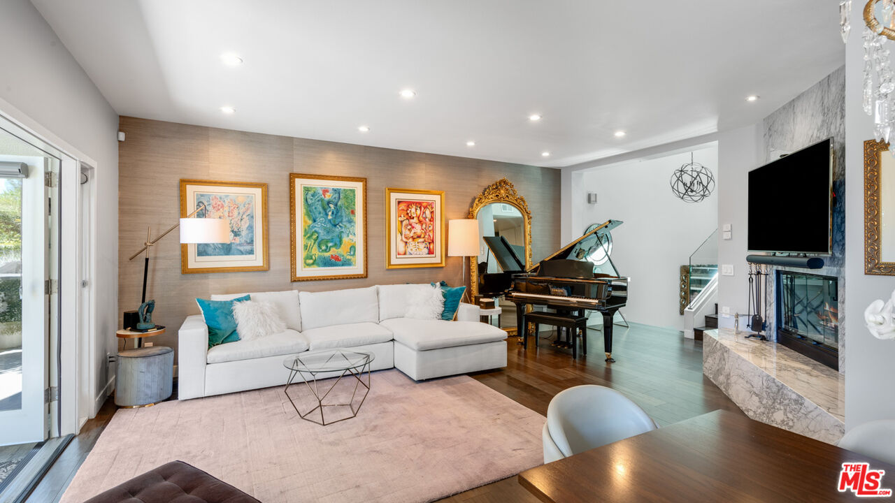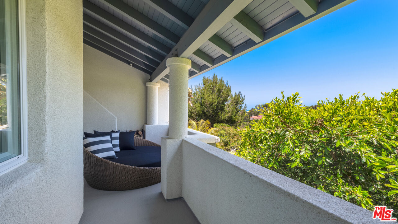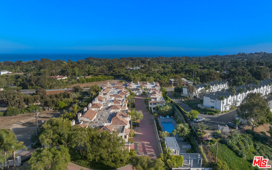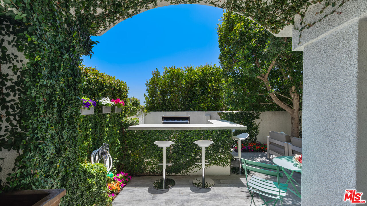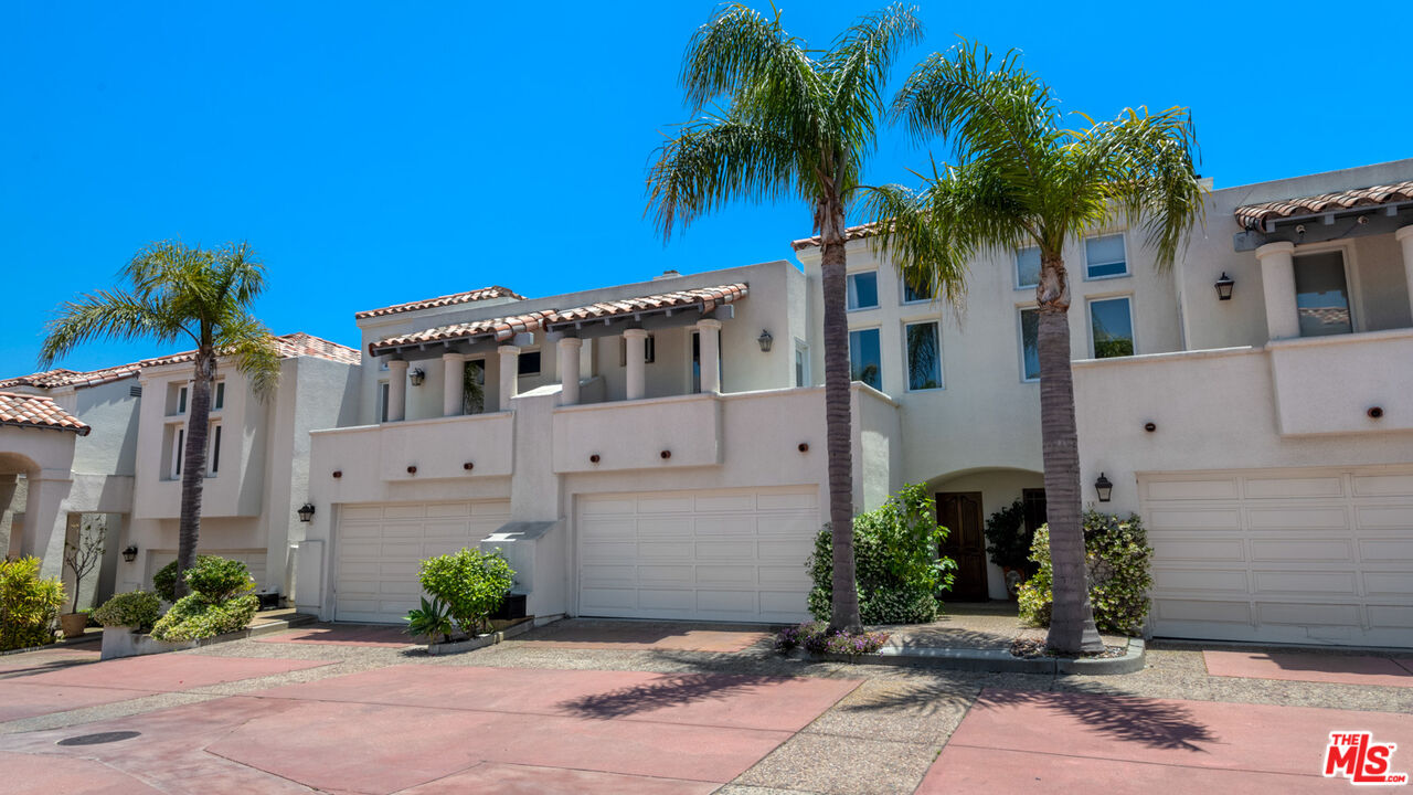 With its statuesque palms, gated archway entry, and private garden, this elegant Portico townhome offers cosmopolitan sophistication in a bright, Mediterranean setting. Exceptional detailing, such as hardwood floors, gorgeous Carrara marble countertops, and custom lighting suggest sparkling gatherings and and memorable evenings in the beautiful living areas and garden patio. Chandeliers and solar-powered skylights illuminate the entry hall, where there is a powder room and access to the laundry room and garage. The living/dining great room, a half-flight up, is a tranquil space, with a marble-hearth fireplace, built-in glass shelving, and French doors that open onto the entertainer's patio, where there is a pair of fountains and a barbecue bar, as well as seating around a fire table. Adjoining the dining area is the beautiful, top-quality kitchen, with more glass shelves, marble countertops, fine tile work, and generous custom cabinetry. One flight up is an en-suite bedroom with high, chandelier ceilings, built-in cupboards and desk, walk-in closet, marble bath with herringbone tile floor, and a wraparound sun porch. On the top floor is the primary suite, which has vaulted ceilings with 18-foot-high windows, a beautiful wall treatment, soffit lighting, another marble fireplace, a walk-in closet with impressive built-ins, and a marble and tile bath with a double sink and vanity. A door from the suite opens onto a covered porch, with Catalina and peek-a-boo ocean views and room for lounging. The unit has a two-car garage with generous storage, central air conditioning, security system, and drip irrigation in the patio garden. The much-admired Portico community, convenient to Point Dume Village and nearby beaches, has a large, gated and heated pool, and sauna, plus an outdoor kitchen and bar area and a spacious dining pavilion.Interested in this Listing?