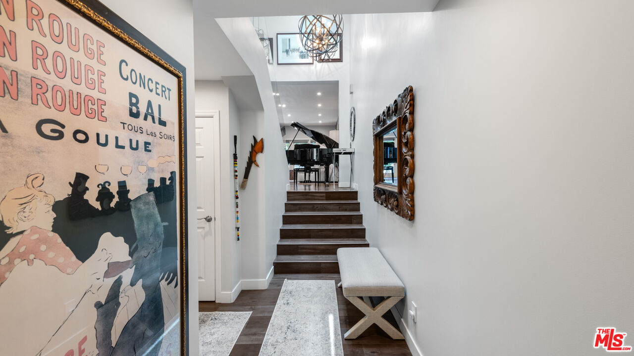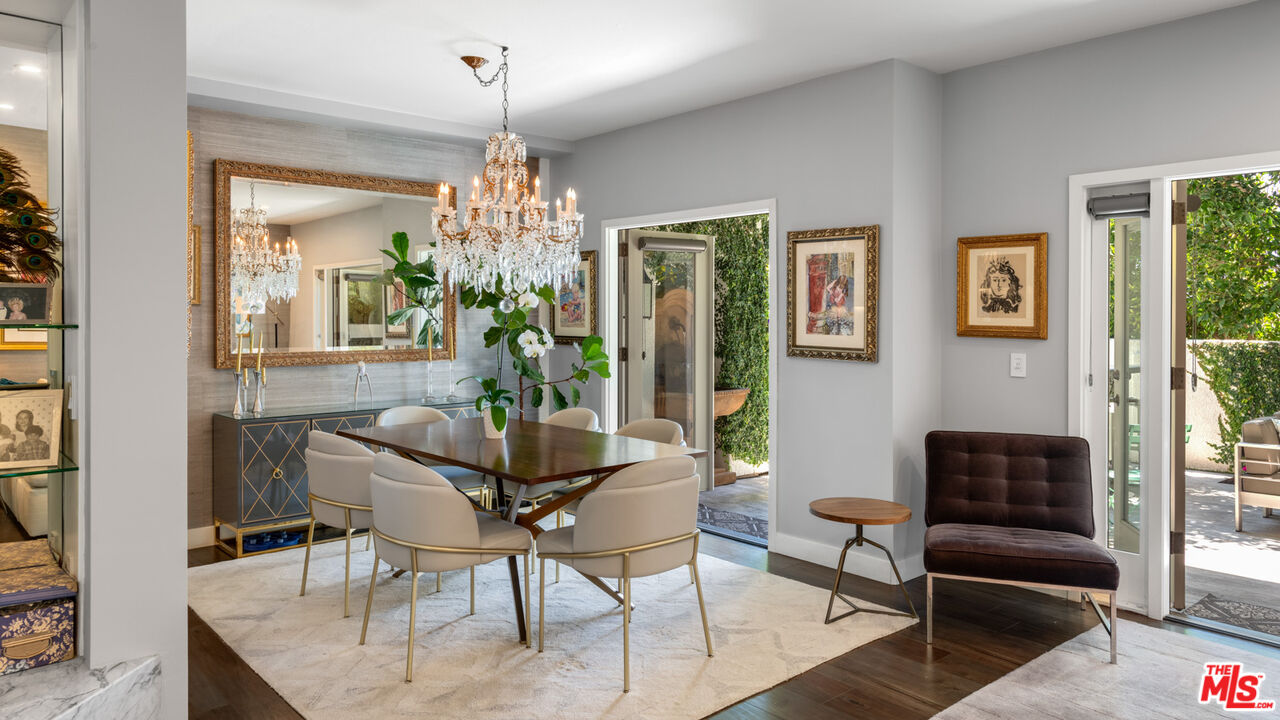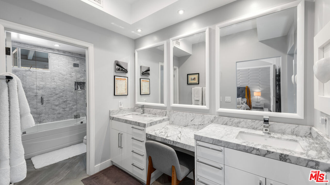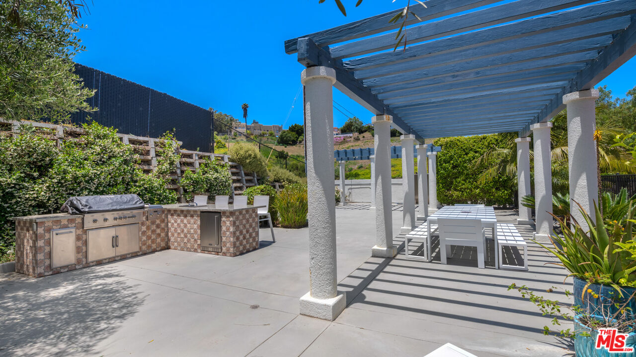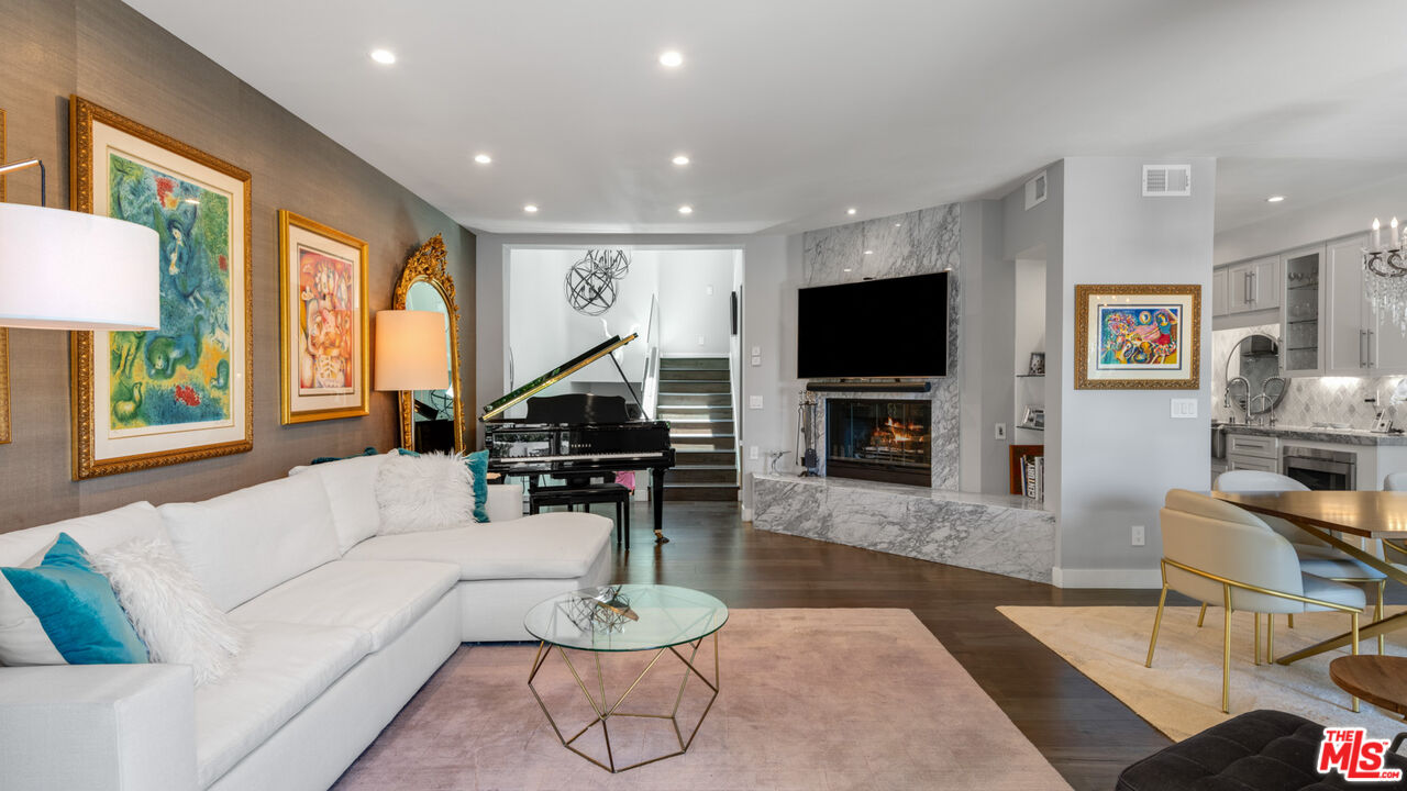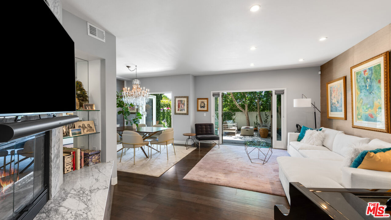 With its statuesque palms, gated archway entry, and private garden, this elegant Portico townhome offers cosmopolitan sophistication in a bright, Mediterranean setting. Exceptional detailing, such as hardwood floors, gorgeous Carrara marble countertops, and custom lighting suggest sparkling gatherings and and memorable evenings in the beautiful living areas and garden patio. Chandeliers and solar-powered skylights illuminate the entry hall, where there is a powder room and access to the laundry room and garage. The living/dining great room, a half-flight up, is a tranquil space, with a marble-hearth fireplace, built-in glass shelving, and French doors that open onto the entertainer's patio, where there is a pair of fountains and a barbecue bar, as well as seating around a fire table. Adjoining the dining area is the beautiful, top-quality kitchen, with more glass shelves, marble countertops, fine tile work, and generous custom cabinetry. One flight up is an en-suite bedroom with high, chandelier ceilings, built-in cupboards and desk, walk-in closet, marble bath with herringbone tile floor, and a wraparound sun porch. On the top floor is the primary suite, which has vaulted ceilings with 18-foot-high windows, a beautiful wall treatment, soffit lighting, another marble fireplace, a walk-in closet with impressive built-ins, and a marble and tile bath with a double sink and vanity. A door from the suite opens onto a covered porch, with Catalina and peek-a-boo ocean views and room for lounging. The unit has a two-car garage with generous storage, central air conditioning, security system, and drip irrigation in the patio garden. The much-admired Portico community, convenient to Point Dume Village and nearby beaches, has a large, gated and heated pool, and sauna, plus an outdoor kitchen and bar area and a spacious dining pavilion.Interested in this Listing?