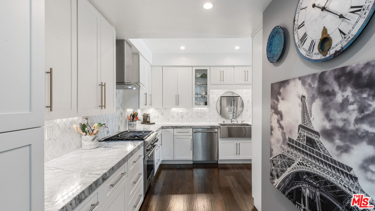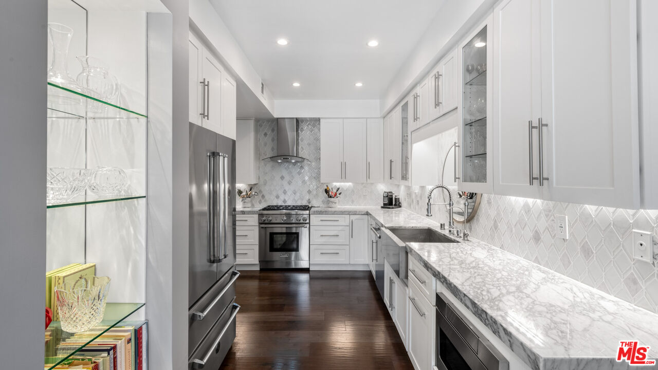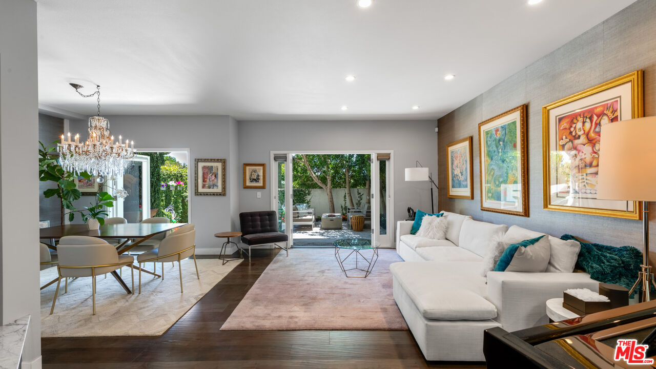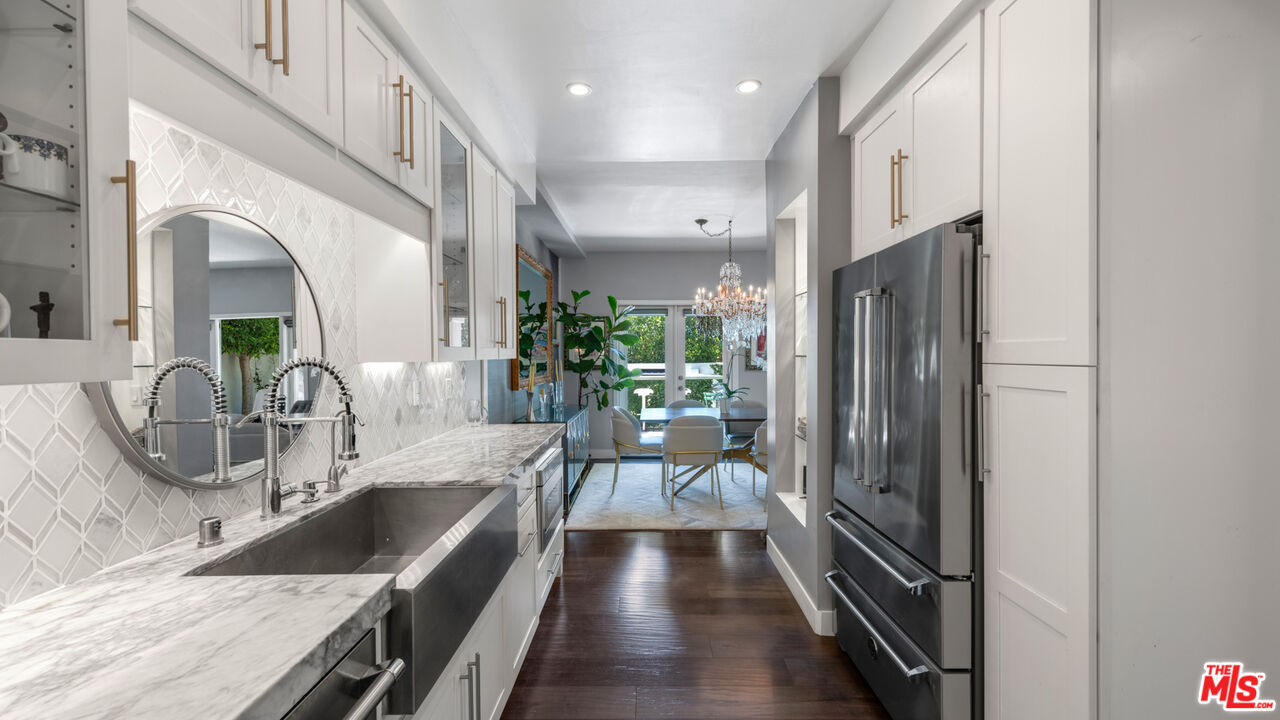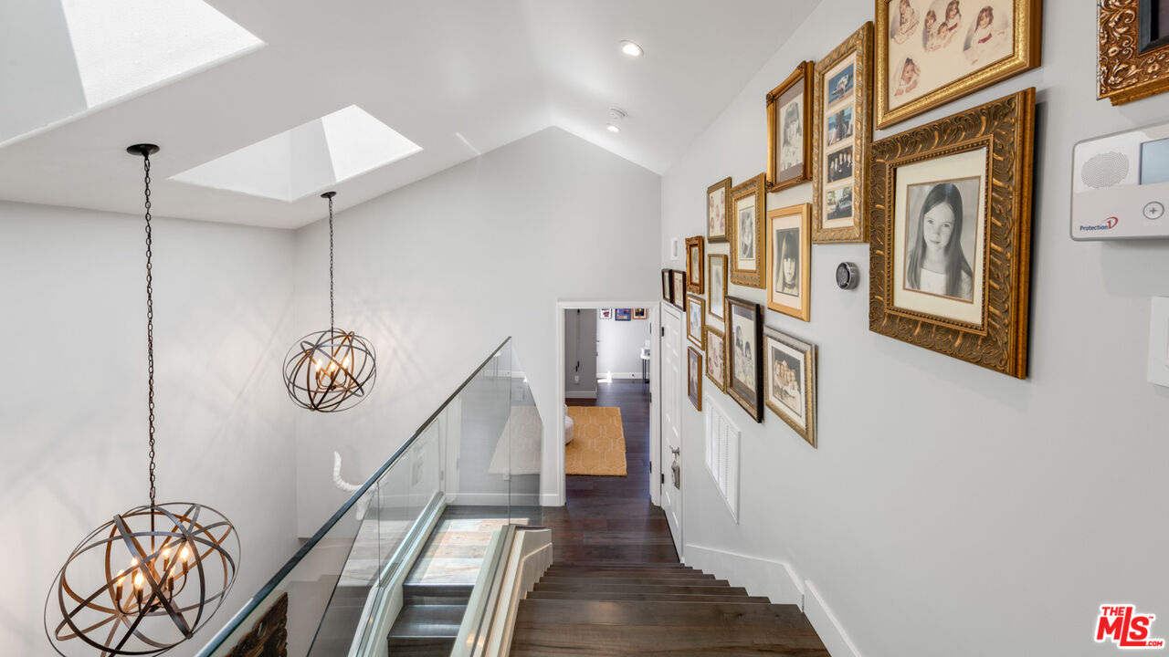 With its statuesque palms, gated archway entry, and private garden, this elegant Portico townhome offers cosmopolitan sophistication in a bright, Mediterranean setting. Exceptional detailing, such as hardwood floors, gorgeous Carrara marble countertops, and custom lighting suggest sparkling gatherings and and memorable evenings in the beautiful living areas and garden patio. Chandeliers and solar-powered skylights illuminate the entry hall, where there is a powder room and access to the laundry room and garage. The living/dining great room, a half-flight up, is a tranquil space, with a marble-hearth fireplace, built-in glass shelving, and French doors that open onto the entertainer's patio, where there is a pair of fountains and a barbecue bar, as well as seating around a fire table. Adjoining the dining area is the beautiful, top-quality kitchen, with more glass shelves, marble countertops, fine tile work, and generous custom cabinetry. One flight up is an en-suite bedroom with high, chandelier ceilings, built-in cupboards and desk, walk-in closet, marble bath with herringbone tile floor, and a wraparound sun porch. On the top floor is the primary suite, which has vaulted ceilings with 18-foot-high windows, a beautiful wall treatment, soffit lighting, another marble fireplace, a walk-in closet with impressive built-ins, and a marble and tile bath with a double sink and vanity. A door from the suite opens onto a covered porch, with Catalina and peek-a-boo ocean views and room for lounging. The unit has a two-car garage with generous storage, central air conditioning, security system, and drip irrigation in the patio garden. The much-admired Portico community, convenient to Point Dume Village and nearby beaches, has a large, gated and heated pool, and sauna, plus an outdoor kitchen and bar area and a spacious dining pavilion.Interested in this Listing?