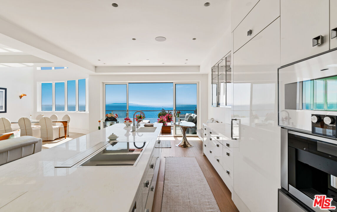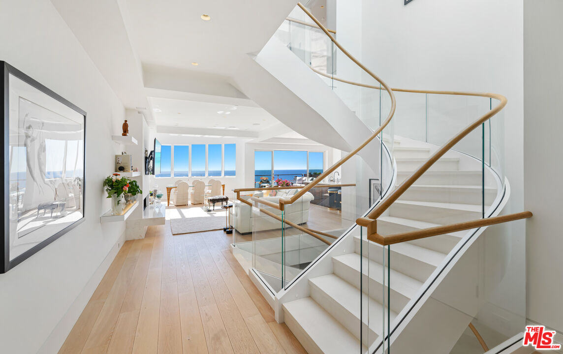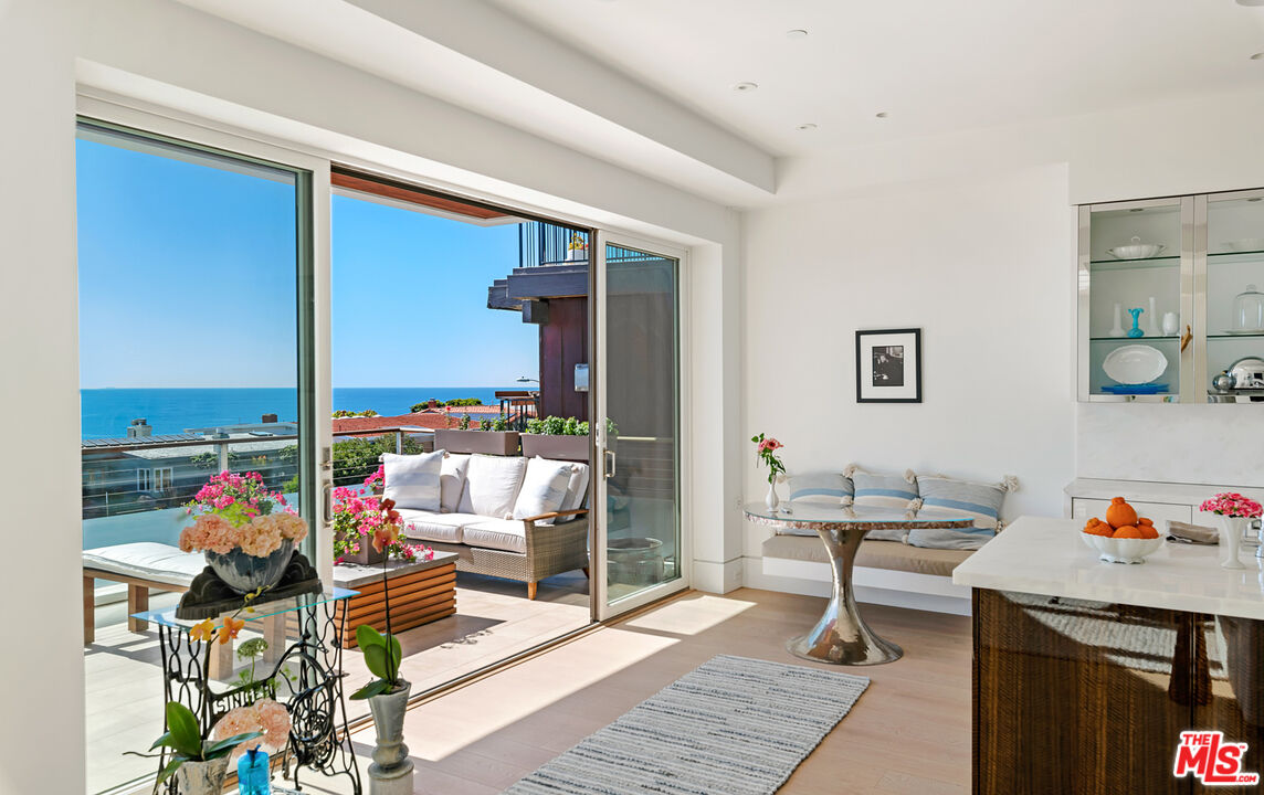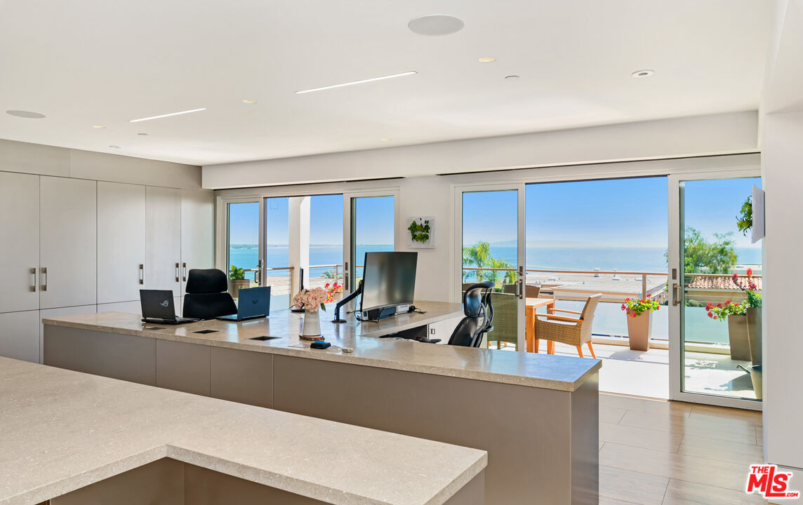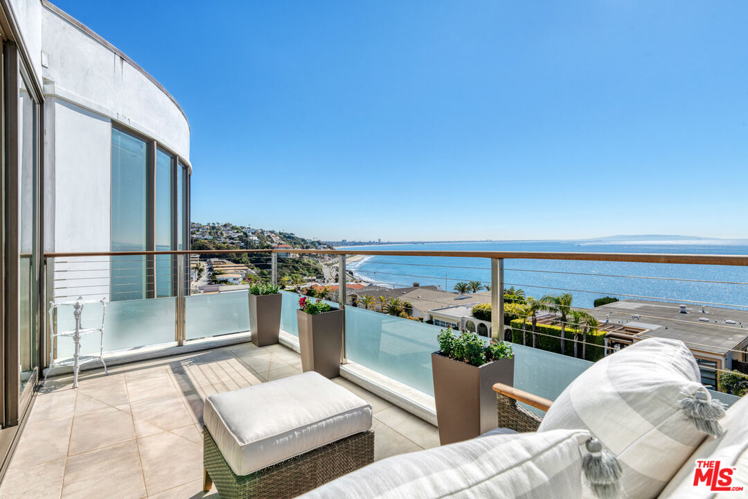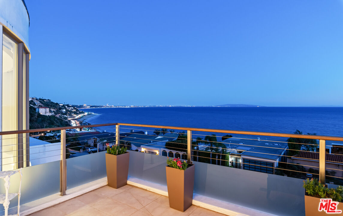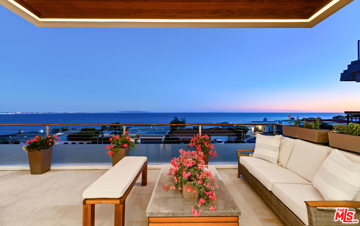 On the market for the first time, this open and airy contemporary residence is a study in dramatic lines and breathtaking 180 ocean views. One-half of a new duplex, with three balconies and a private commercial elevator serving all levels, the home is exquisitely finished with European white oak throughout, exceptionally high ceilings, and walls of glass to take in the full sweep of the Queen's necklace, Palos Verdes, Catalina, and the ever-changing ocean panorama from sunrise to sunset. On the entry-level is a large foyer, where one wall features an illuminated Brazilian gemstone display. Also on this level is a full bath, a mud room with storage closets, a huge laundry room with a dog-washing station, and access to the three-car garage, where there is additional storage. Up one floor, by way of the elevator or the handsome limestone stairs, the central space is wide and open, currently used as an office, complete with a separate entry. With travertine floors, a powder room, a separate office/bonus room, a kitchenette, and a bedroom, this level has a covered balcony with sensational views and ample room for dining and socializing. The spectacular custom spiral staircase begins on this level, with curved glass panels, bent wood rail, stair lights, and overhead, a 9-foot by 12-foot retractable glass roof/skylight that opens fully.One floor up, the home's main living area is a spacious ocean-view living/dining/kitchen great room with a wide balcony for al fresco dining, lounging, and entertaining. The living area has high, tray ceilings with recessed lighting, illuminated display shelving, and a striking quartzite fireplace. The dining area, with double-height ceilings, is flanked by two stories of bow windows. The kitchen is designed to a chef's requirements, with a huge quartzite island and countertops, bar seating, top-of-the-line appliances, museum-glass cabinets, breakfast nook, and walk-in pantry. Also on this level is a powder room with Calacatta Gold marble floor-to-ceiling wall and an en-suite guest bedroom with a separate entrance. On the top floor, the spiral staircase opens onto a roomy loft-style mezzanine and, beyond that, the primary suite. This stunning sanctuary features a dual tray ceiling with dimensional plasterwork and soffit lighting, oak floors, dual custom closets, dual spa-style baths, and a private lounging balcony with spectacular views. Among the home's many additional amenities are three-zone air conditioning, heated bathroom floors, remote-controlled shades, a private fragrant rose garden, an enclosed yard at the back, and smart-home systems throughout. With the easy access of Sunset Mesa and the expansive views of coastal living, this elegant modern residence is designed for lively entertaining and non-stop comfort.Interested in this Listing?
